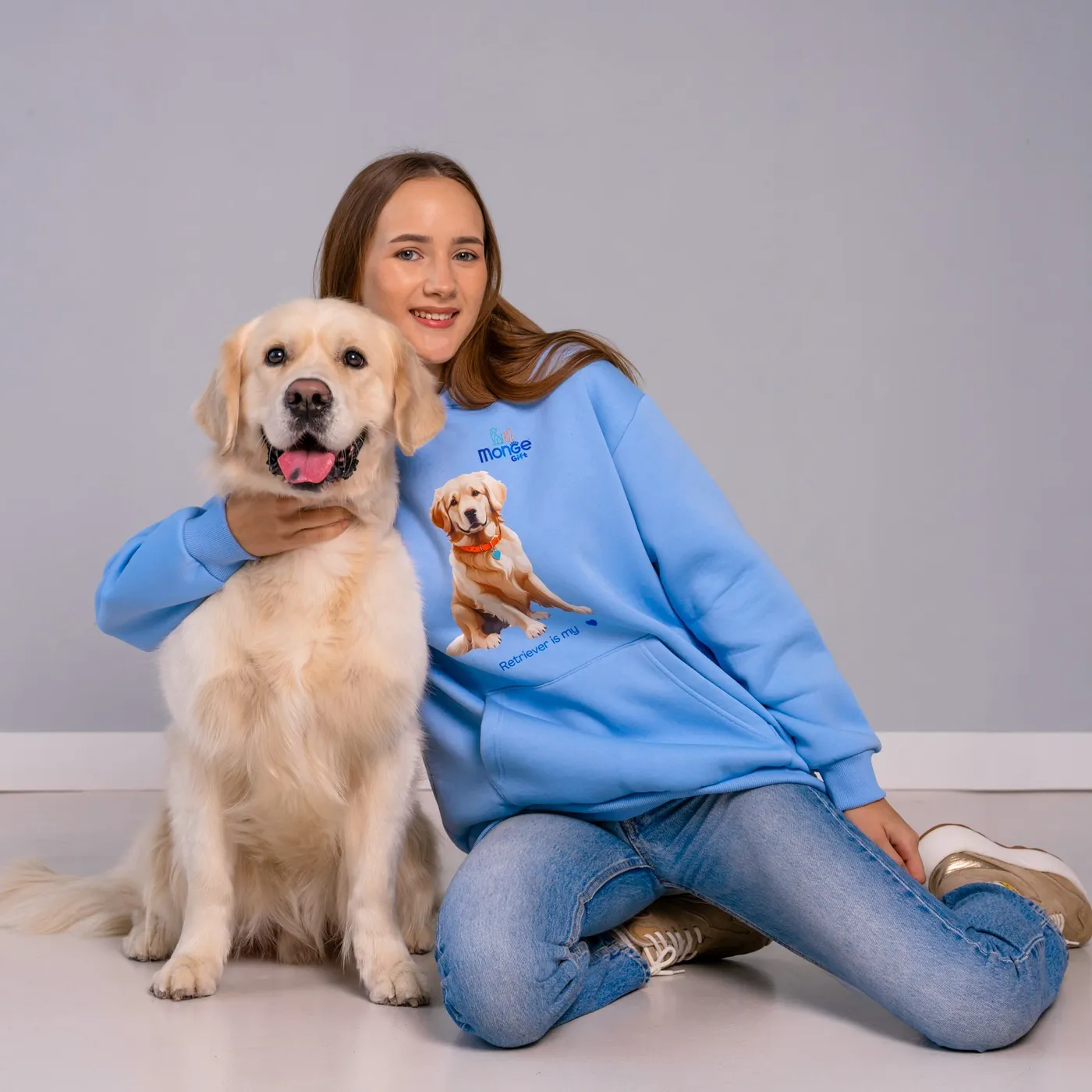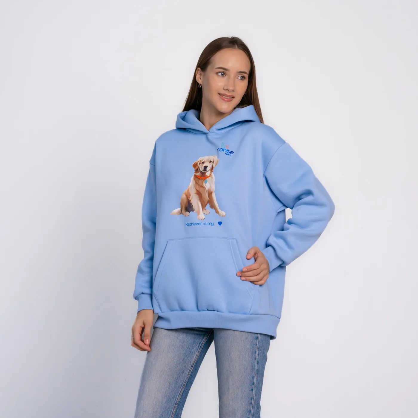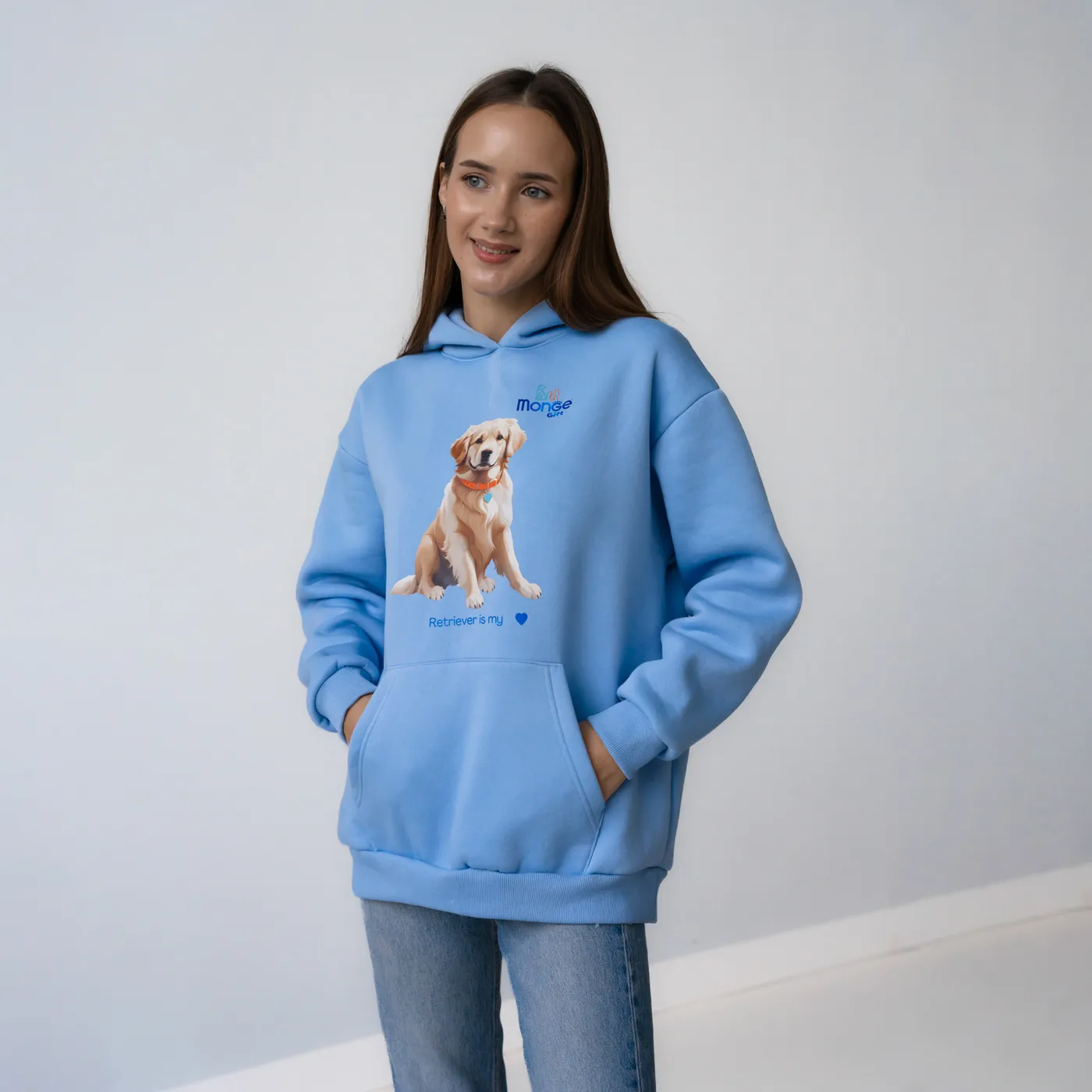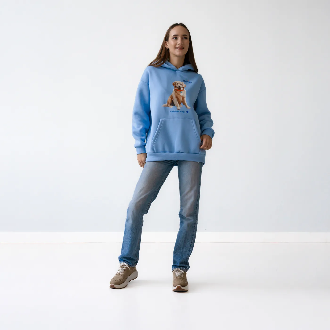Худи AVALON из коллекции Gift Shop с принтом золотистого ретривера. Модель выполнена в голубом цвете и имеет размер S. Изделие оснащено капюшоном, накладным карманом, эластичными манжетами и поясом. Худи относится к категории сувенирной продукции для владельцев собак.