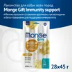 Лакомство Monge Gift Immunity Support для собак в форме мягких палочек. Основной источник белка — свежее мясо кролика (14%) и свежая рыба (65%). В состав включены функциональные ингредиенты: дрожжевые продукты, содержащие бета-глюканы (0,85%) и нуклеотиды (0,12%), для поддержки иммунной системы. Продукт не содержит добавленных злаков, искусственных красителей и сахаров. Форма палочек удобна для использования в качестве поощрения или дополнения к основному рациону.