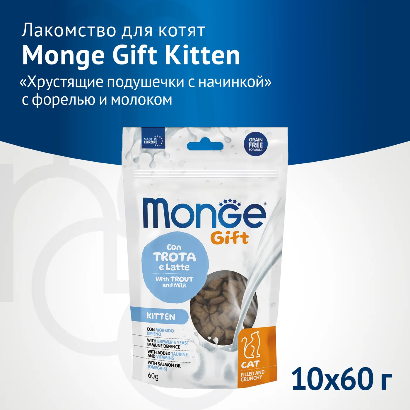 Лакомство Monge Gift Kitten для котят представляет собой хрустящие подушечки с мягкой начинкой. Основной вкус обеспечивается форелью и сухим молоком. Продукт не содержит злаков. Состав обогащен таурином, витаминами A, D3, E, а также включает пивные дрожжи и лососевый жир в качестве источника омега-3 жирных кислот. Лакомство не содержит искусственных консервантов и сахара.