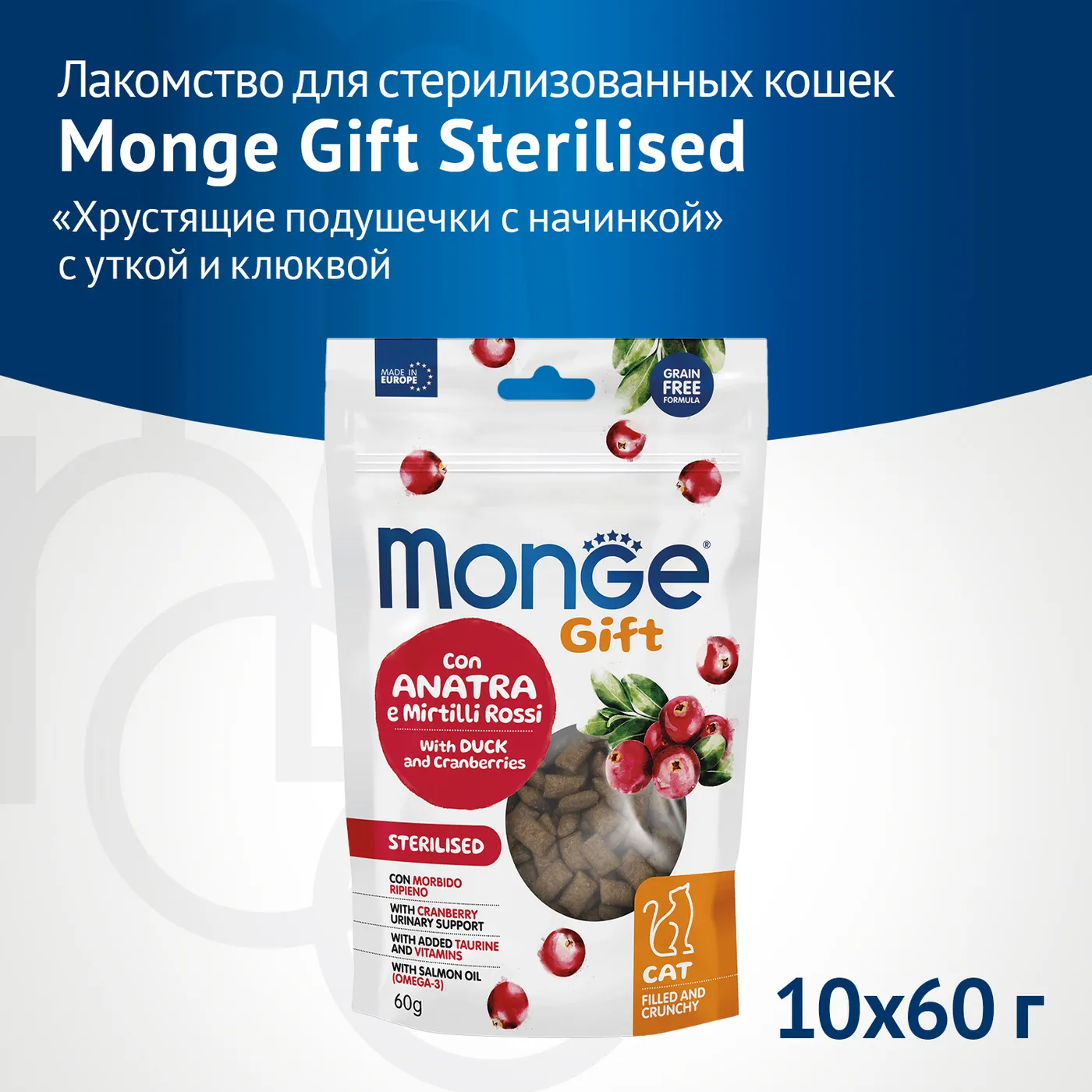 Лакомство Monge Gift Sterilised для стерилизованных кошек представляет собой хрустящие подушечки с начинкой. Вкус утки и клюквы обеспечивает вкусовую привлекательность. Форма подушечек способствует механической очистке зубов. Состав обогащен таурином, лососевым жиром и пивными дрожжами. Продукт не содержит злаков, искусственных консервантов и сахара.