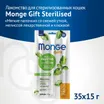 Лакомство Monge Gift Sterilised для стерилизованных кошек в виде мягких палочек. Основной источник белка — свежая утка. В состав включены клюква и мелисса лекарственная. Продукт без добавления злаков, искусственных красителей и сахара. Обогащен таурином, витаминами A, D3 и E. Энергетическая ценность — 3290 ккал/кг.