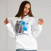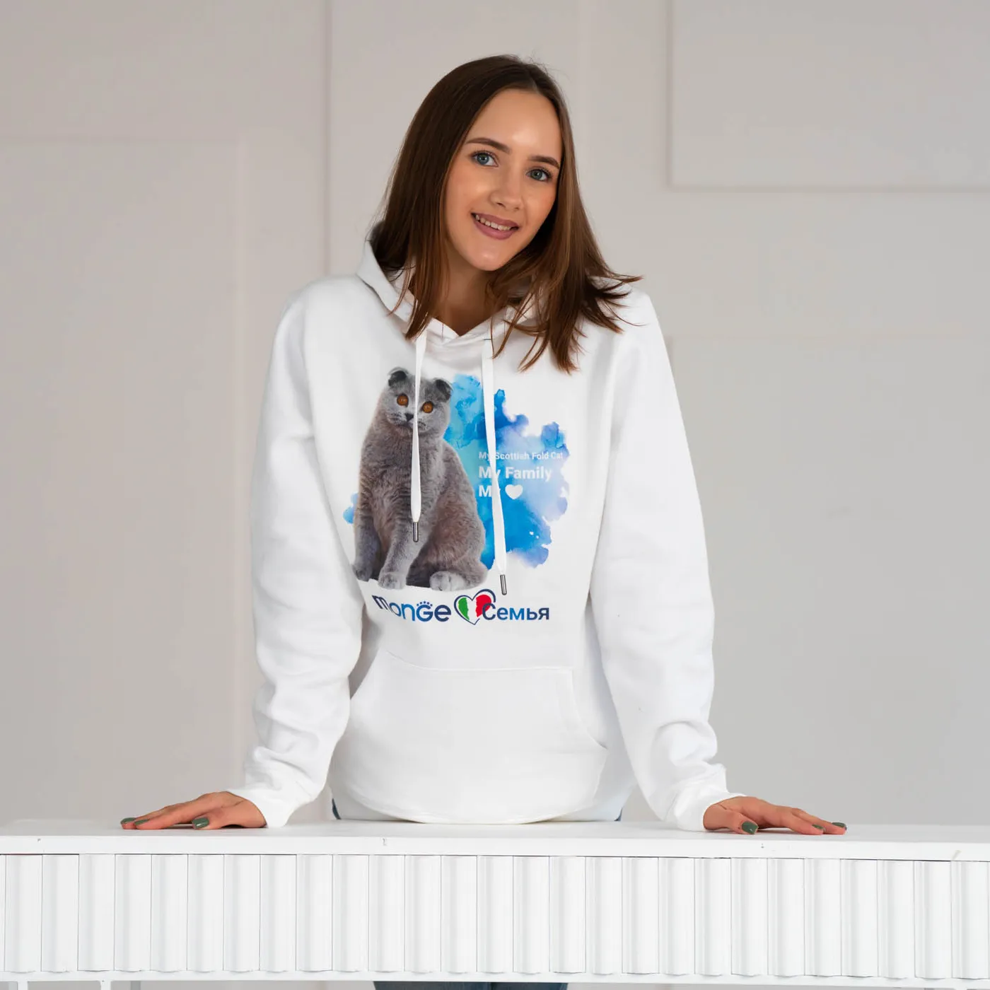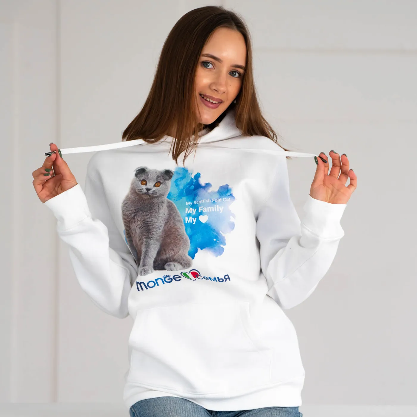 Толстовка с капюшоном из коллекции Gift Shop 2023. Модель имеет накладной карман, эластичные пояс и манжеты. На изделии размещен принт с изображением кошки породы Шотландская вислоухая (Скоттиш фолд).
