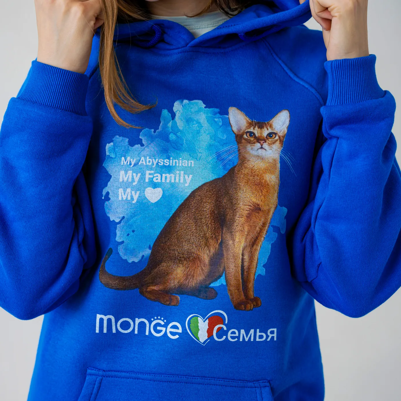 Худи синего цвета с капюшоном из коллекции Gift Shop 2023 бренда Monge. Модель украшена принтом с изображением Абиссинской кошки. Конструкция включает накладной карман, эластичные пояс и манжеты. Толстовка предназначена для владельцев домашних животных.