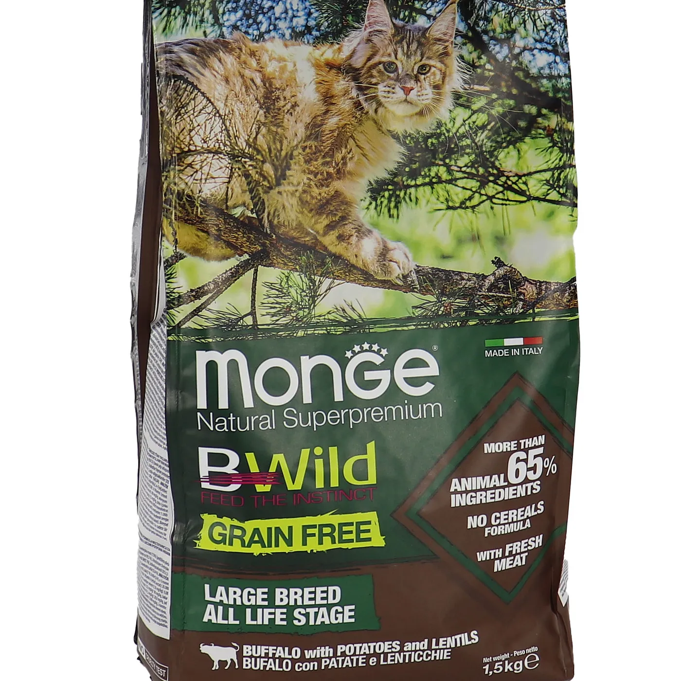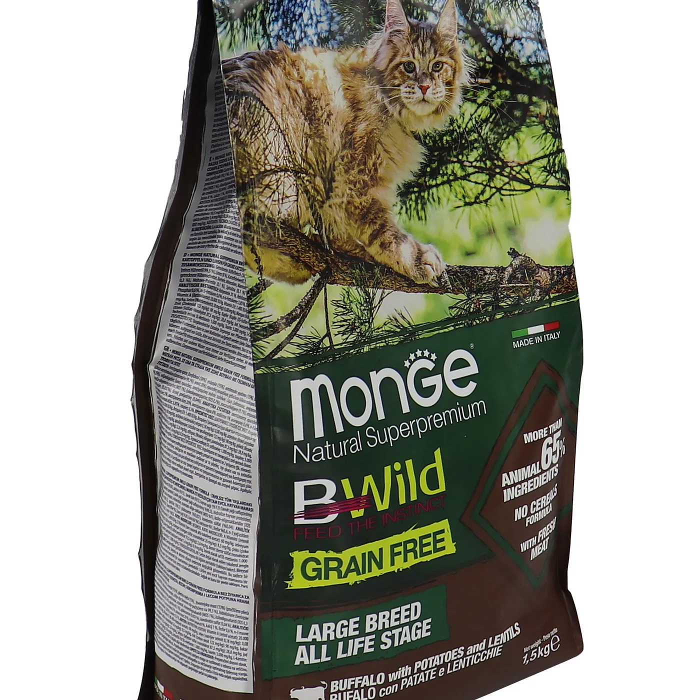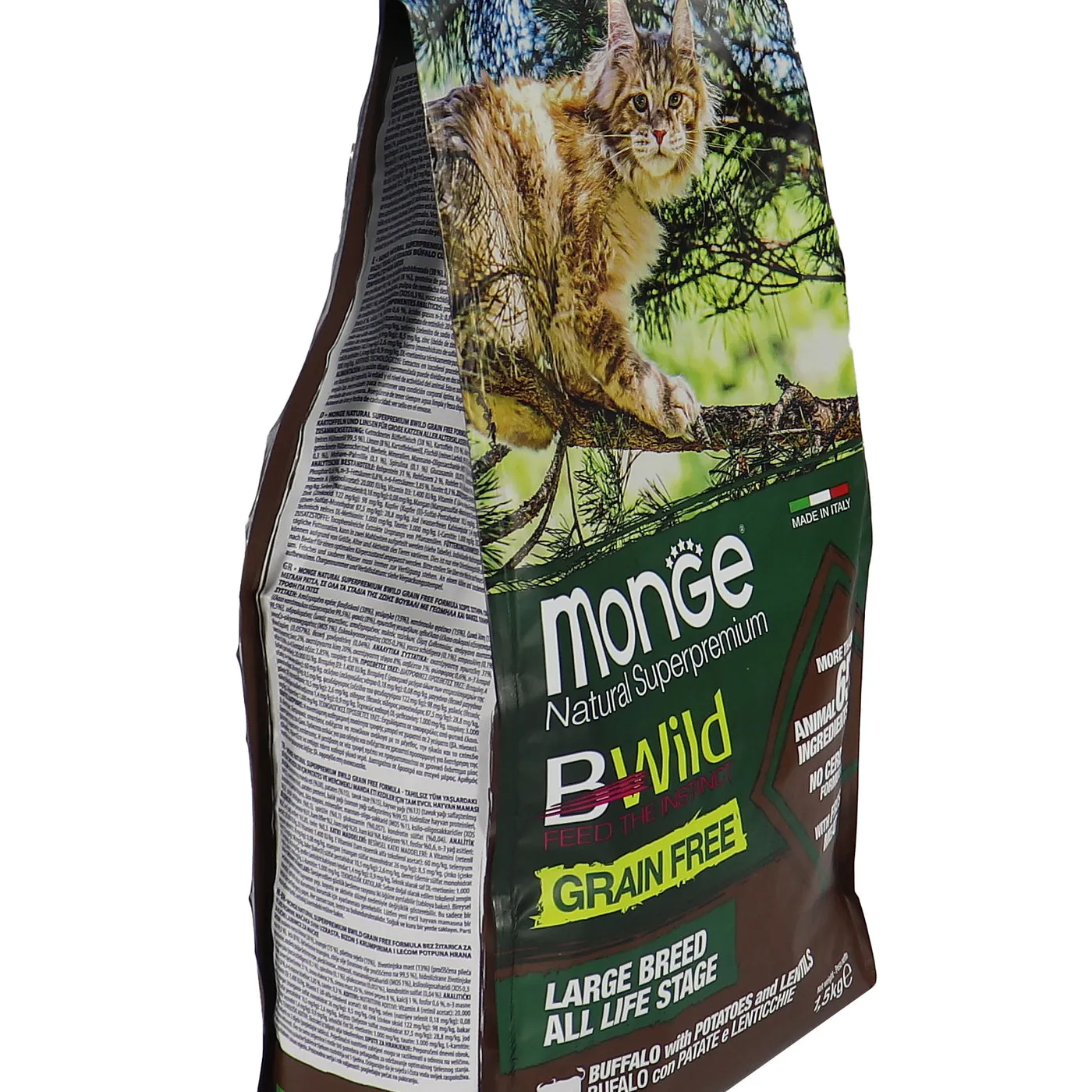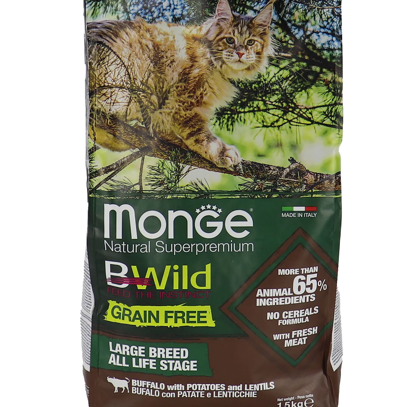 Полнорационный сухой корм Monge Cat BWild GRAIN FREE для котят и кошек крупных пород. Основной источник белка — дегидрированное и свежее мясо буйвола. Рецепт не содержит зерновых культур, в качестве источника углеводов используется картофель и чечевица. Состав обогащен глюкозамином, хондроитином, кальцием и фосфором для поддержки костной системы и суставов, а также пребиотиками MOS и XOS для пищеварения. Корм подходит для животных всех возрастов, включая период роста.