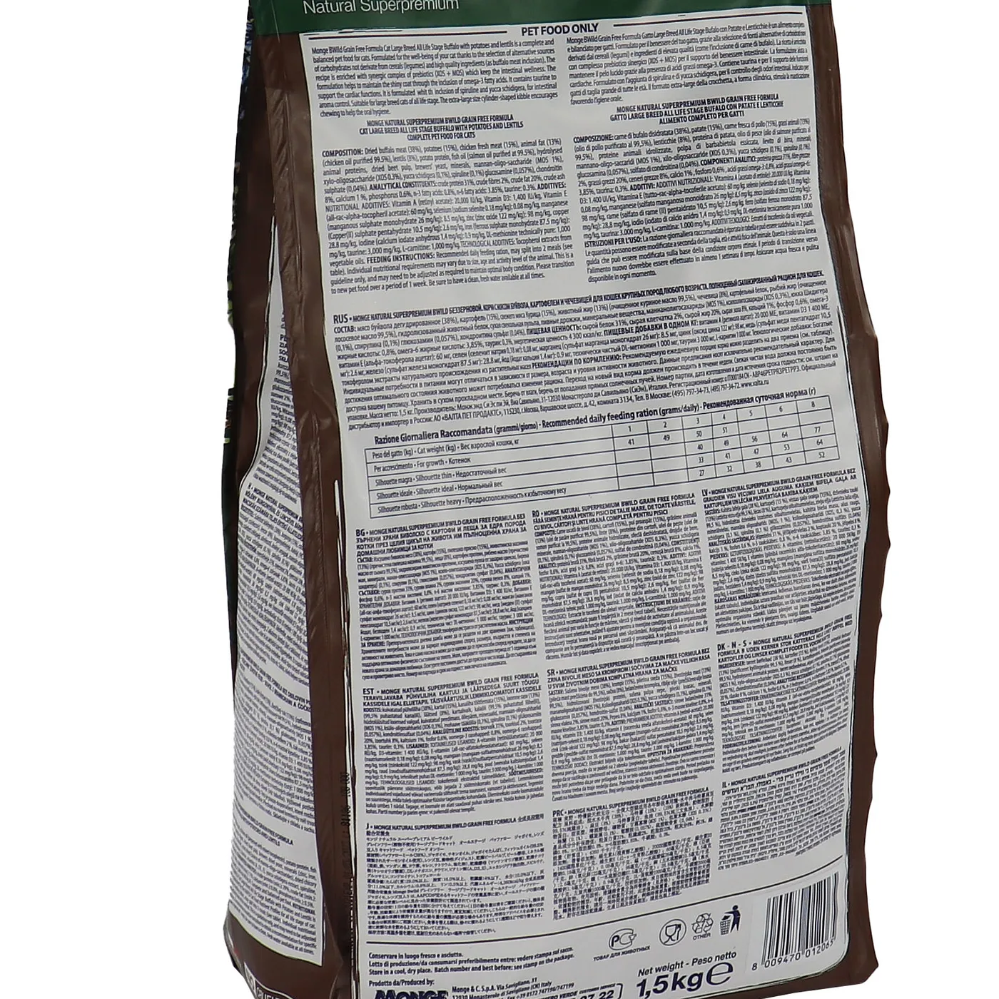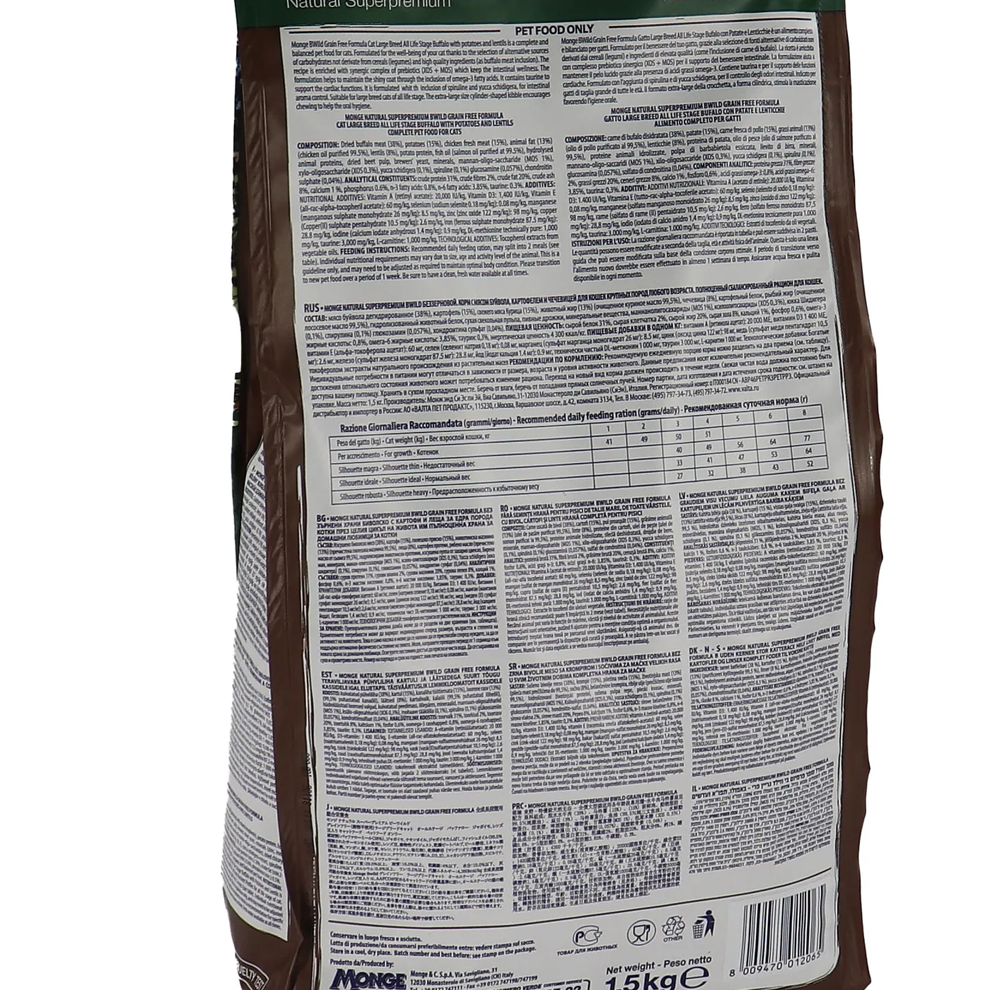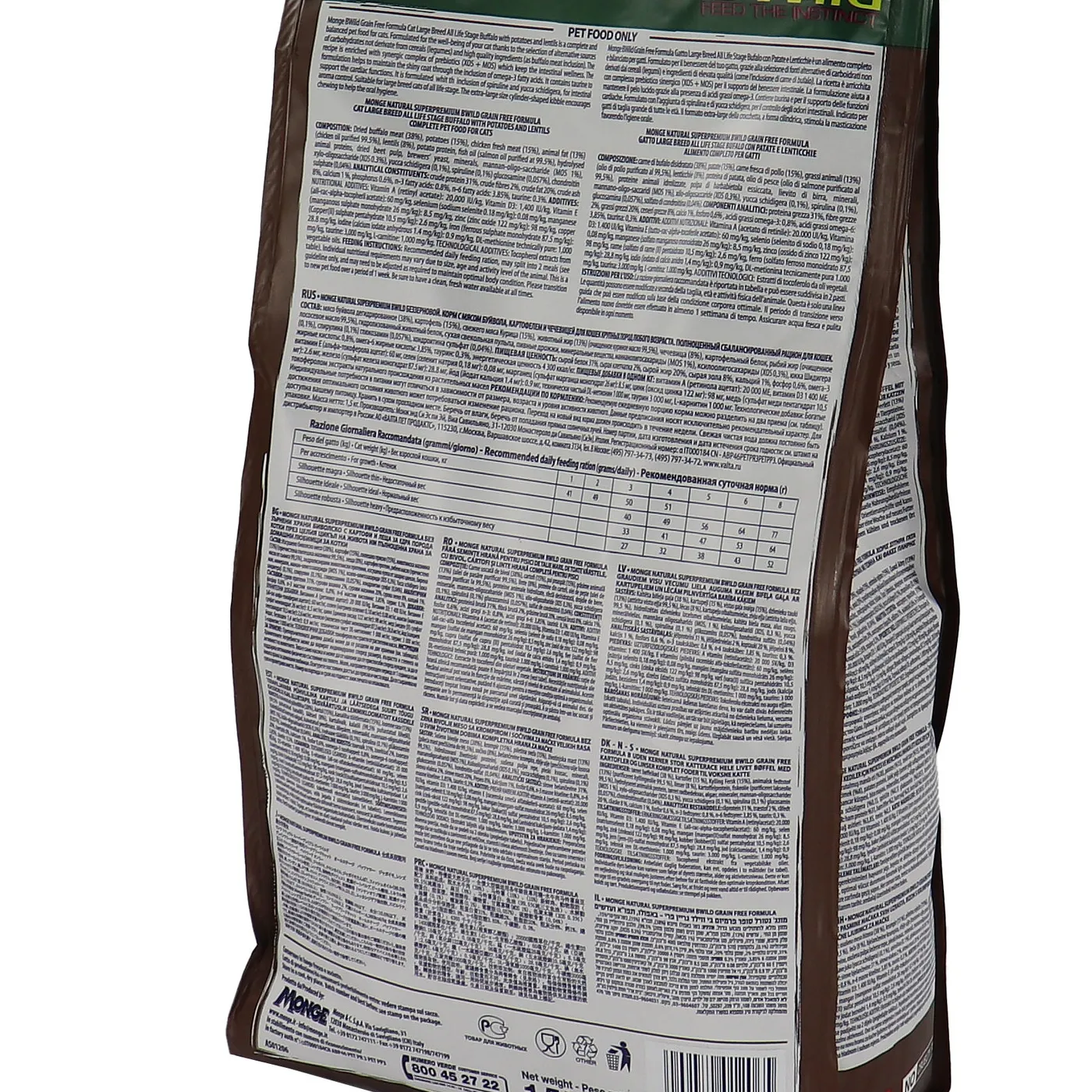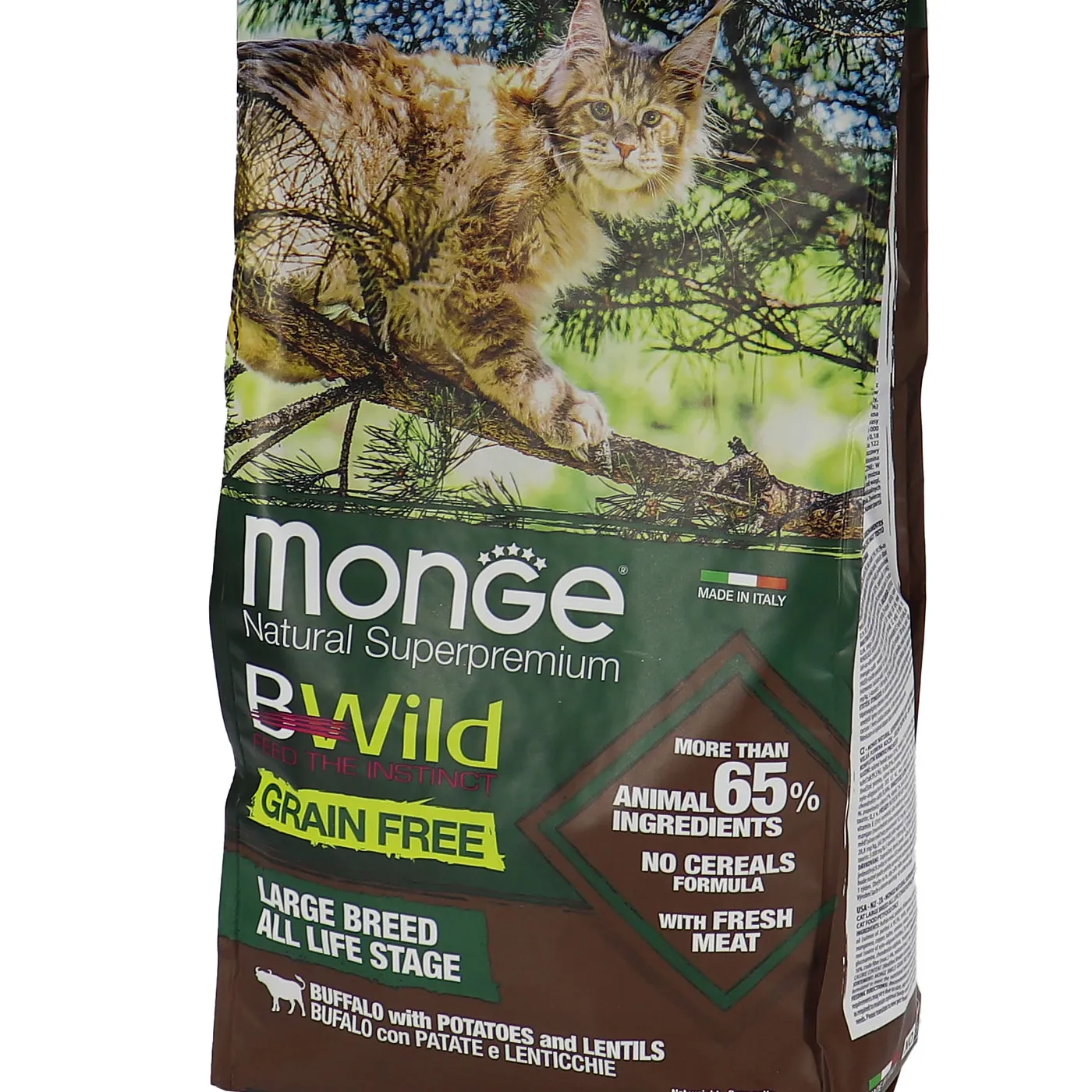 Полнорационный сухой корм Monge Cat BWild GRAIN FREE для котят и кошек крупных пород. Основной источник белка — дегидрированное и свежее мясо буйвола. Рецепт не содержит зерновых культур, в качестве источника углеводов используется картофель и чечевица. Состав обогащен глюкозамином, хондроитином, кальцием и фосфором для поддержки костной системы и суставов, а также пребиотиками MOS и XOS для пищеварения. Корм подходит для животных всех возрастов, включая период роста.
