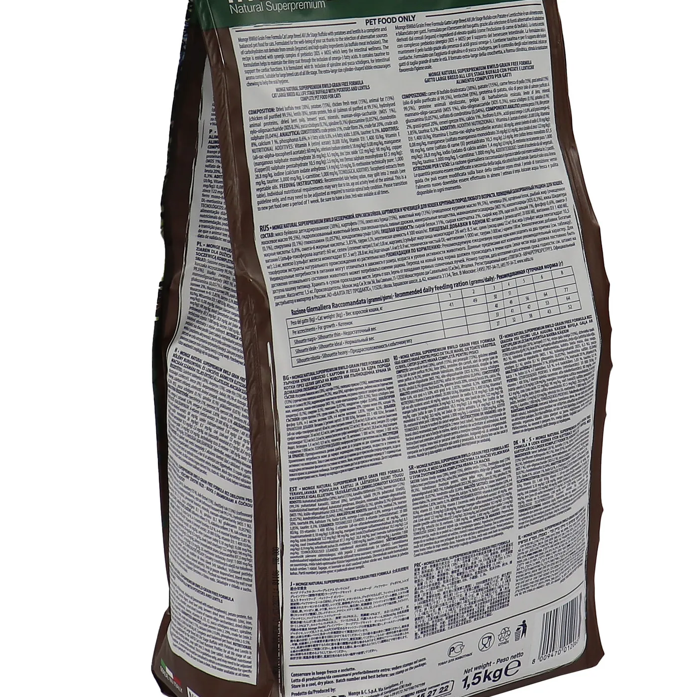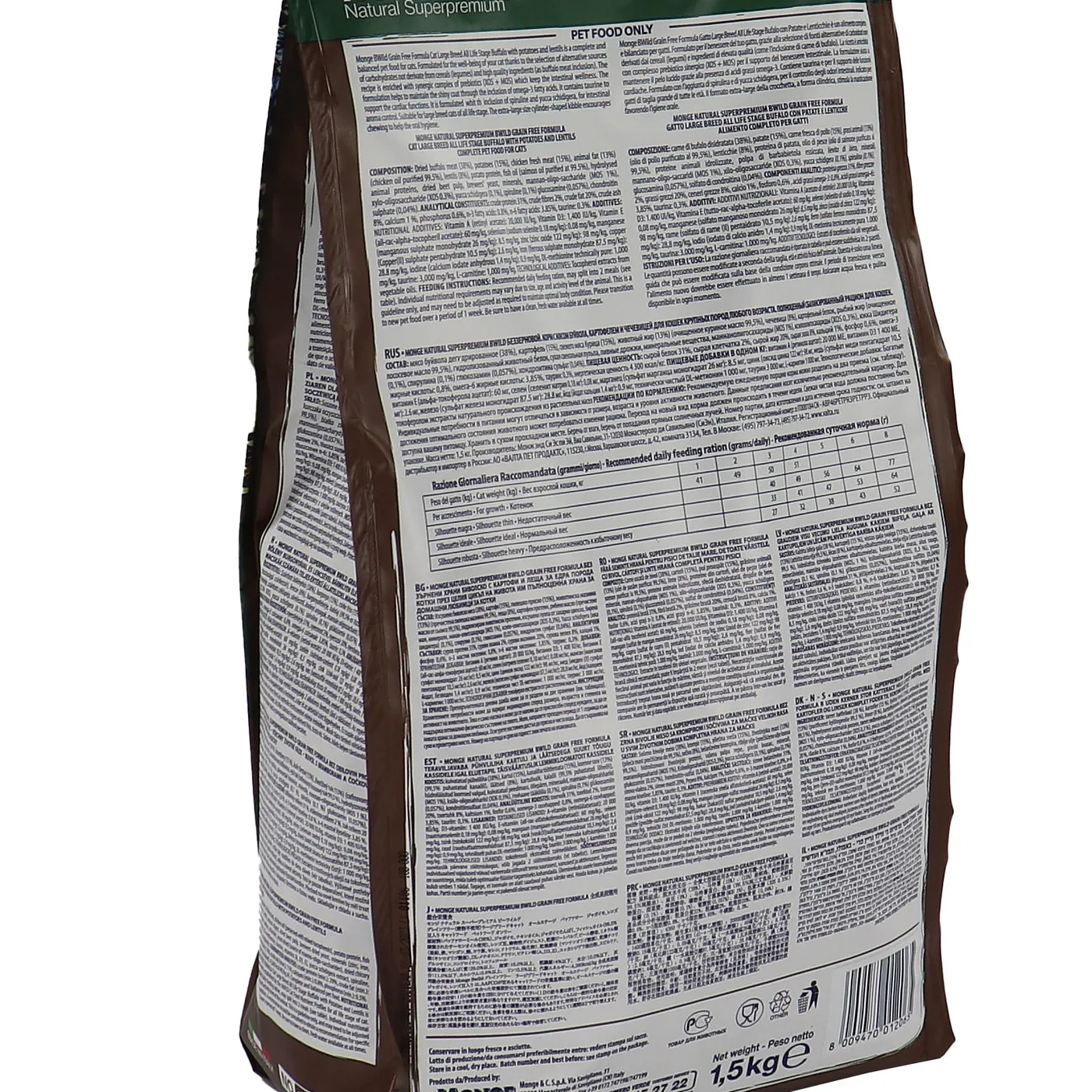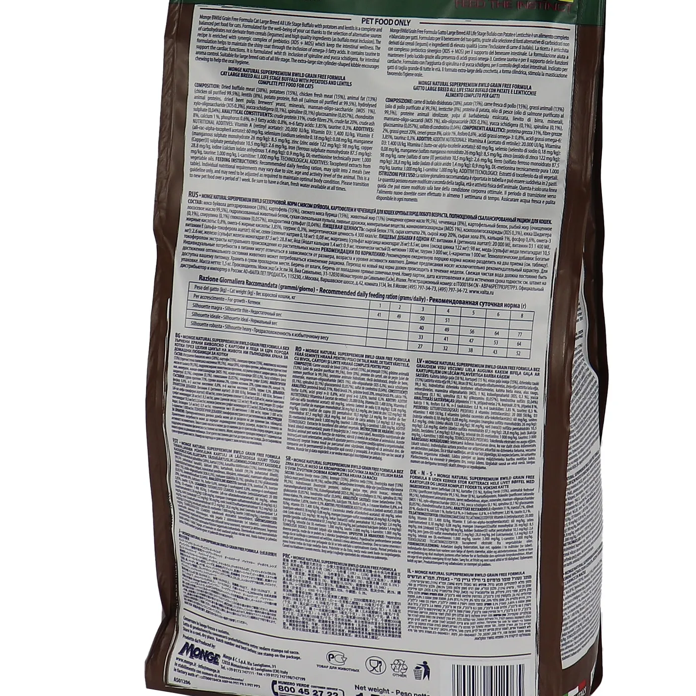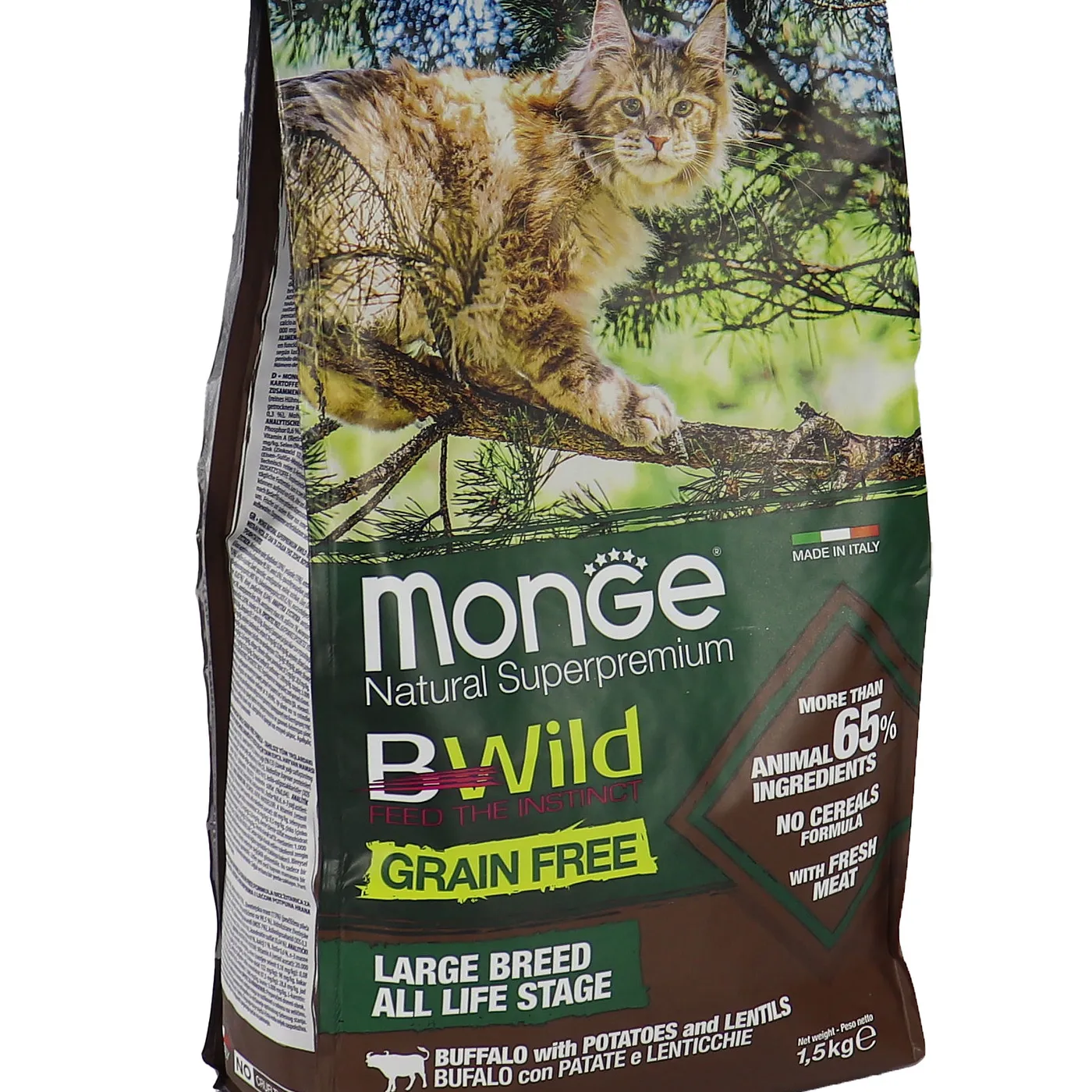 Полнорационный сухой корм Monge Cat BWild GRAIN FREE для котят и кошек крупных пород. Основной источник белка — дегидрированное и свежее мясо буйвола. Рецепт не содержит зерновых культур, в качестве источника углеводов используется картофель и чечевица. Состав обогащен глюкозамином, хондроитином, кальцием и фосфором для поддержки костной системы и суставов, а также пребиотиками MOS и XOS для пищеварения. Корм подходит для животных всех возрастов, включая период роста.