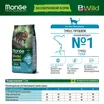 Monge Cat BWild GRAIN FREE — полнорационный беззерновой сухой корм для стерилизованных кошек. Основной источник белка — тунец (дегидрированный и свежий). Состав включает L-карнитин, таурин, пребиотики MOS и XOS, а также комплекс витаминов и минералов. Корм разработан с учётом особенностей обмена веществ стерилизованных животных.
