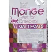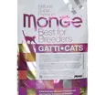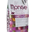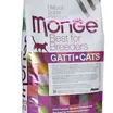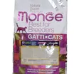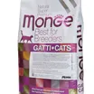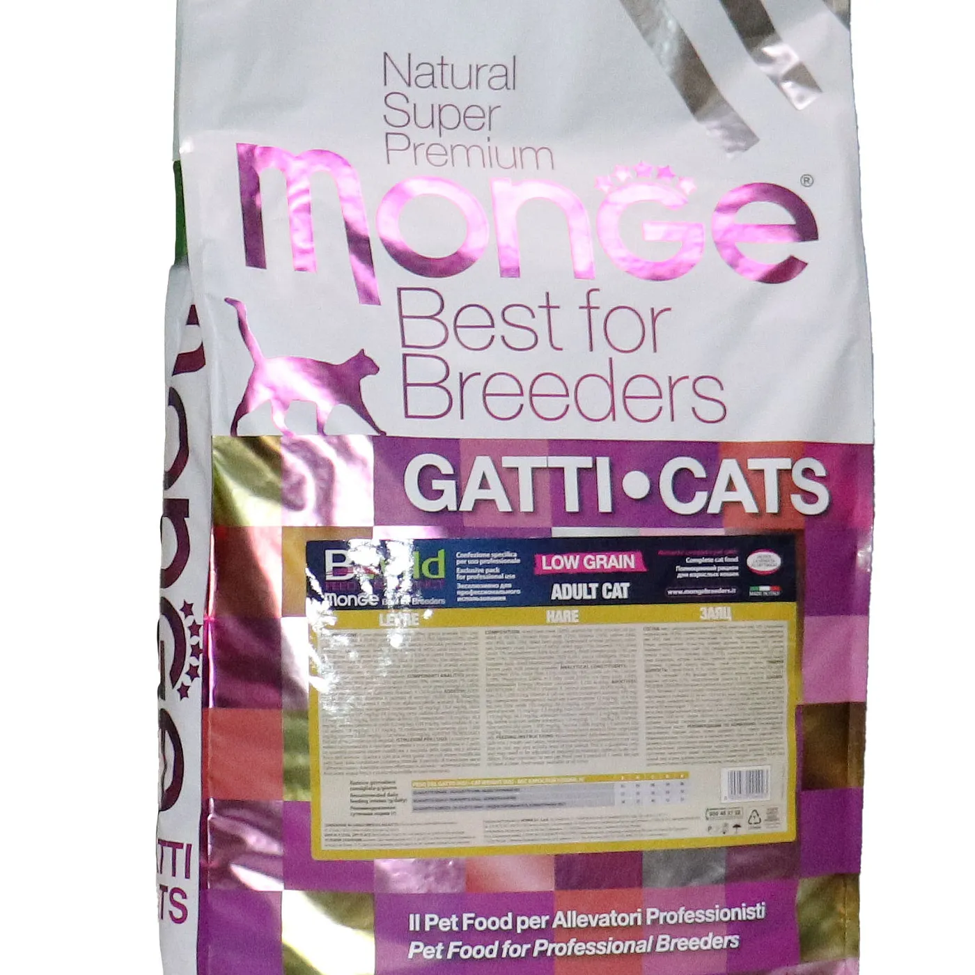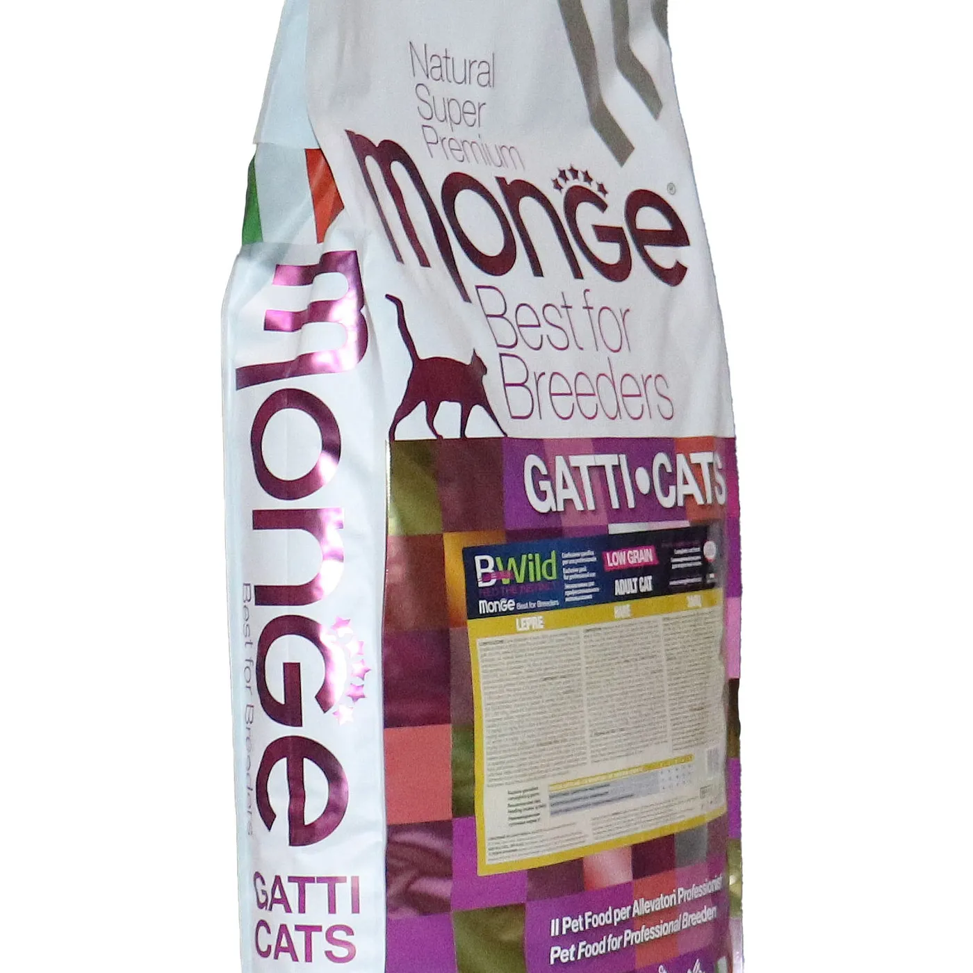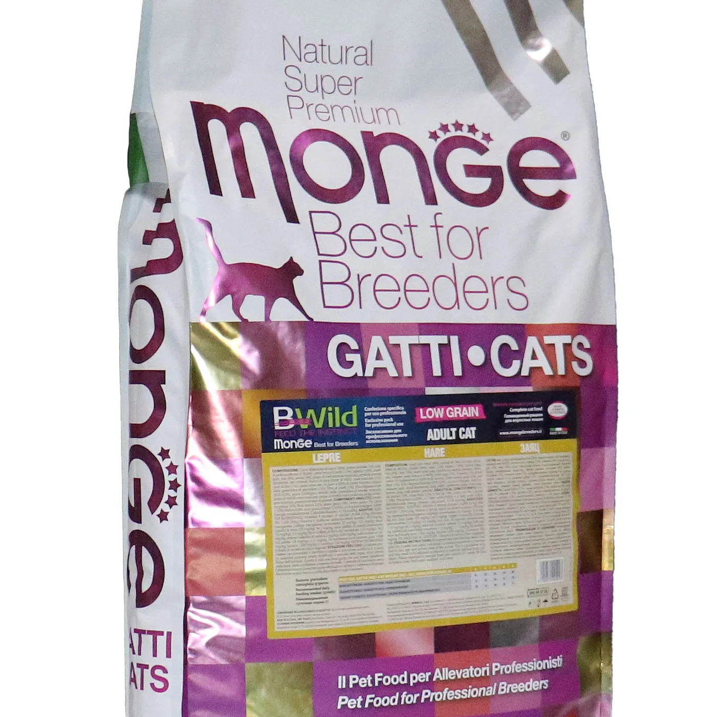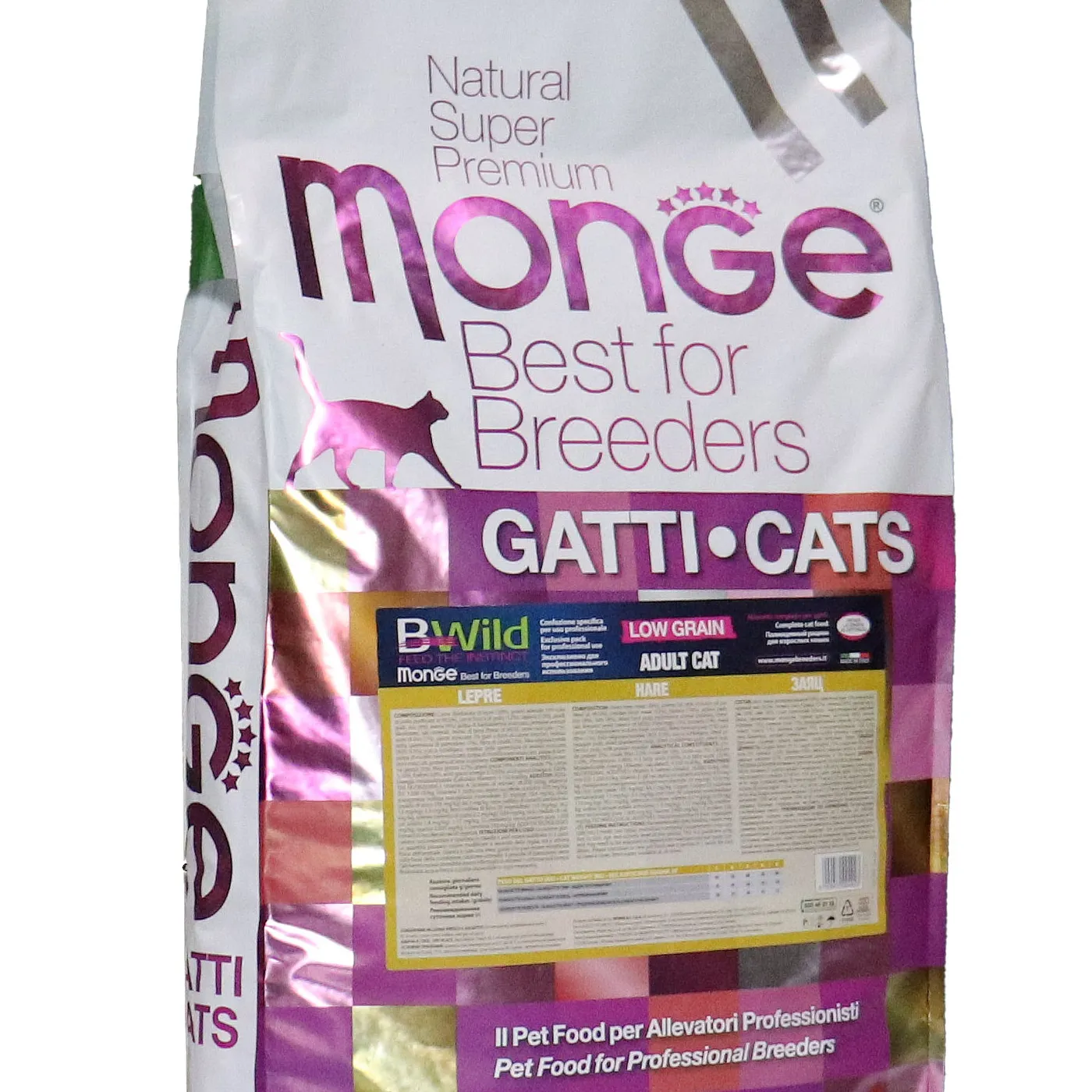 Полнорационный сухой корм Monge Cat BWild LOW GRAIN для взрослых кошек. Основной источник белка — дегидрированное мясо зайца (38%) и свежее мясо курицы. Рецепт с пониженным содержанием злаков и без картофеля. Содержит пребиотики MOS и XOS для поддержания баланса кишечной микрофлоры, а также комплекс Омега-3 и Омега-6 жирных кислот. В состав включены сушёные пульпы лесных ягод (черника, клюква, малина) и экстракт ананаса.
