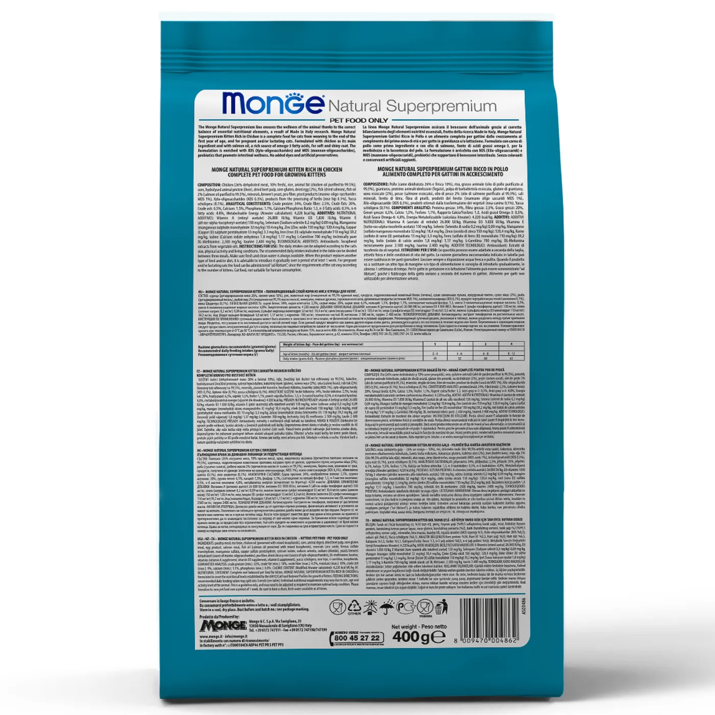 Сухой корм Monge Cat Daily Line предназначен для котят в возрасте от 1 до 12 месяцев, а также для беременных и лактирующих кошек. Основным источником белка является курица, включая дегидрированное и свежее мясо. Формула содержит пребиотики M.O.S. и X.O.S., омега-3 и омега-6 жирные кислоты, а также сбалансированный уровень кальция и фосфора. Корм не содержит ГМО, искусственных красителей и ароматизаторов.