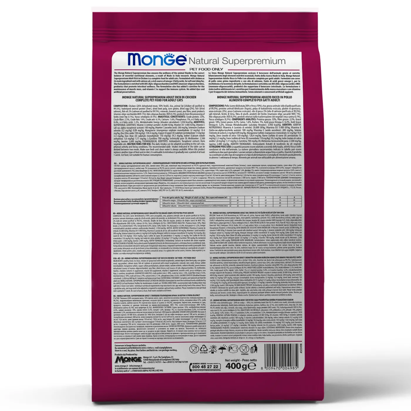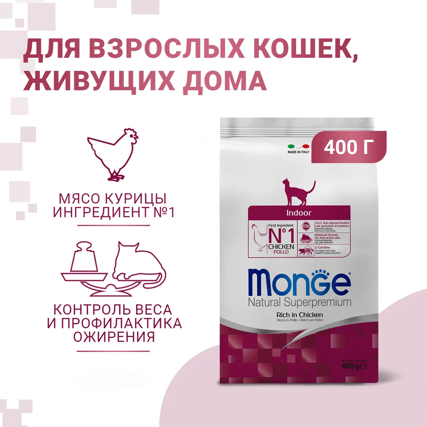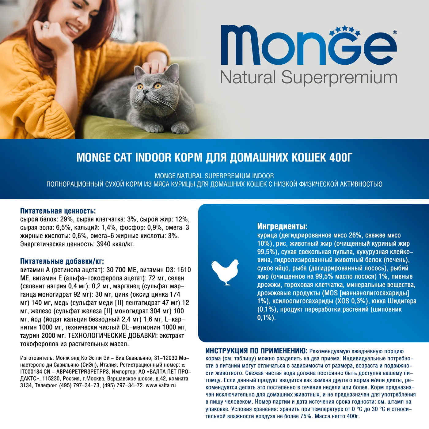 Сухой корм Monge Cat Daily Line Indoor для домашних кошек с основным источником белка из курицы. Полнорационный рацион разработан для кошек с низкой физической активностью, ведущих домашний образ жизни. Формула содержит L-карнитин, пребиотики MOS и XOS, а также таурин. Энергетическая ценность составляет 3840 ккал/кг.
