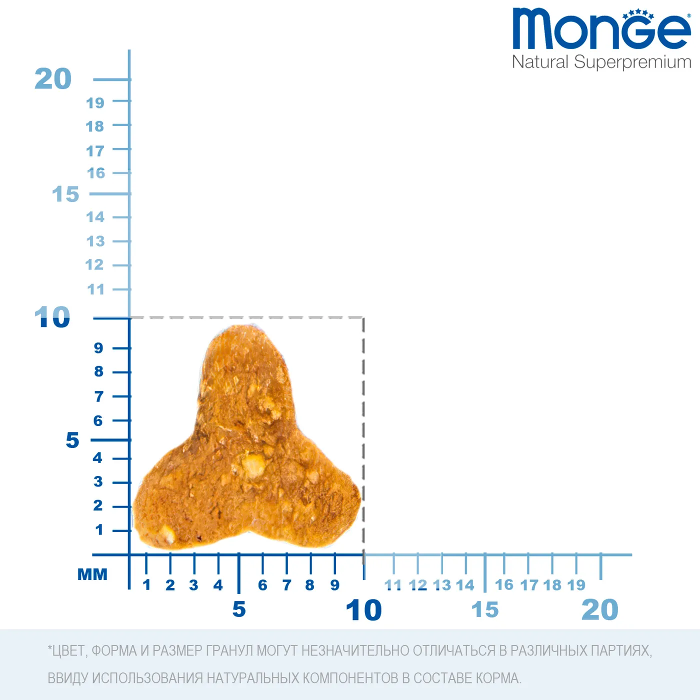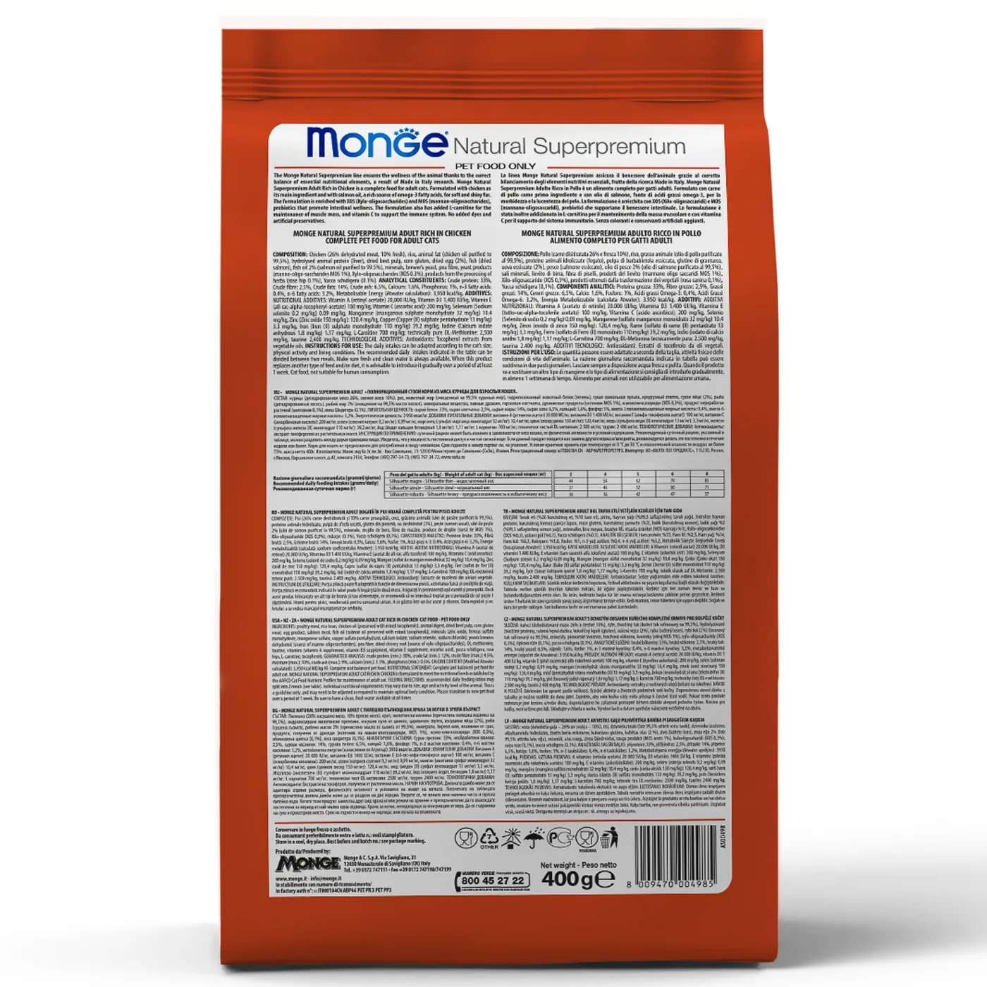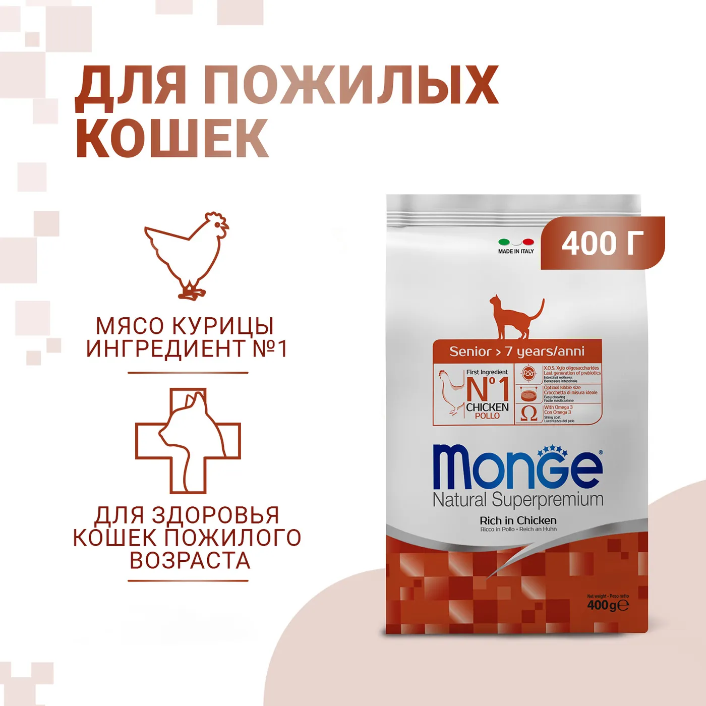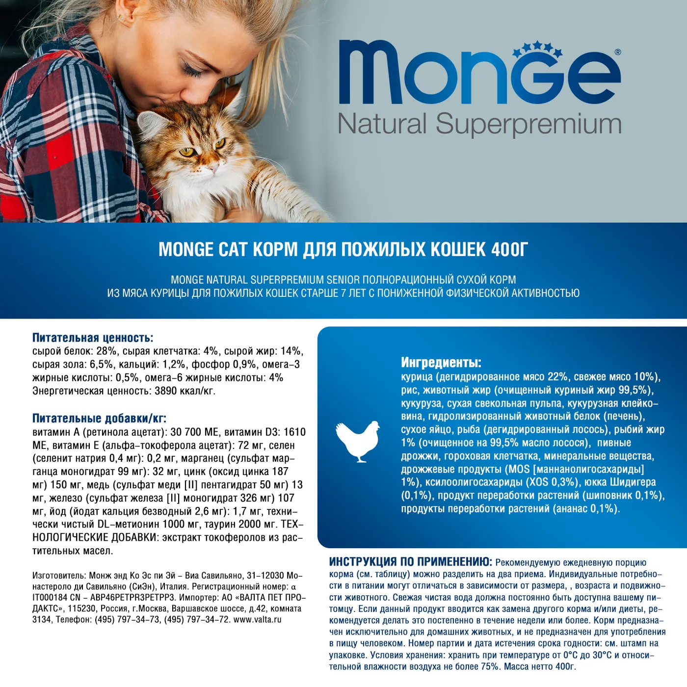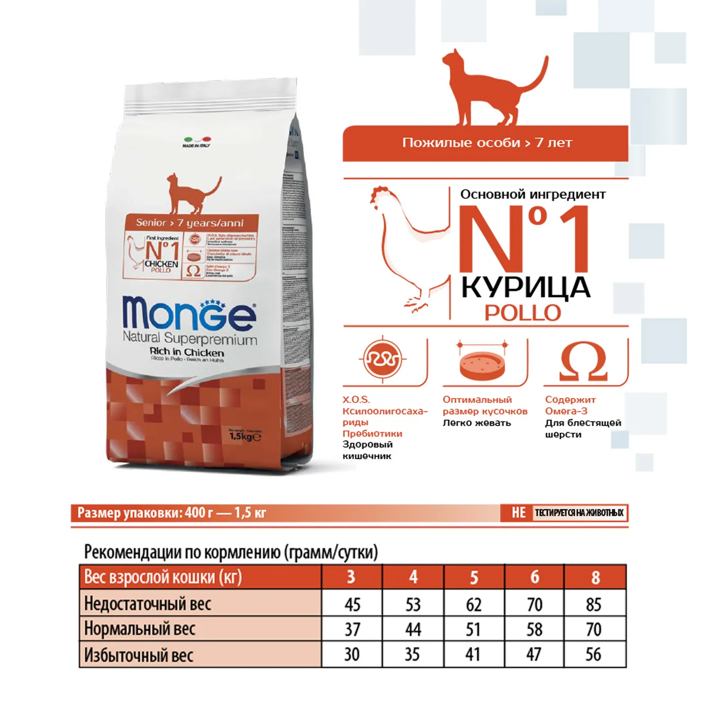 Сухой корм Monge Cat Daily Line Senior предназначен для пожилых кошек старше 7 лет. Основным источником белка является курица (дегидрированное и свежее мясо). Рецептура включает умеренное содержание жиров, пребиотики MOS и XOS для поддержания микрофлоры кишечника, а также антиоксиданты, включая витамин Е. Форма и текстура гранул адаптированы для пожилых животных. Корм не содержит ГМО, искусственных красителей и ароматизаторов.