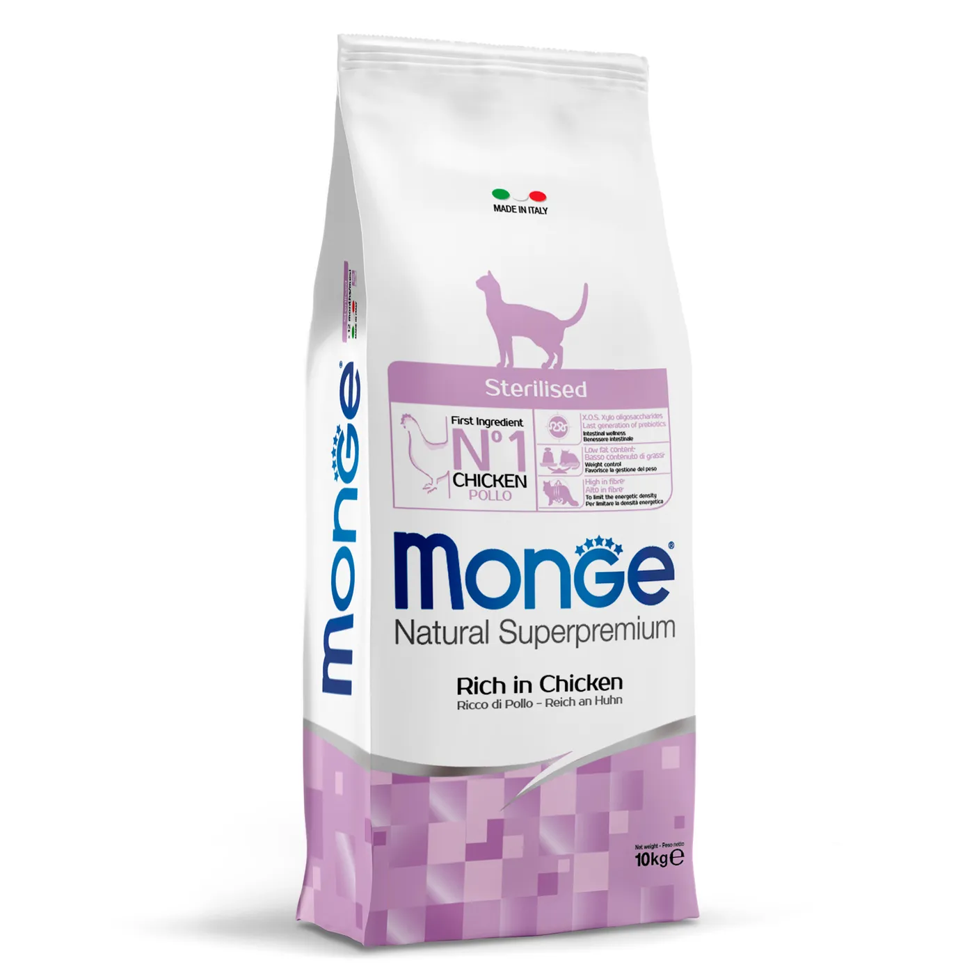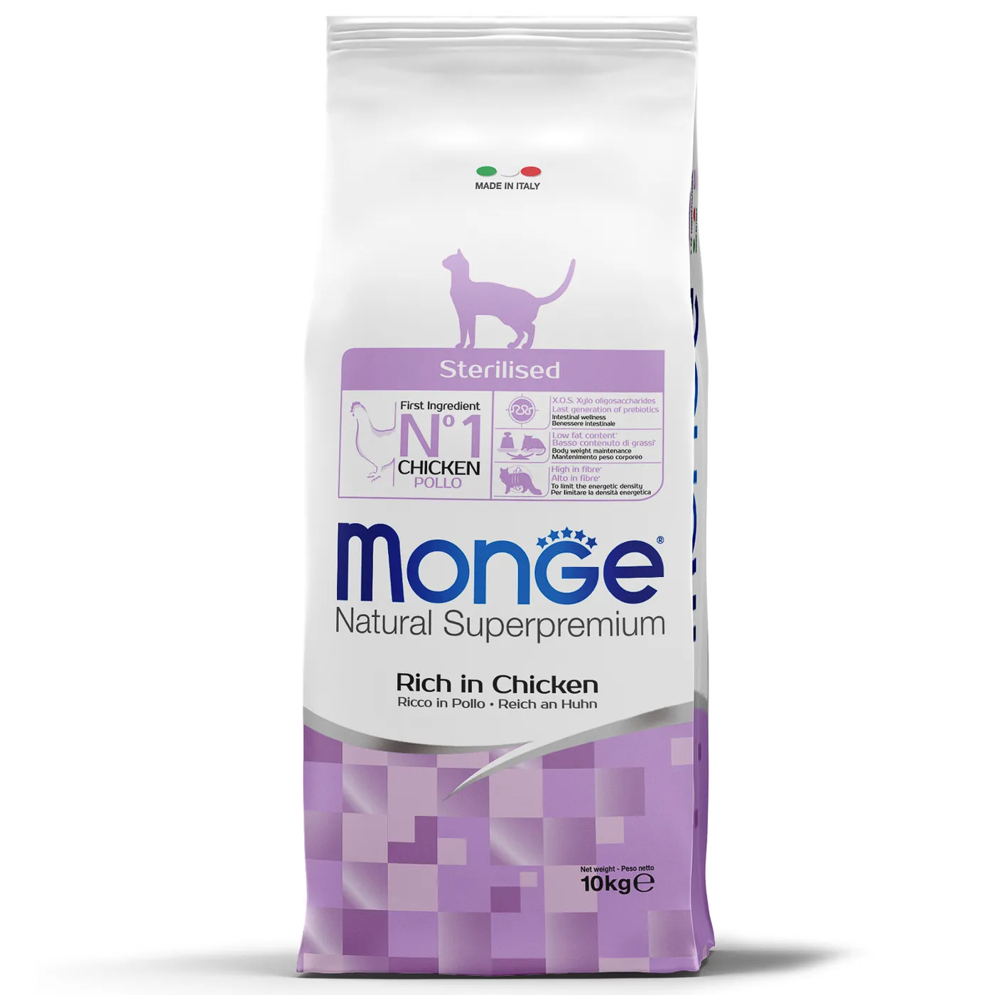 Полнорационный сухой корм Monge Cat Daily Line Sterilised для стерилизованных кошек и кастрированных котов. Рецепт с курицей разработан с пониженной калорийностью для контроля веса. Корм содержит пребиотики MOS и XOS для поддержания баланса кишечной микрофлоры, клетчатку для пищеварения и обогащён витамином Е.
