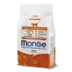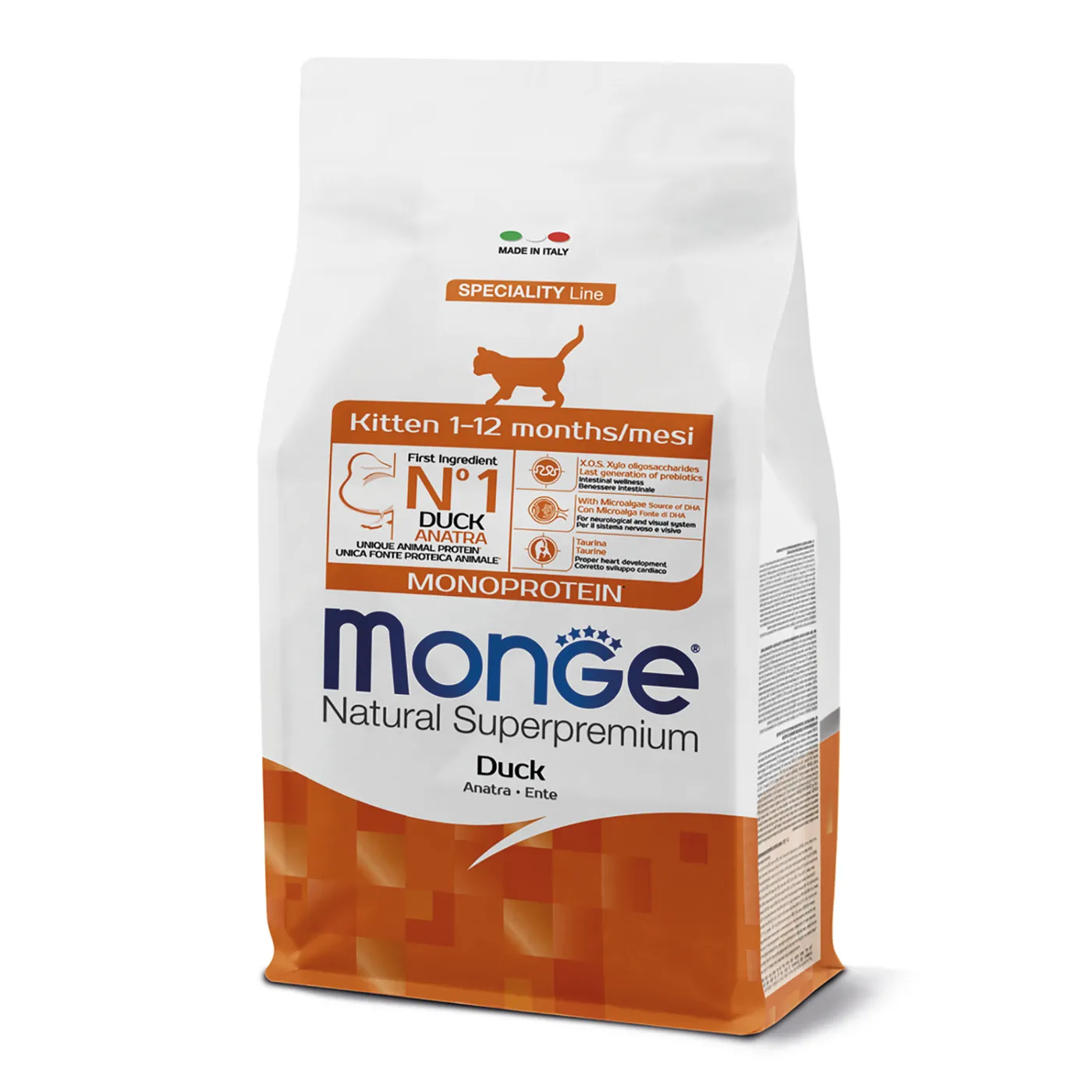 Сухой корм Monge Cat Speciality Line Monoprotein для котят и беременных кошек с основным источником белка — уткой. Рецепт с одним животным белком предназначен для животных с повышенной чувствительностью к компонентам корма или нуждающихся в исключающей диете. В состав включены пребиотики MOS и XOS для поддержания баланса кишечной микрофлоры, таурин, а также масло микроводорослей как источник DHA.