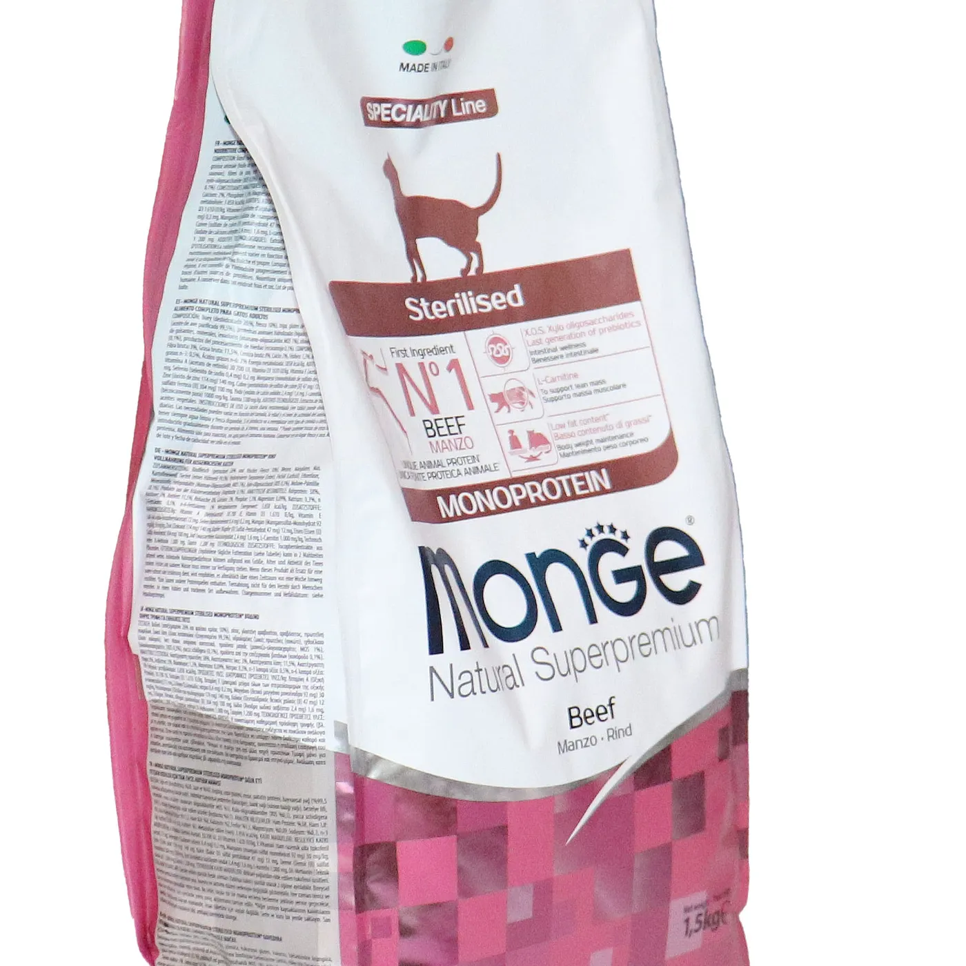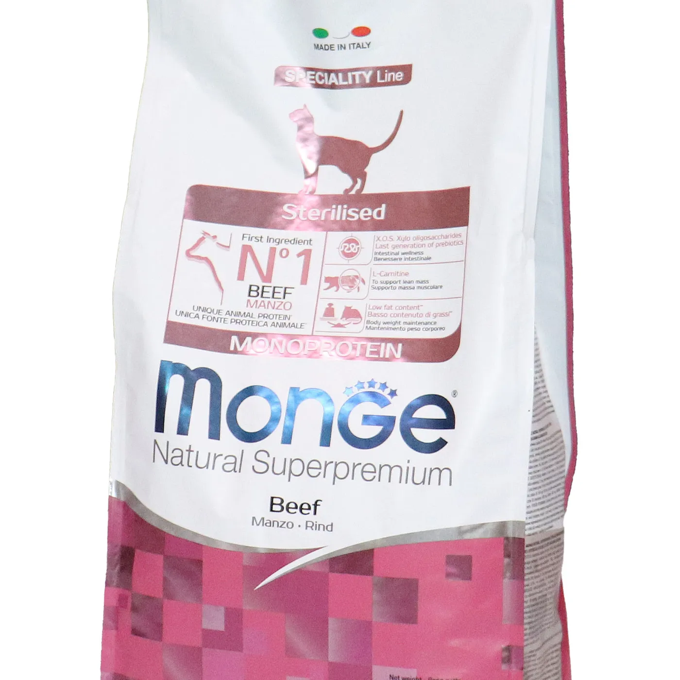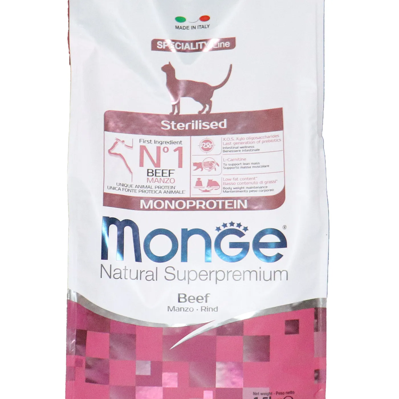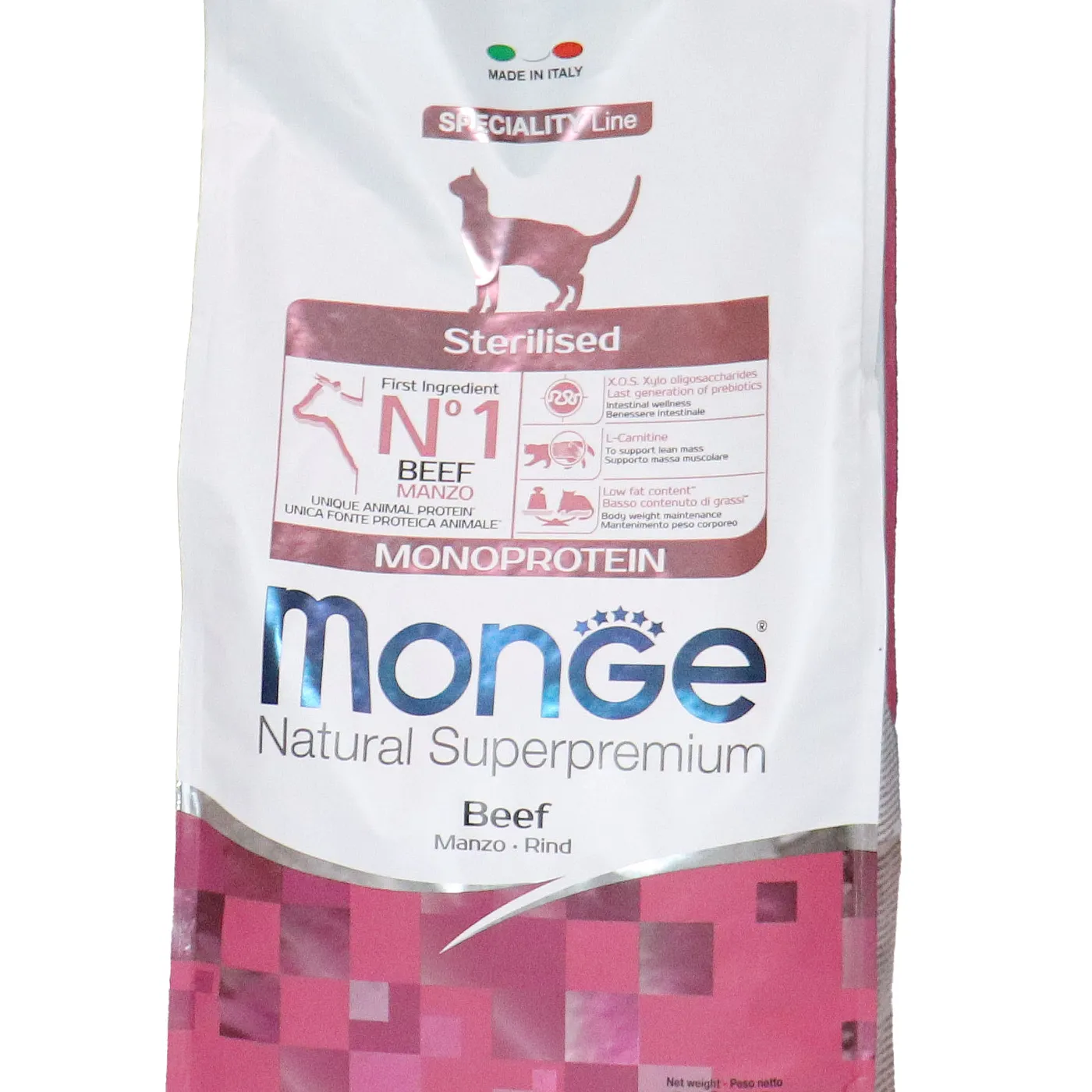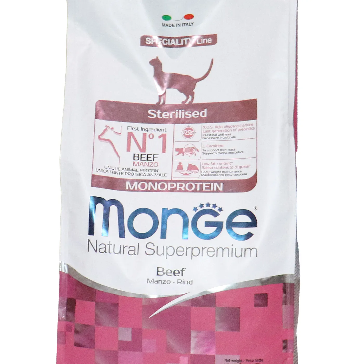 Сухой корм Monge Cat Speciality Line Monoprotein Sterilised — полнорационный рацион для стерилизованных кошек и кастрированных котов. Основной источник животного белка — говядина (дегидрированная 26%, свежая 10%). Формула содержит пониженное содержание жира (11,5%) и калорий (3858 ккал/кг), что способствует поддержанию веса. В состав включены пребиотики MOS и XOS для поддержания баланса кишечной микрофлоры, а также L-карнитин и таурин. Корм обогащён витамином E и селеном в качестве антиоксидантов. Не содержит ГМО, искусственных красителей и ароматизаторов.
