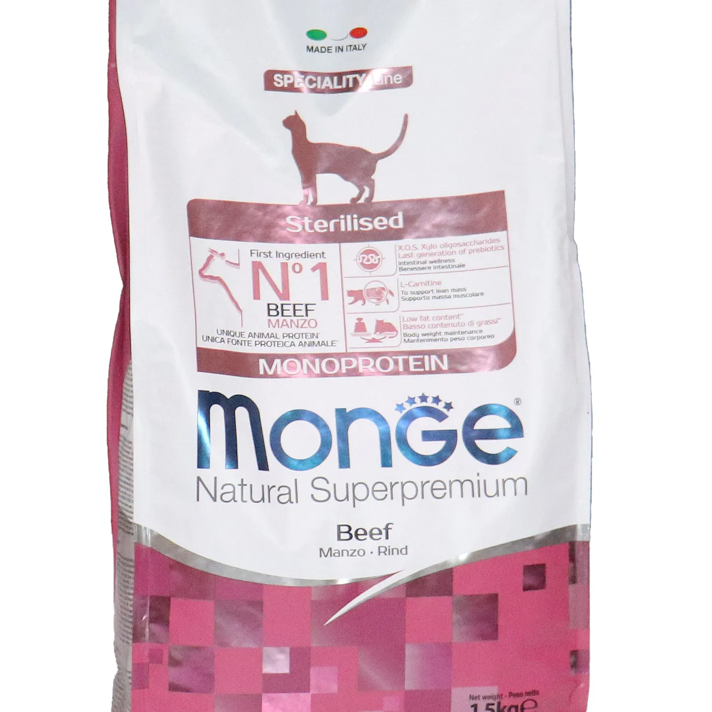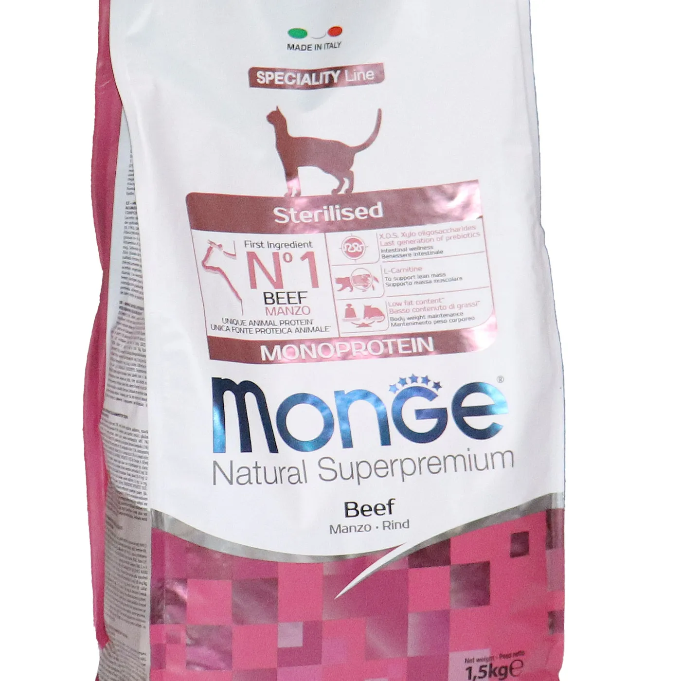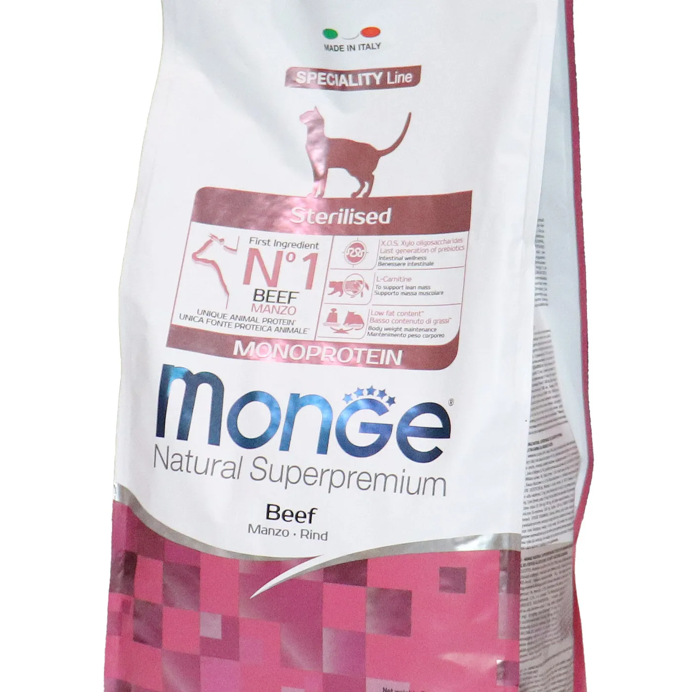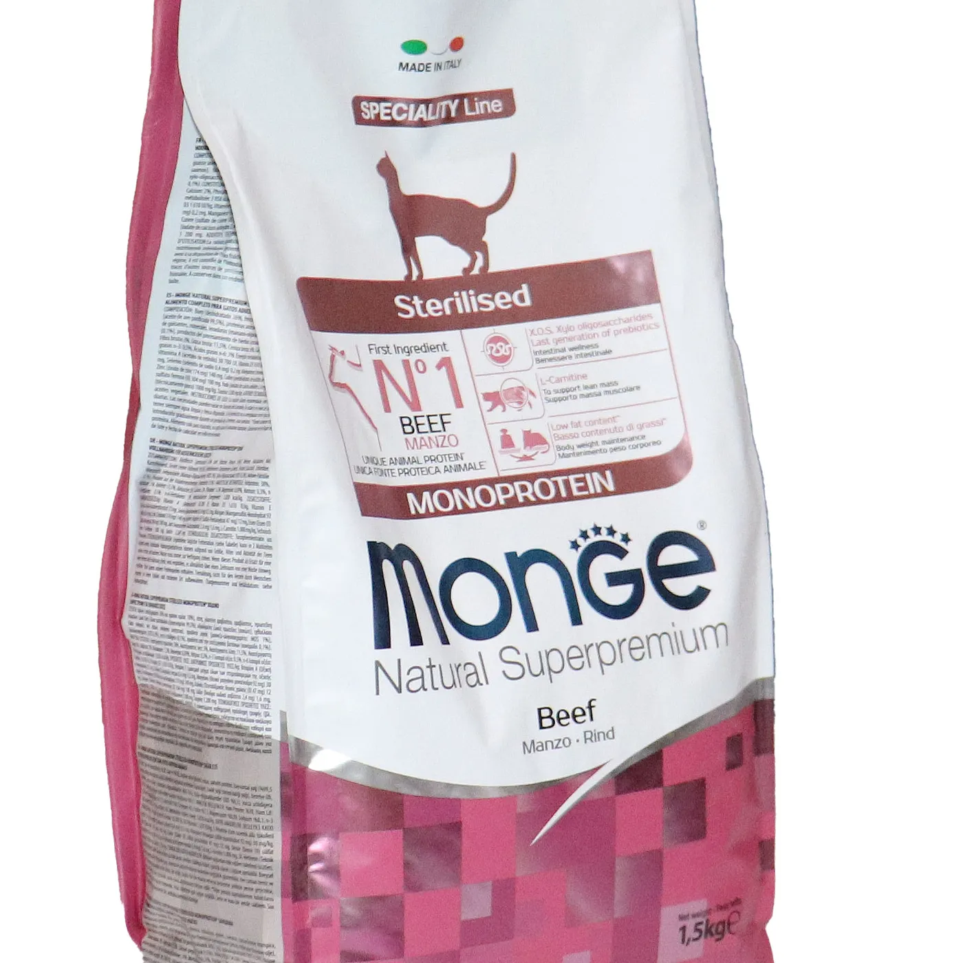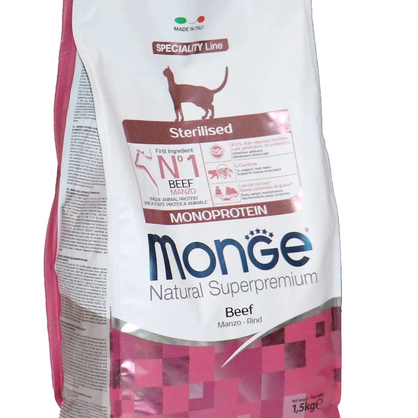 Сухой корм Monge Cat Speciality Line Monoprotein Sterilised — полнорационный рацион для стерилизованных кошек и кастрированных котов. Основной источник животного белка — говядина (дегидрированная 26%, свежая 10%). Формула содержит пониженное содержание жира (11,5%) и калорий (3858 ккал/кг), что способствует поддержанию веса. В состав включены пребиотики MOS и XOS для поддержания баланса кишечной микрофлоры, а также L-карнитин и таурин. Корм обогащён витамином E и селеном в качестве антиоксидантов. Не содержит ГМО, искусственных красителей и ароматизаторов.