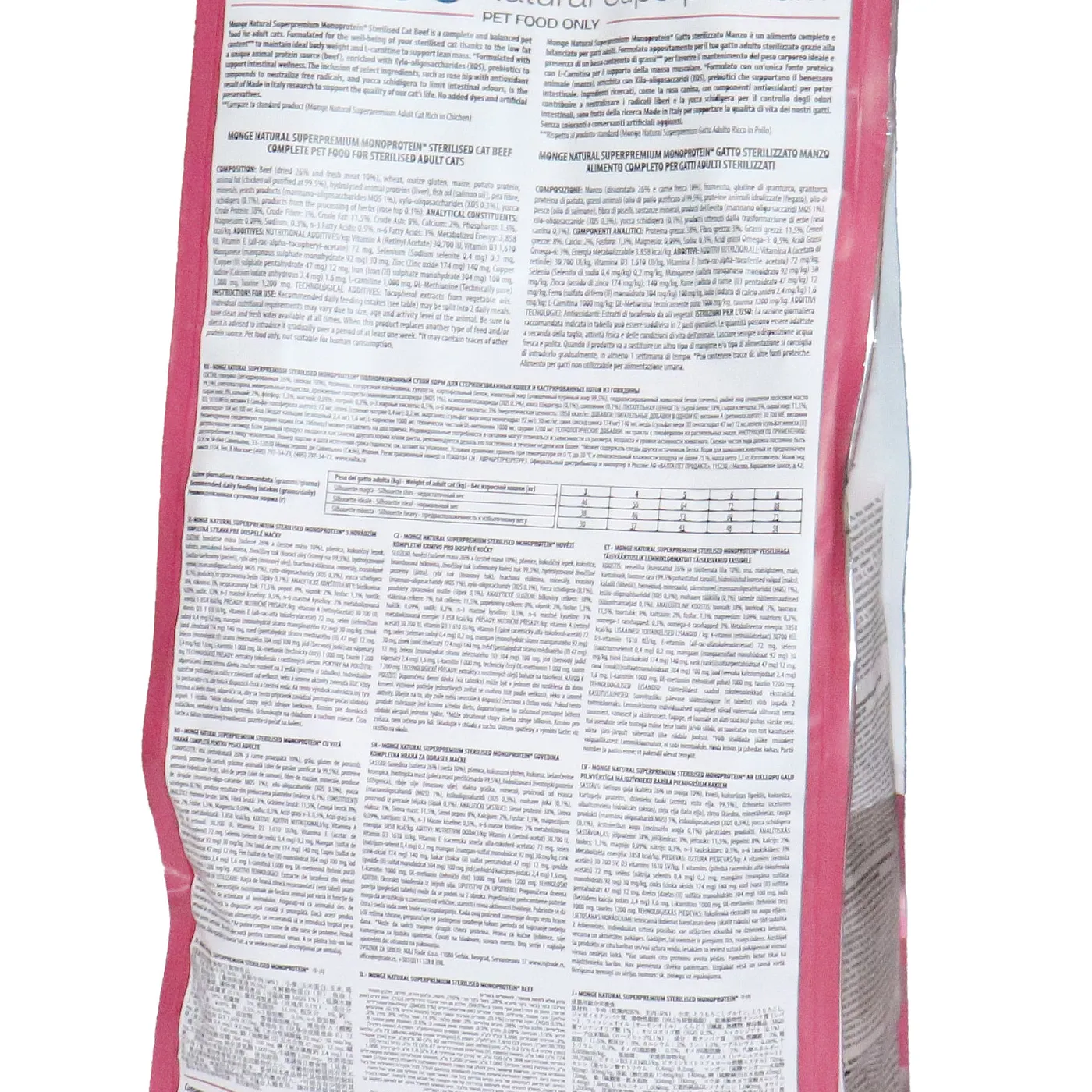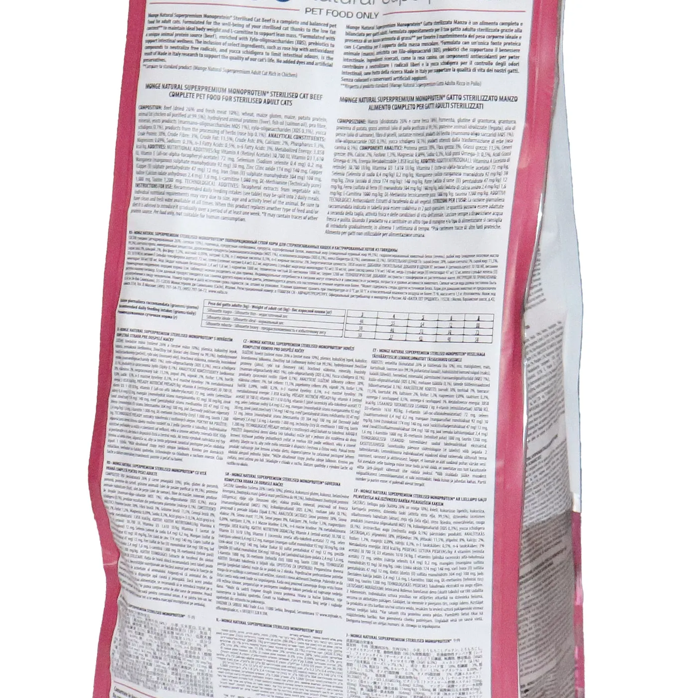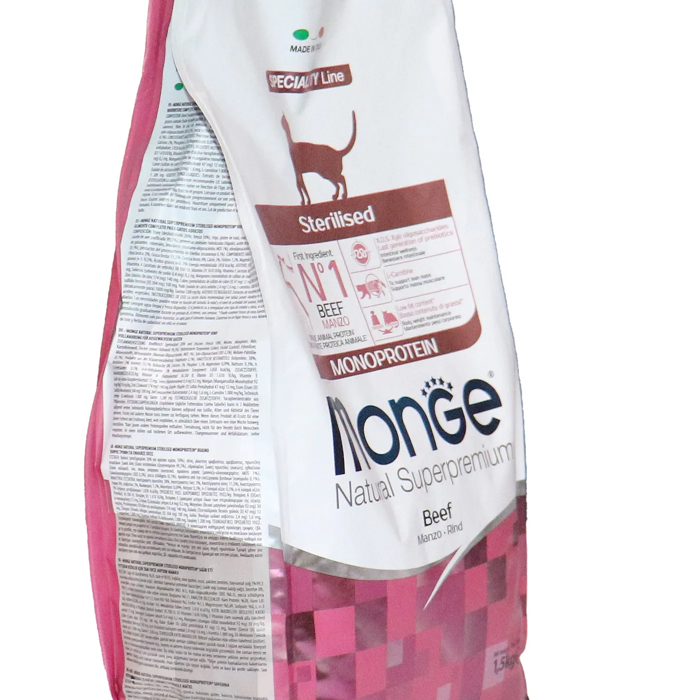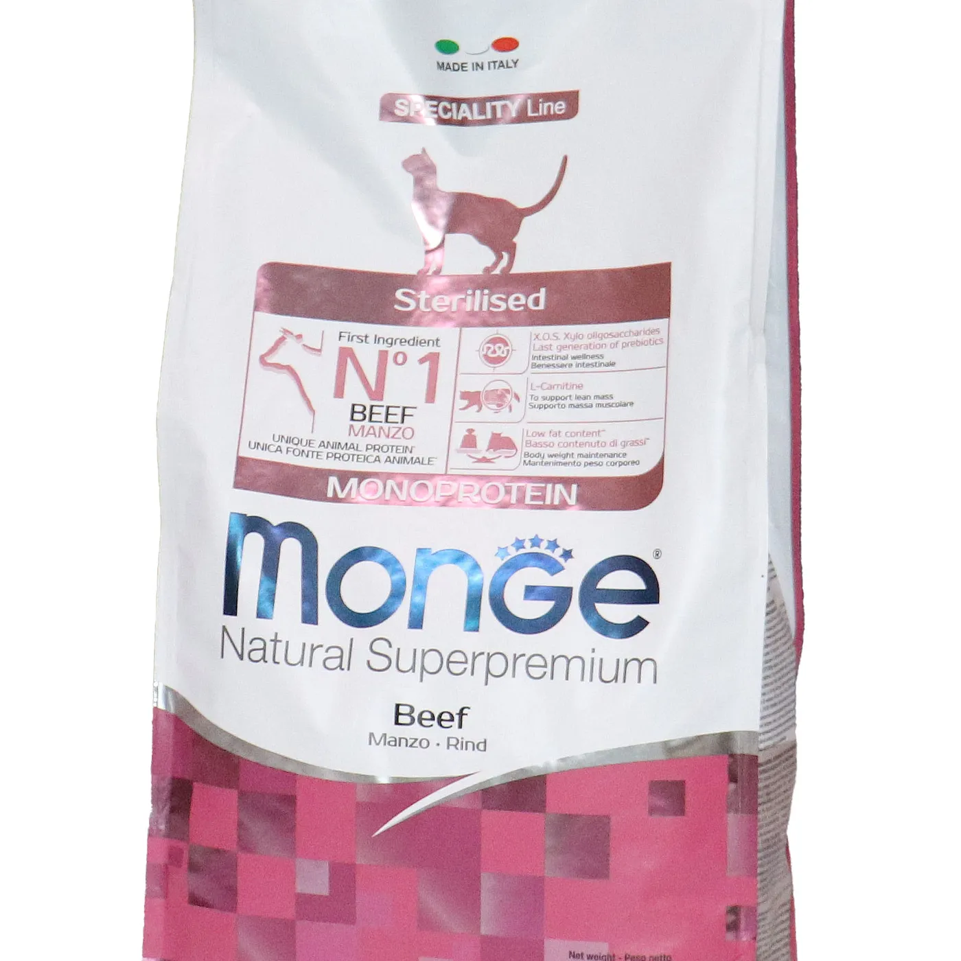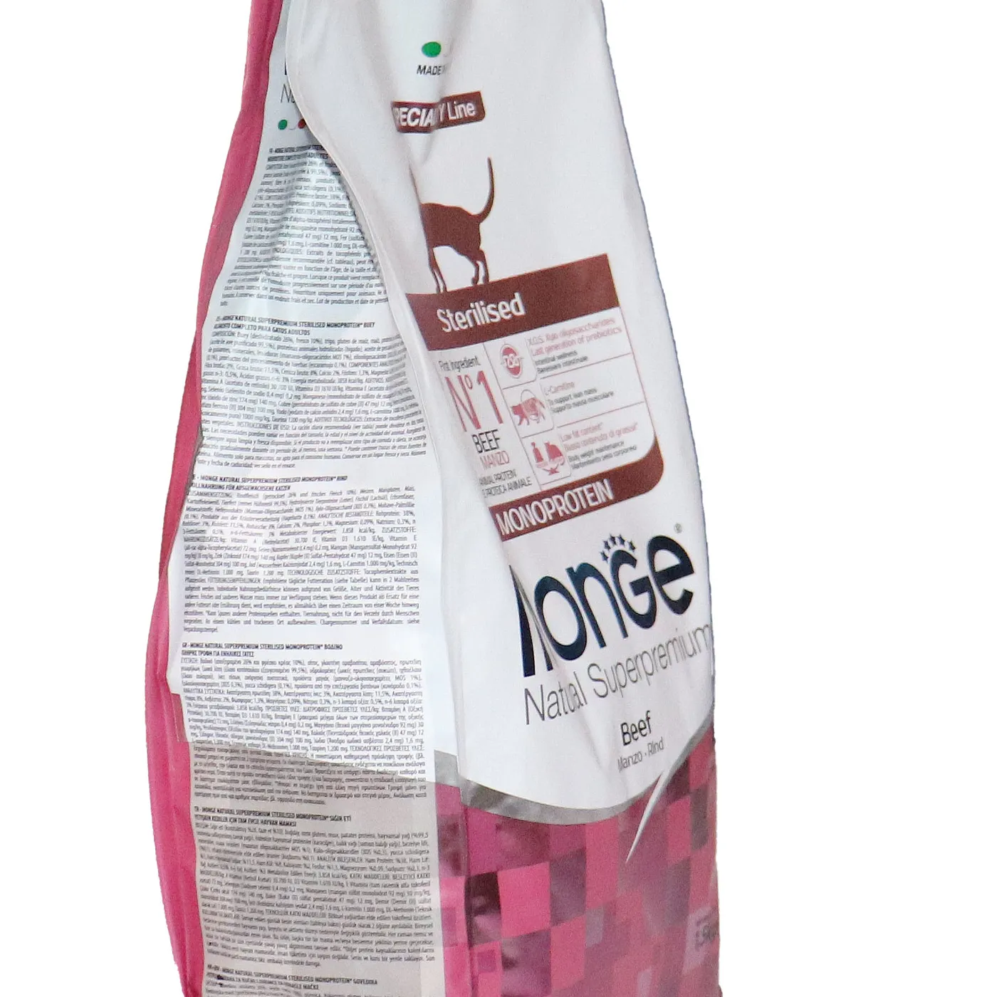 Сухой корм Monge Cat Speciality Line Monoprotein Sterilised — полнорационный рацион для стерилизованных кошек и кастрированных котов. Основной источник животного белка — говядина (дегидрированная 26%, свежая 10%). Формула содержит пониженное содержание жира (11,5%) и калорий (3858 ккал/кг), что способствует поддержанию веса. В состав включены пребиотики MOS и XOS для поддержания баланса кишечной микрофлоры, а также L-карнитин и таурин. Корм обогащён витамином E и селеном в качестве антиоксидантов. Не содержит ГМО, искусственных красителей и ароматизаторов.