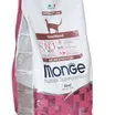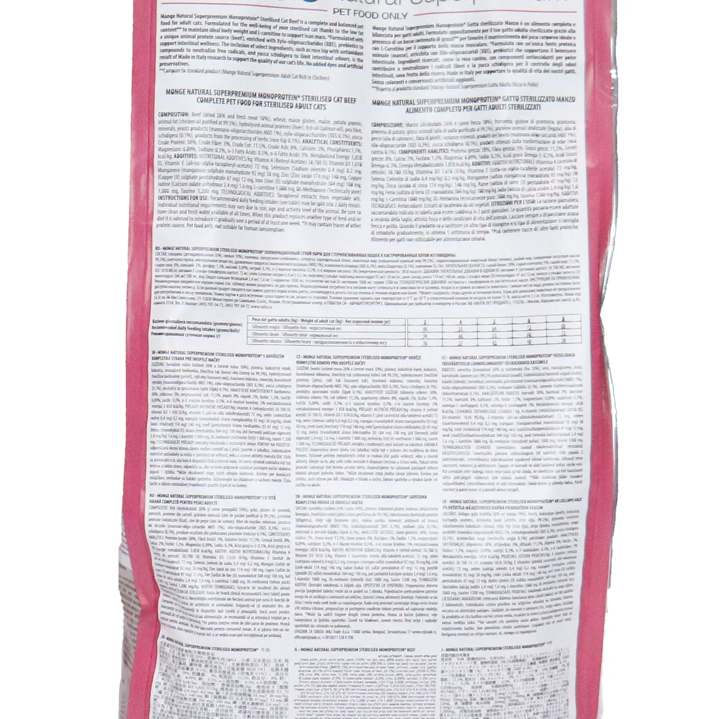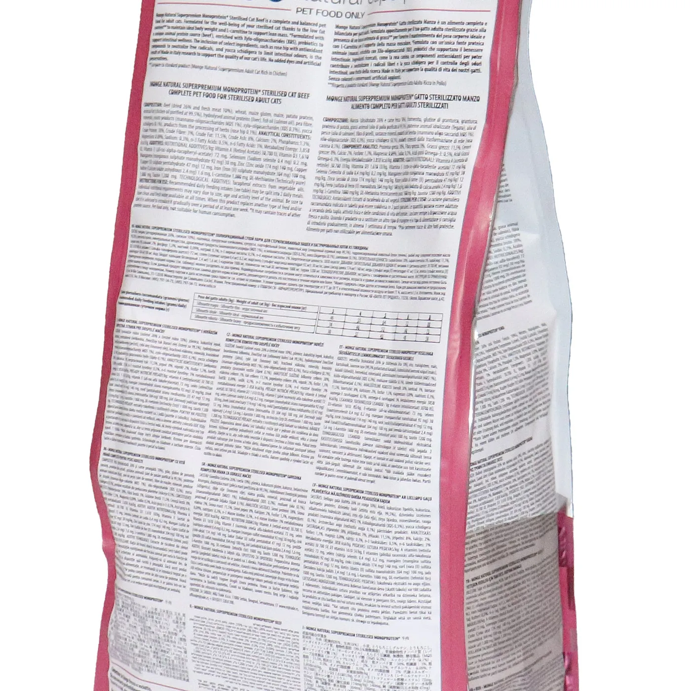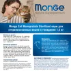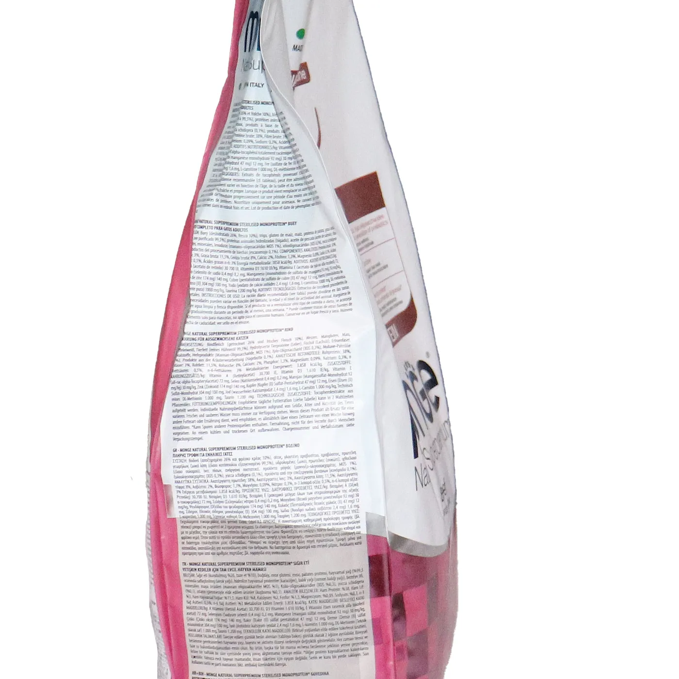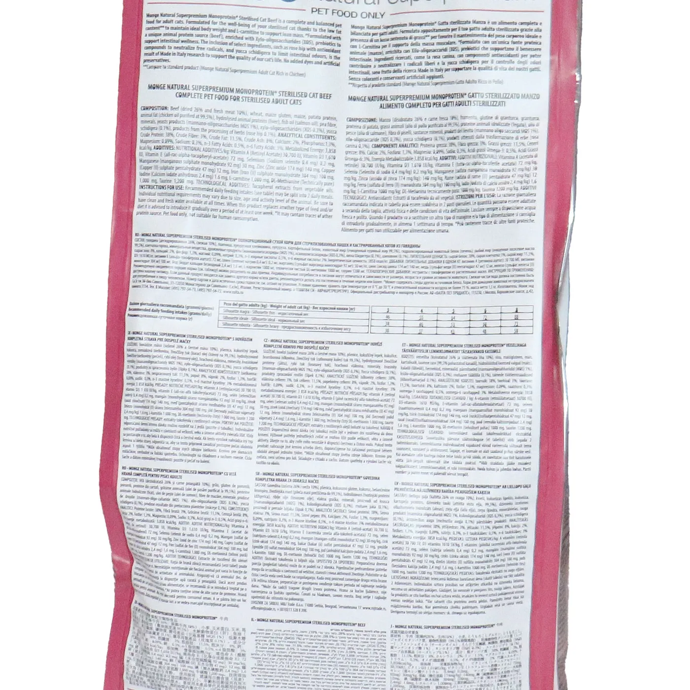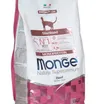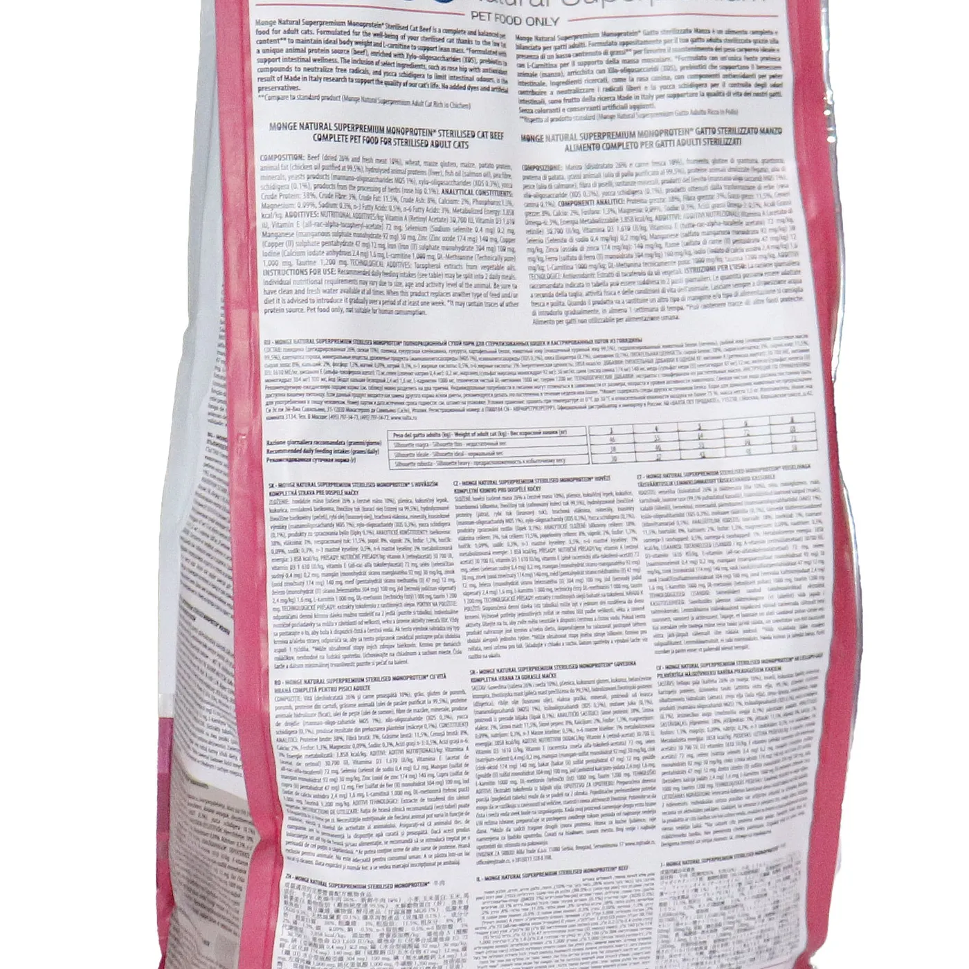 Сухой корм Monge Cat Speciality Line Monoprotein Sterilised — полнорационный рацион для стерилизованных кошек и кастрированных котов. Основной источник животного белка — говядина (дегидрированная 26%, свежая 10%). Формула содержит пониженное содержание жира (11,5%) и калорий (3858 ккал/кг), что способствует поддержанию веса. В состав включены пребиотики MOS и XOS для поддержания баланса кишечной микрофлоры, а также L-карнитин и таурин. Корм обогащён витамином E и селеном в качестве антиоксидантов. Не содержит ГМО, искусственных красителей и ароматизаторов.
