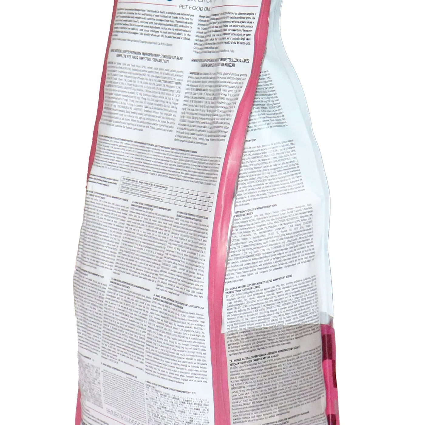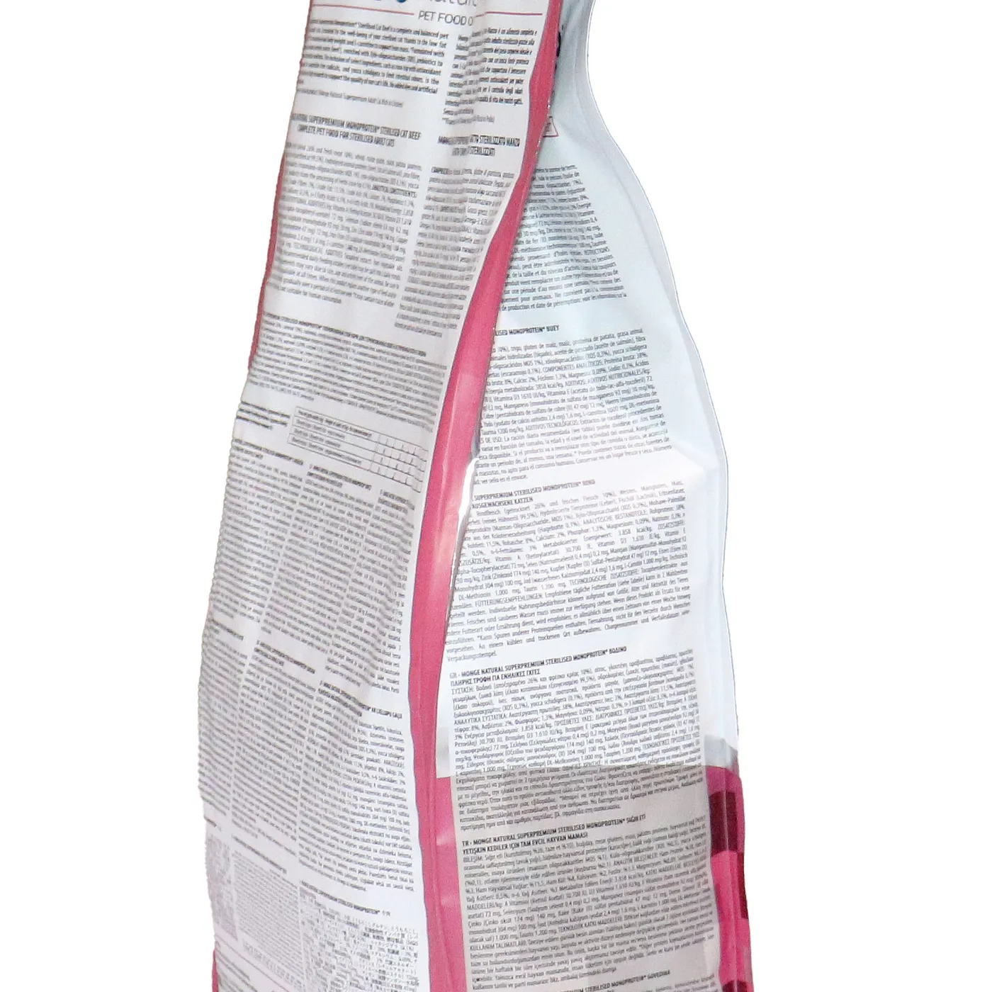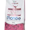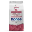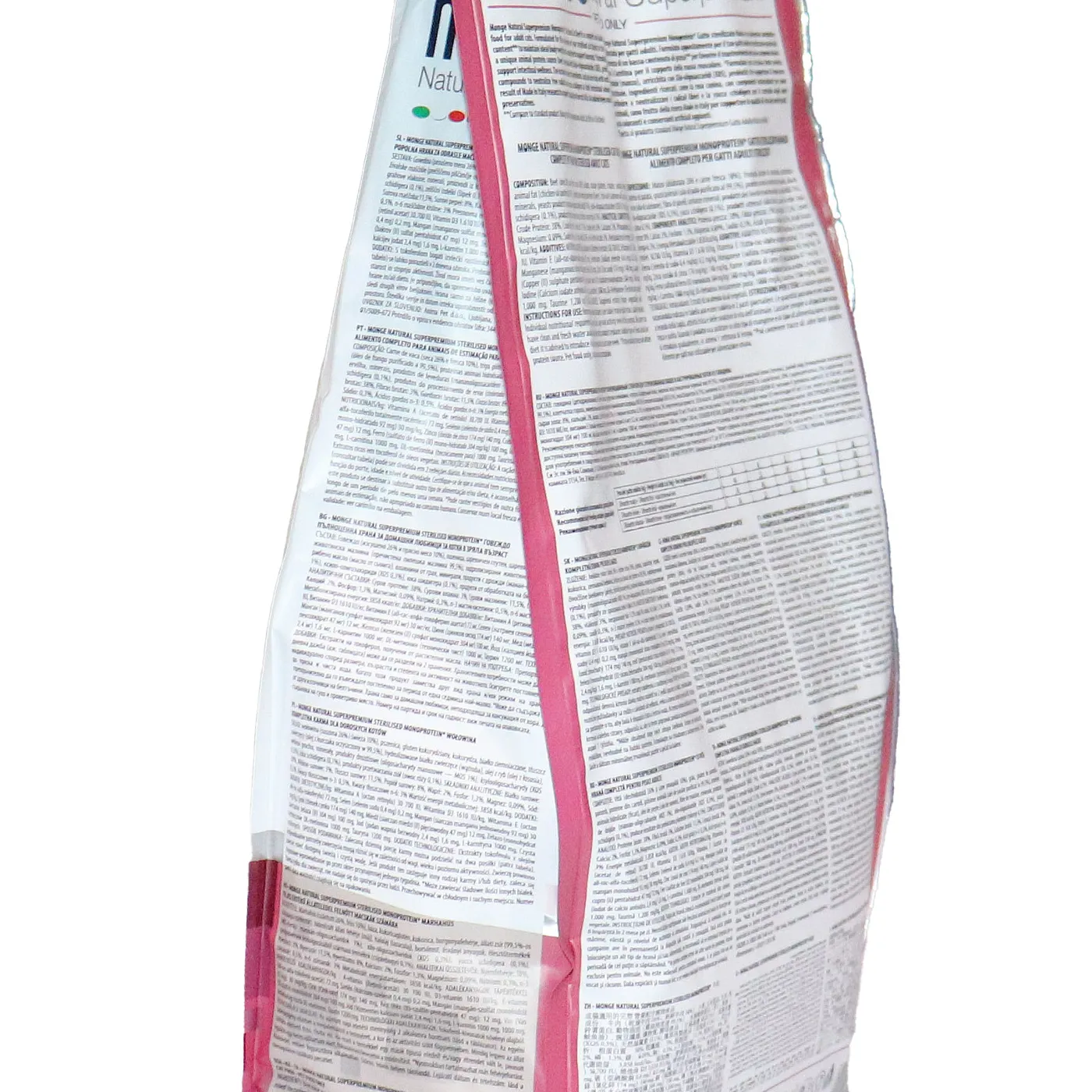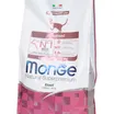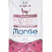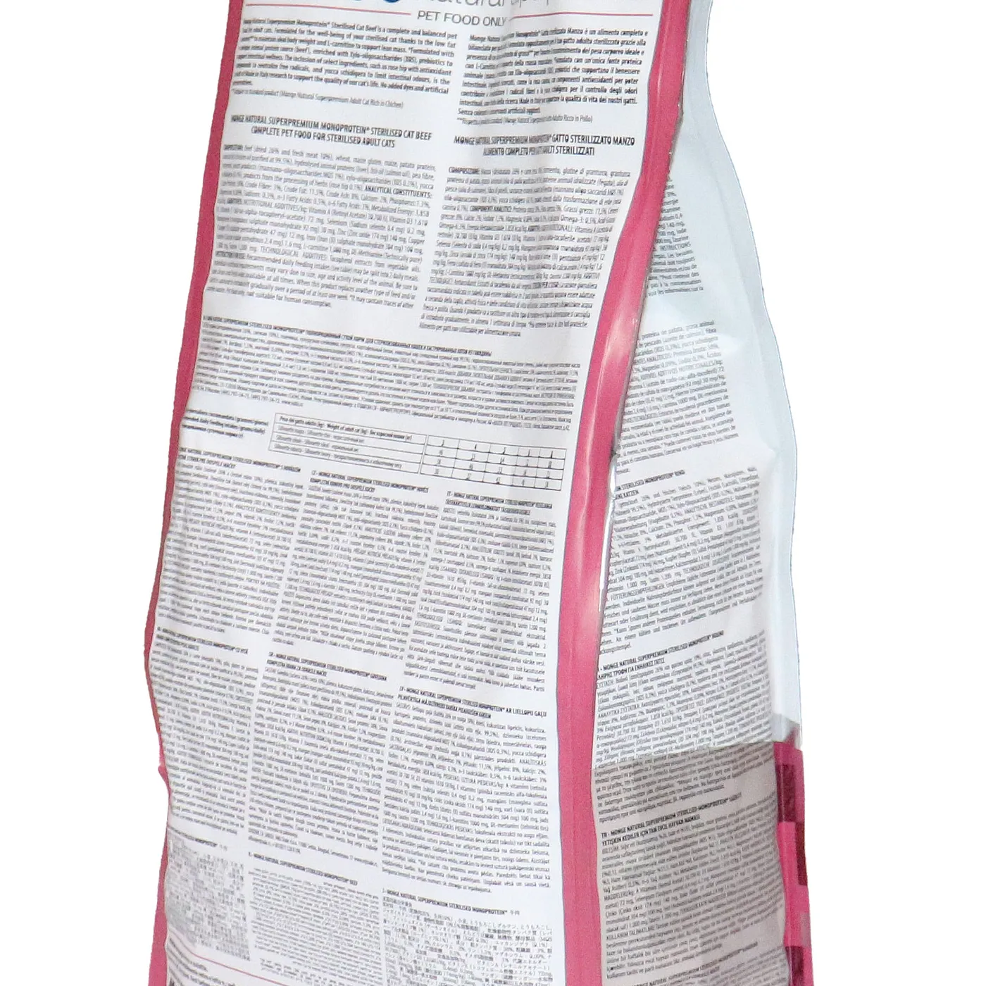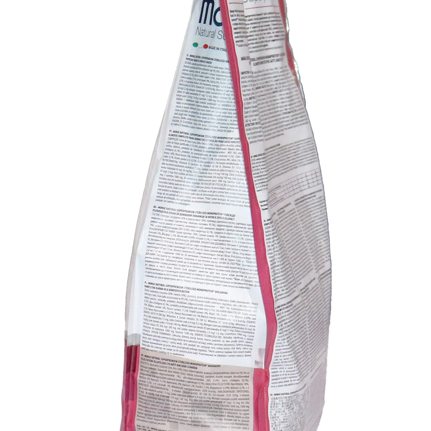 Сухой корм Monge Cat Speciality Line Monoprotein Sterilised — полнорационный рацион для стерилизованных кошек и кастрированных котов. Основной источник животного белка — говядина (дегидрированная 26%, свежая 10%). Формула содержит пониженное содержание жира (11,5%) и калорий (3858 ккал/кг), что способствует поддержанию веса. В состав включены пребиотики MOS и XOS для поддержания баланса кишечной микрофлоры, а также L-карнитин и таурин. Корм обогащён витамином E и селеном в качестве антиоксидантов. Не содержит ГМО, искусственных красителей и ароматизаторов.