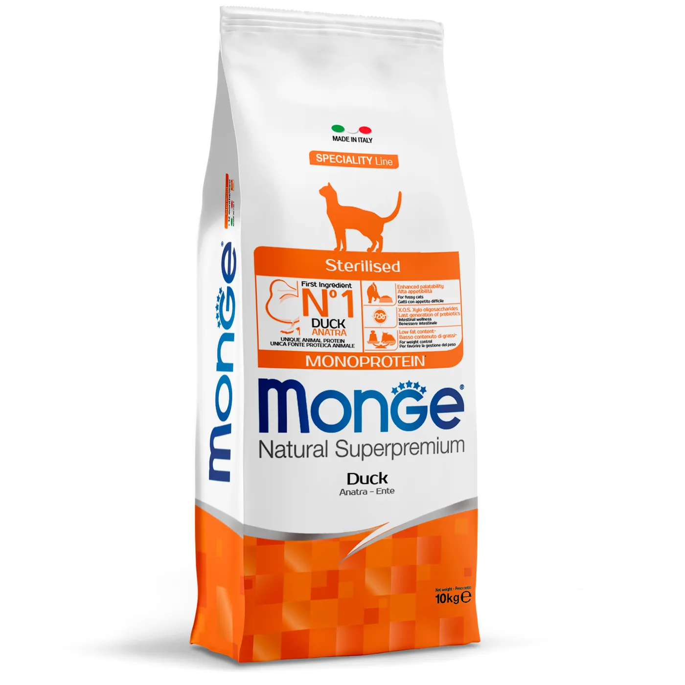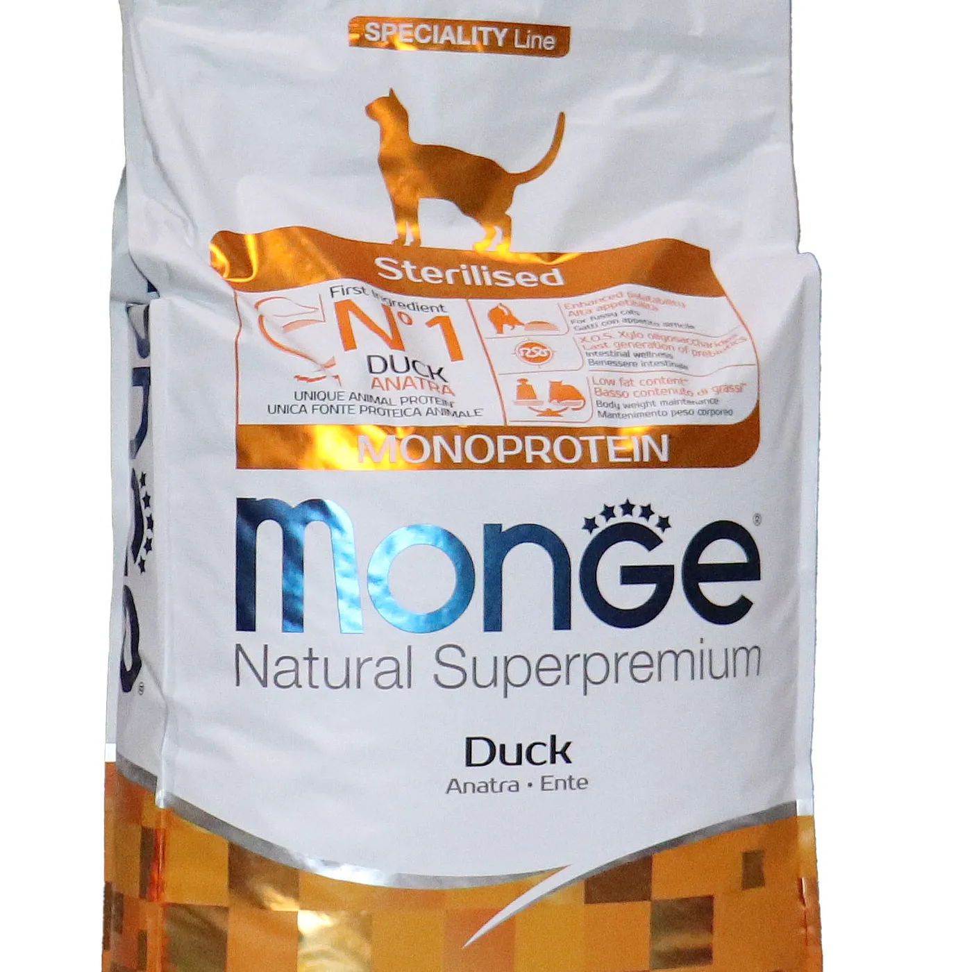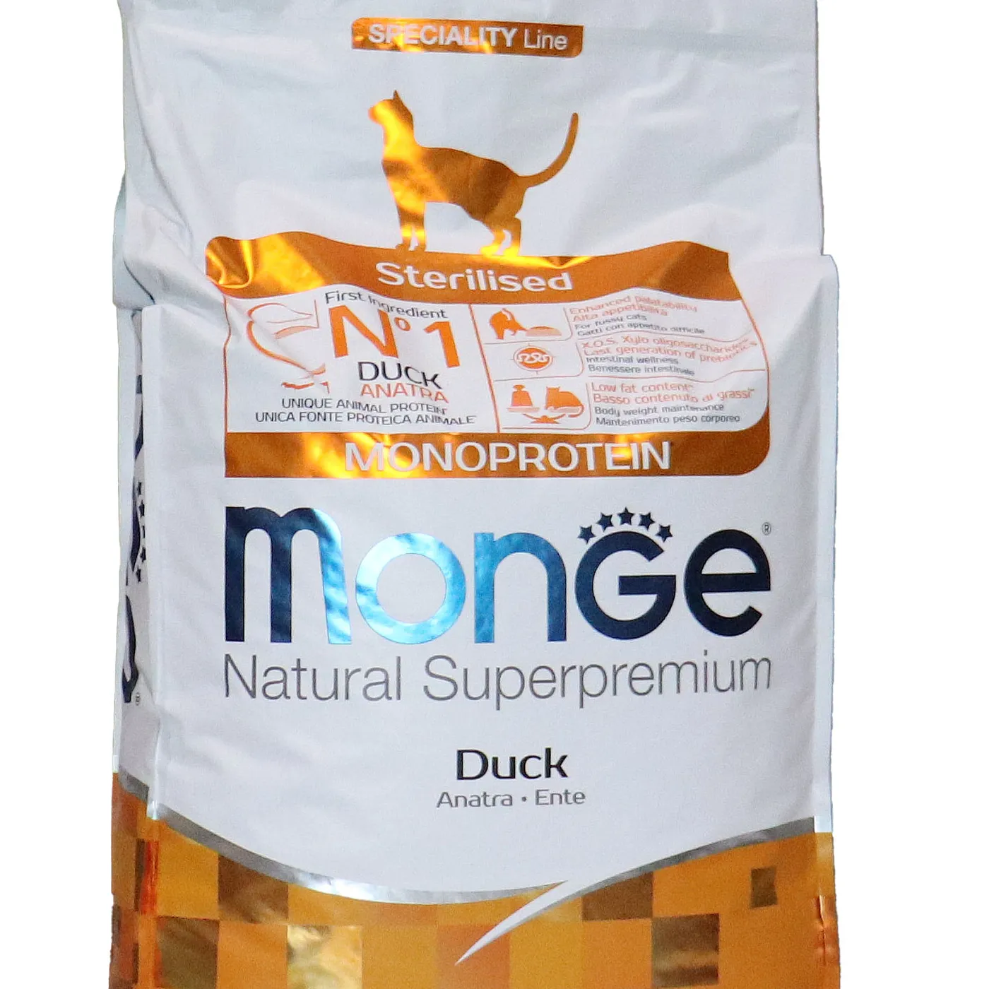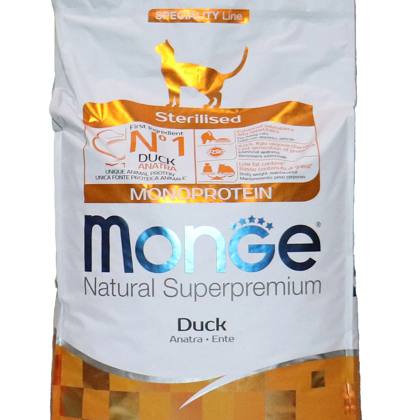 Сухой корм Monge Cat Speciality Line Monoprotein Sterilised — полнорационный рацион для стерилизованных кошек и кастрированных котов. Основной источник животного белка — мясо утки (дегидрированное и свежее). Формула содержит пониженное количество жира и калорий, что способствует поддержанию веса. В состав включены пребиотики MOS и XOS для поддержания баланса кишечной микрофлоры, а также витамин Е в качестве антиоксиданта. Корм не содержит искусственных красителей, ароматизаторов и ГМО.