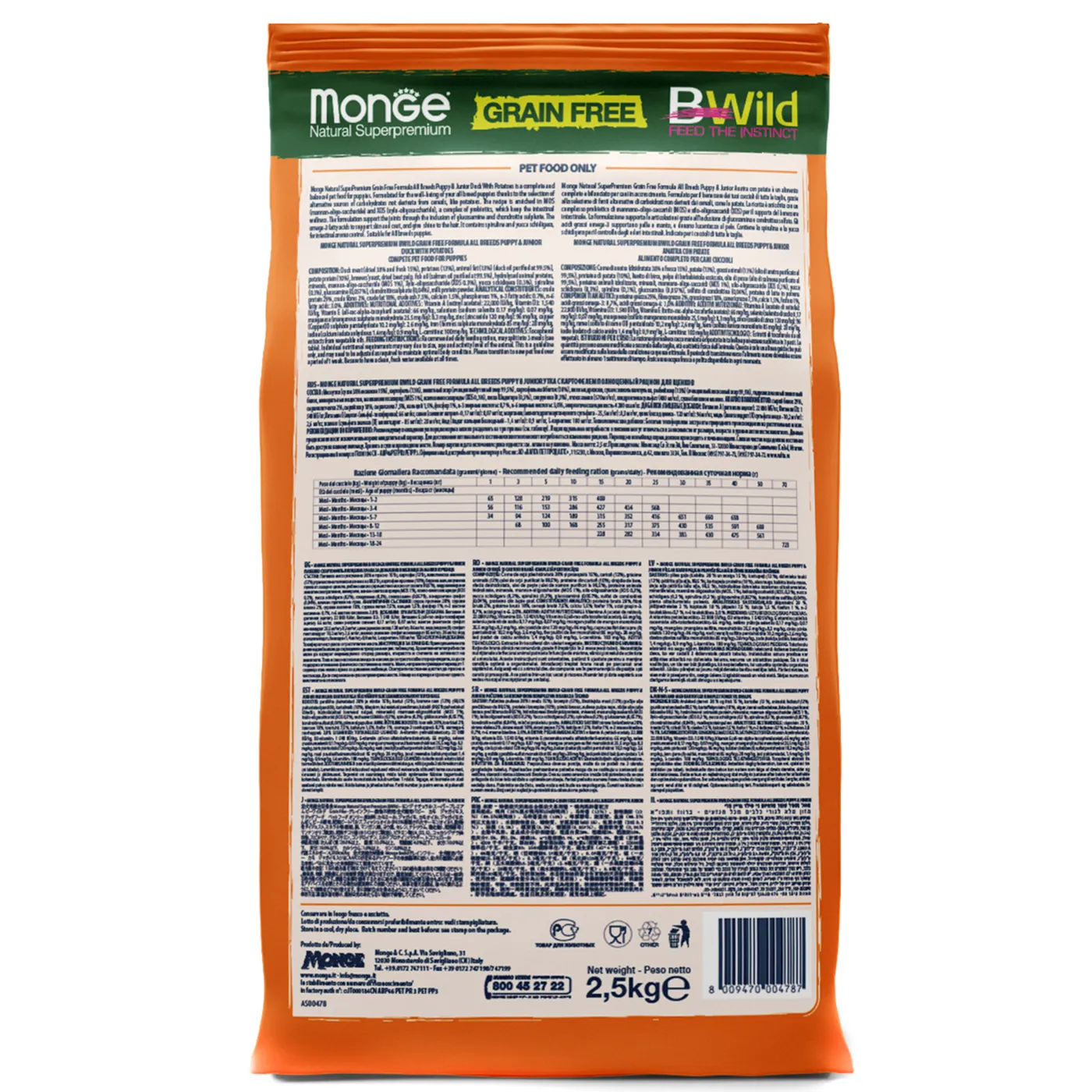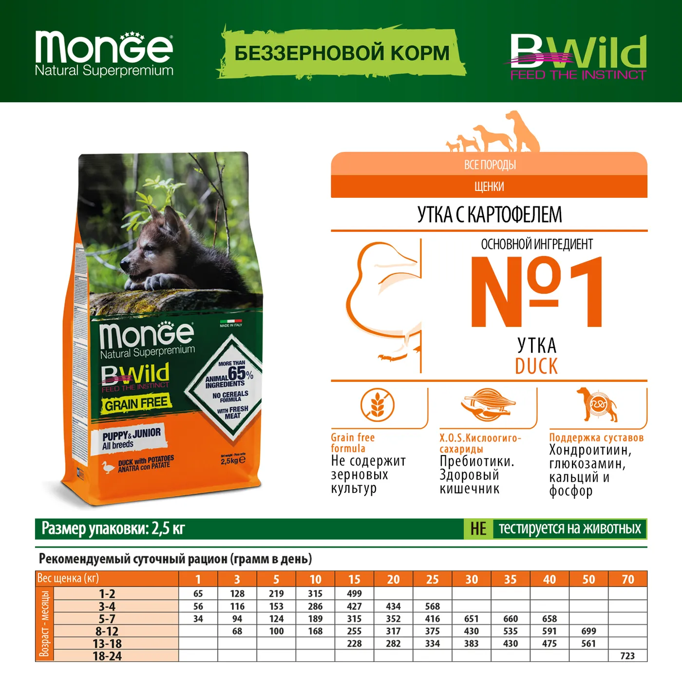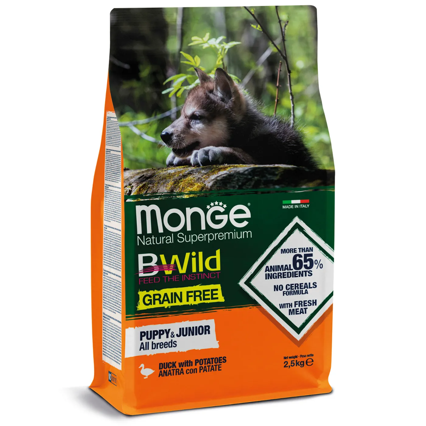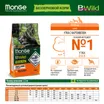 Сухой корм Monge Dog BWild GRAIN FREE Puppy & Junior предназначен для щенков всех пород в возрасте от 1 до 12 месяцев. Рецептура основана на мясе утки (свежем и дегидрированном) и картофеле как источнике углеводов, что соответствует беззерновой концепции. Состав включает глюкозамин и хондроитин для поддержки суставов, а также комплекс жирных кислот Омега-3 и Омега-6. Корм содержит пребиотики MOS и XOS, а также L-карнитин.