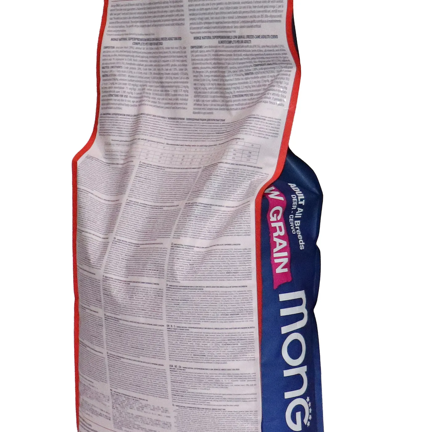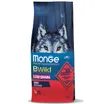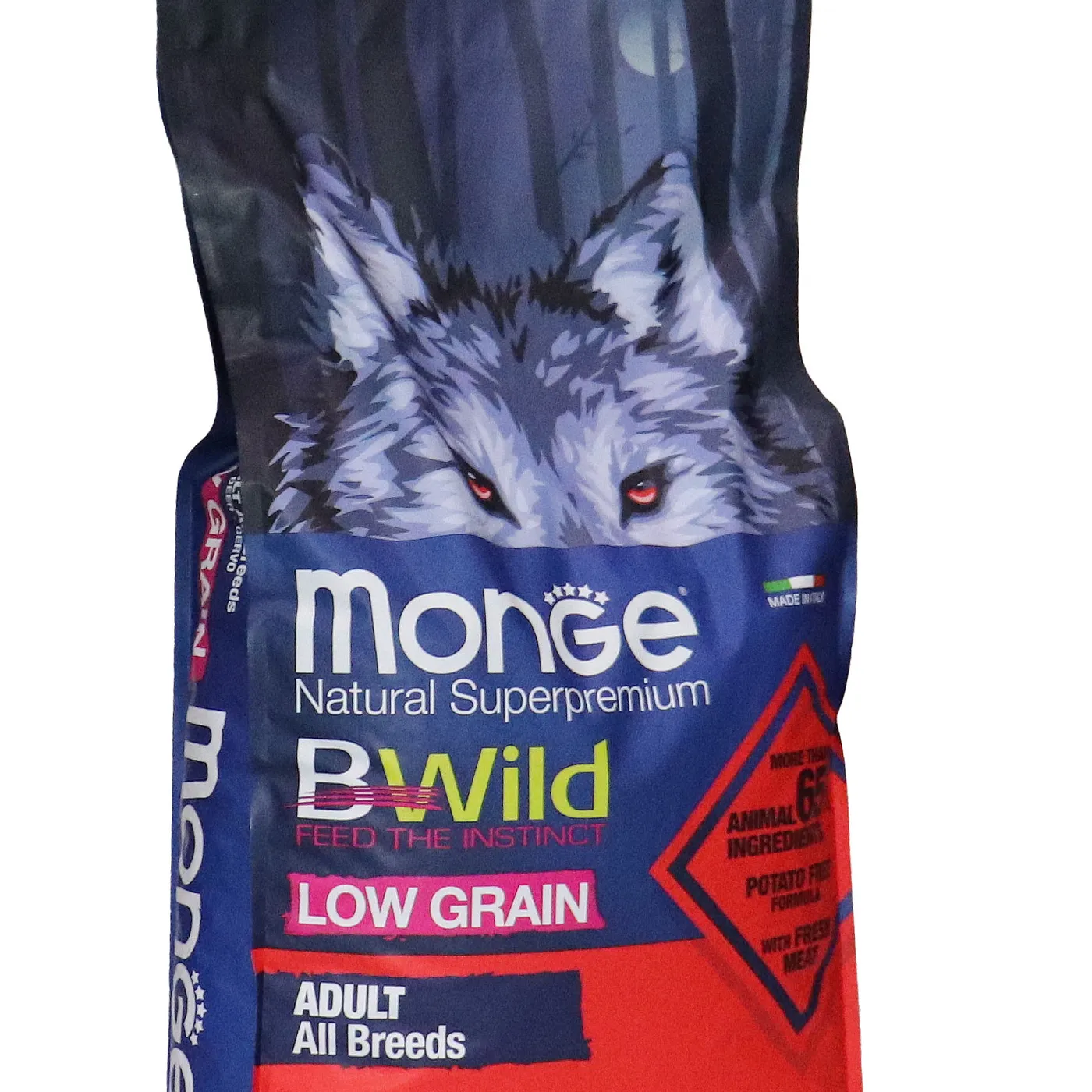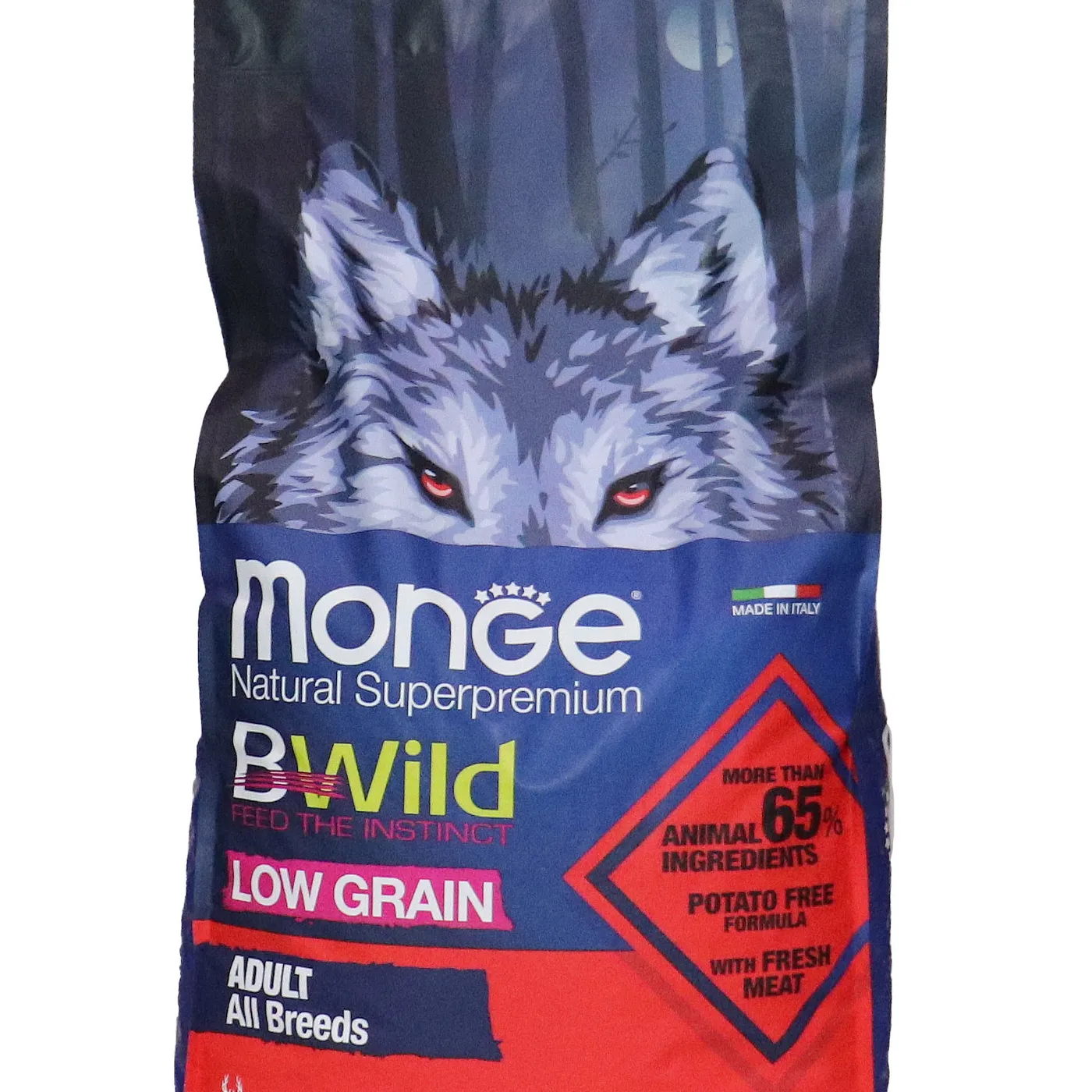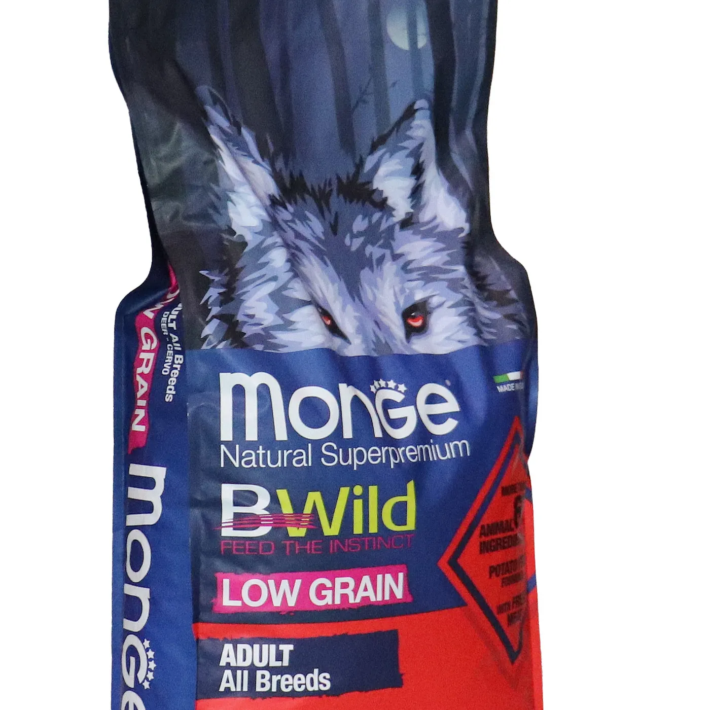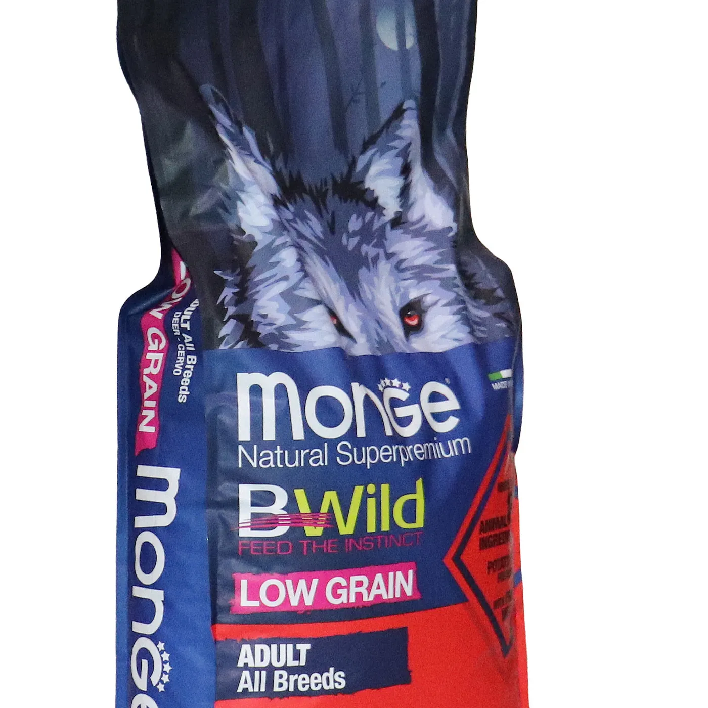 Сухой корм Monge Dog BWild LOW GRAIN для взрослых собак всех пород. Рецепт на основе дегидрированного мяса оленя (38%) и свежего куриного мяса (12%). Формула с низким содержанием злаков (овес 4%), без картофеля. Содержит пребиотики М.О.S и Х.О.S для поддержания баланса кишечной микрофлоры, а также хондроитин и глюкозамин. В состав включены лесные ягоды (черника, клюква, малина) и семена льна как источники клетчатки и жирных кислот. Энергетическая ценность составляет 4170 ккал/кг.