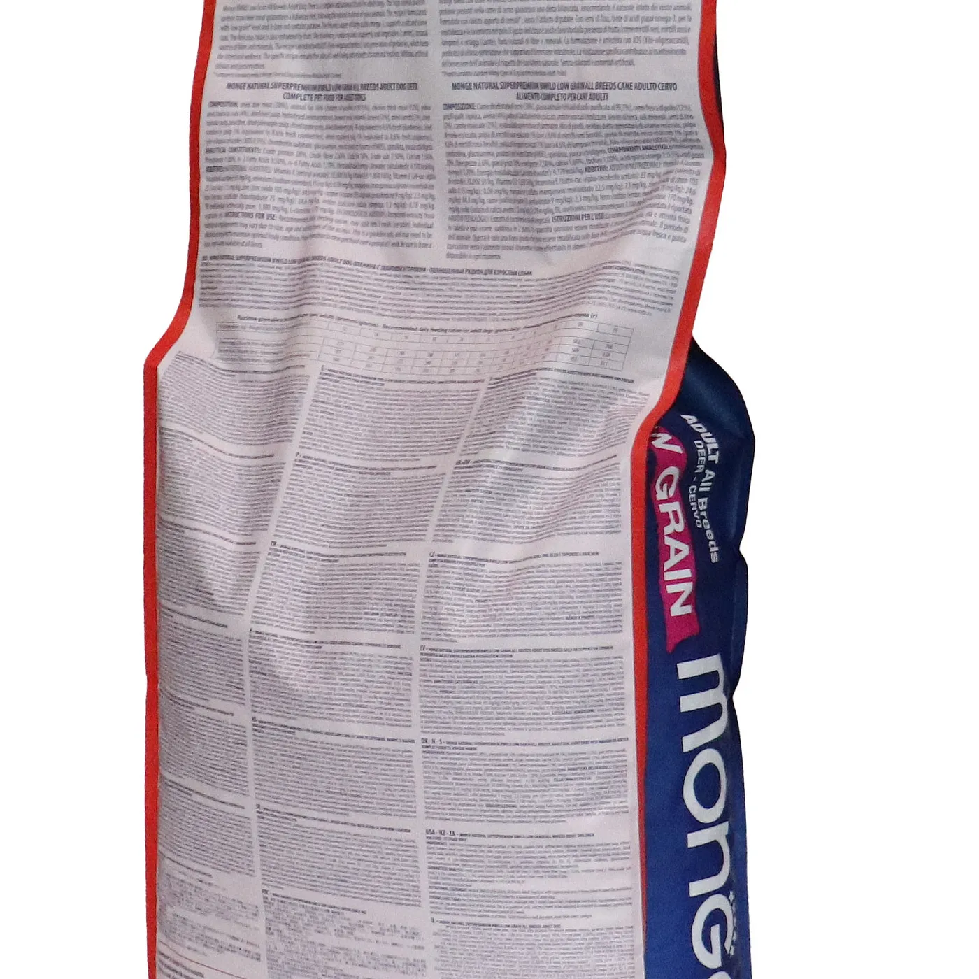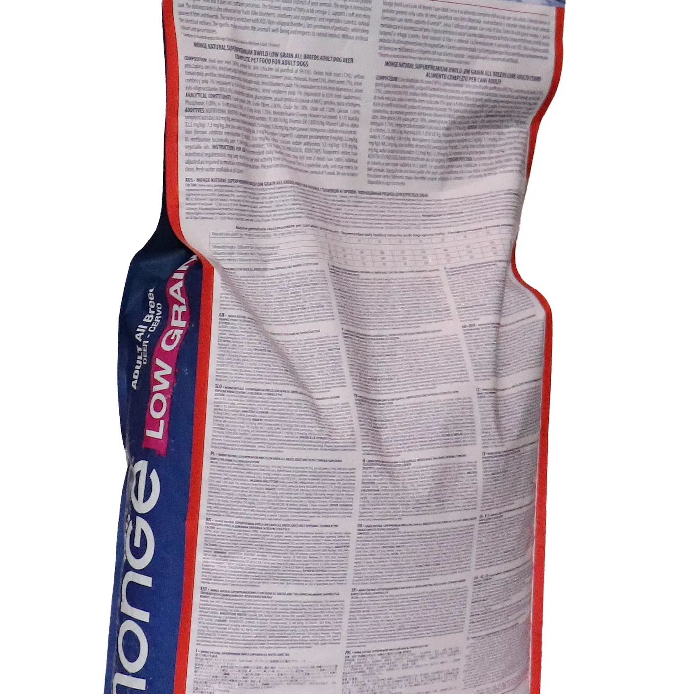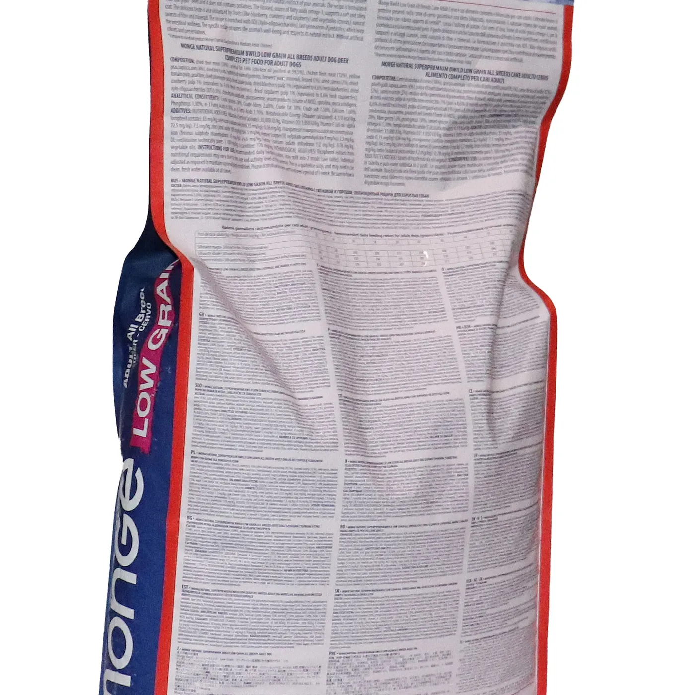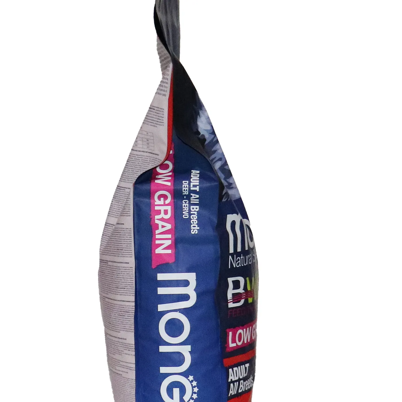 Сухой корм Monge Dog BWild LOW GRAIN для взрослых собак всех пород. Рецепт на основе дегидрированного мяса оленя (38%) и свежего куриного мяса (12%). Формула с низким содержанием злаков (овес 4%), без картофеля. Содержит пребиотики М.О.S и Х.О.S для поддержания баланса кишечной микрофлоры, а также хондроитин и глюкозамин. В состав включены лесные ягоды (черника, клюква, малина) и семена льна как источники клетчатки и жирных кислот. Энергетическая ценность составляет 4170 ккал/кг.