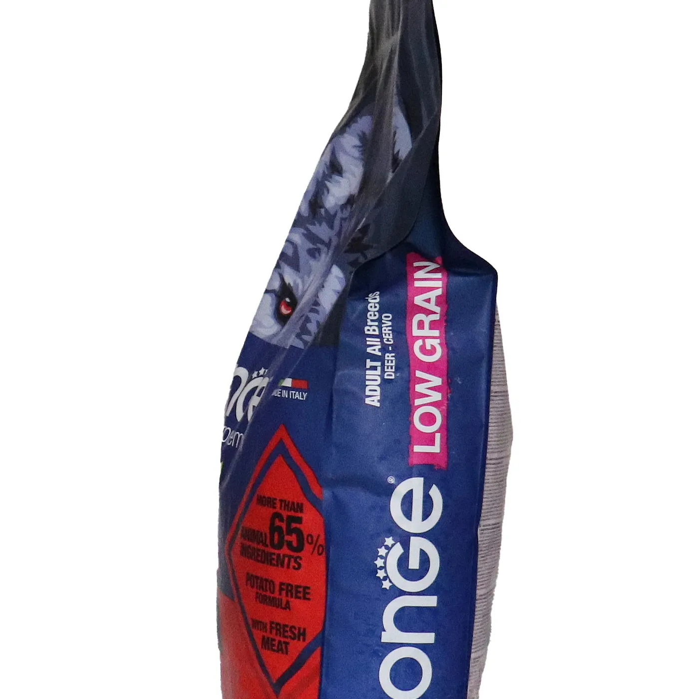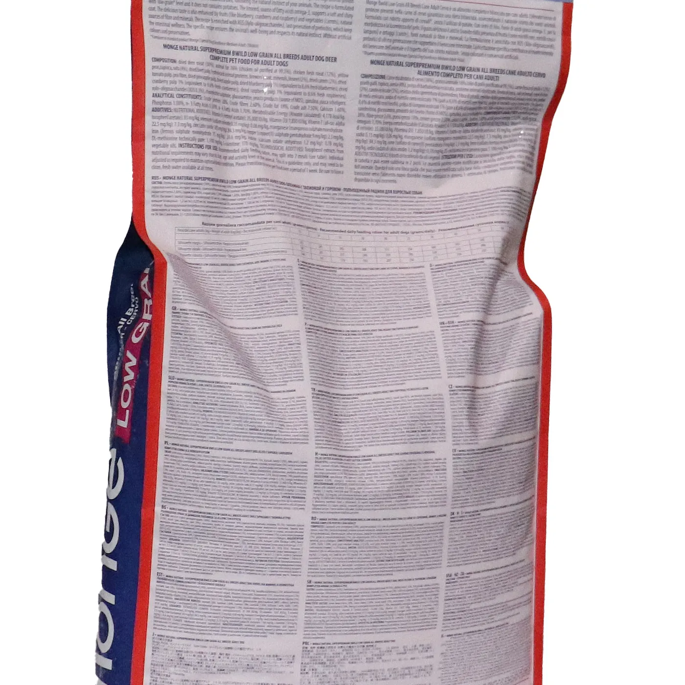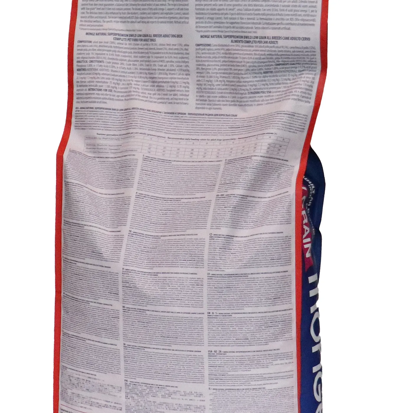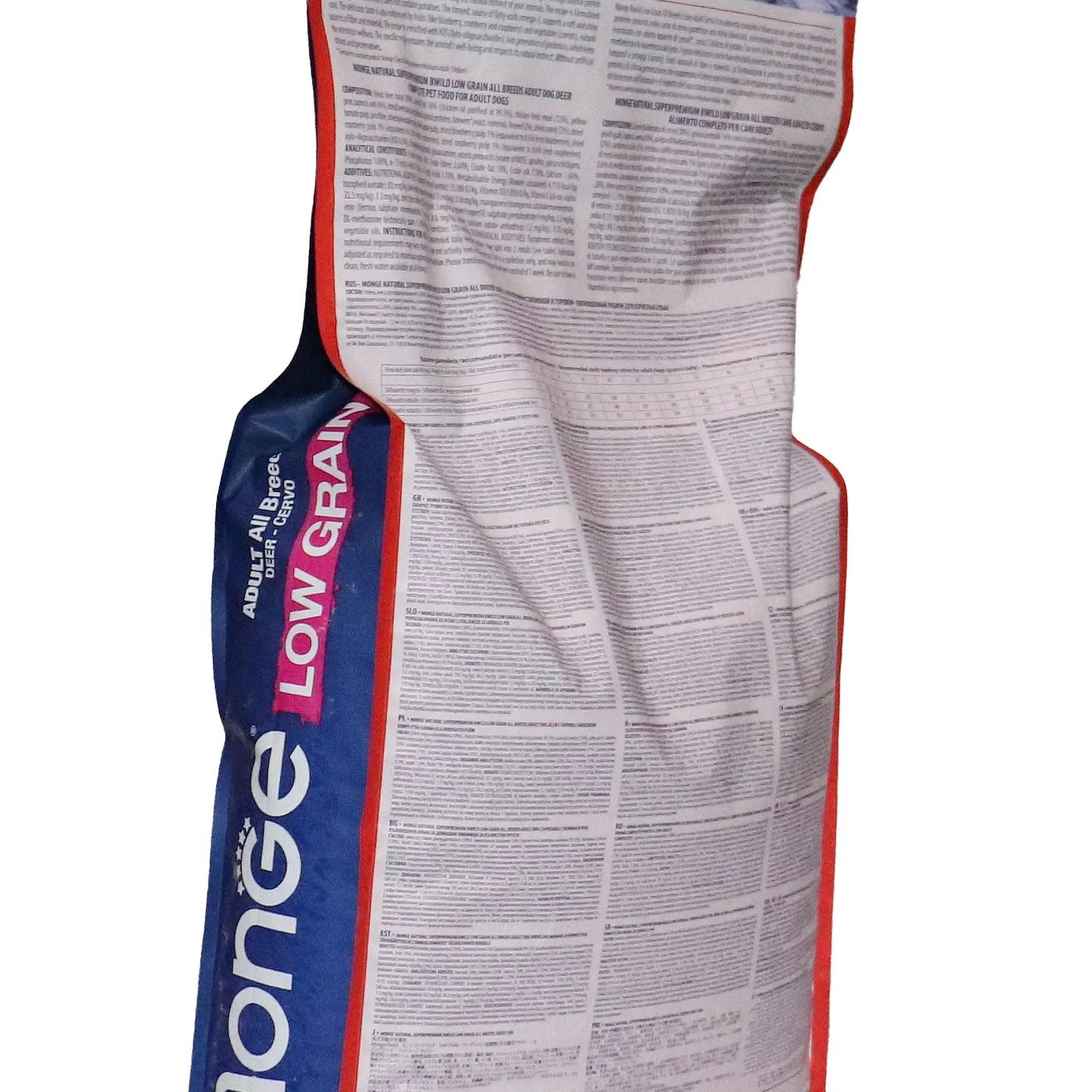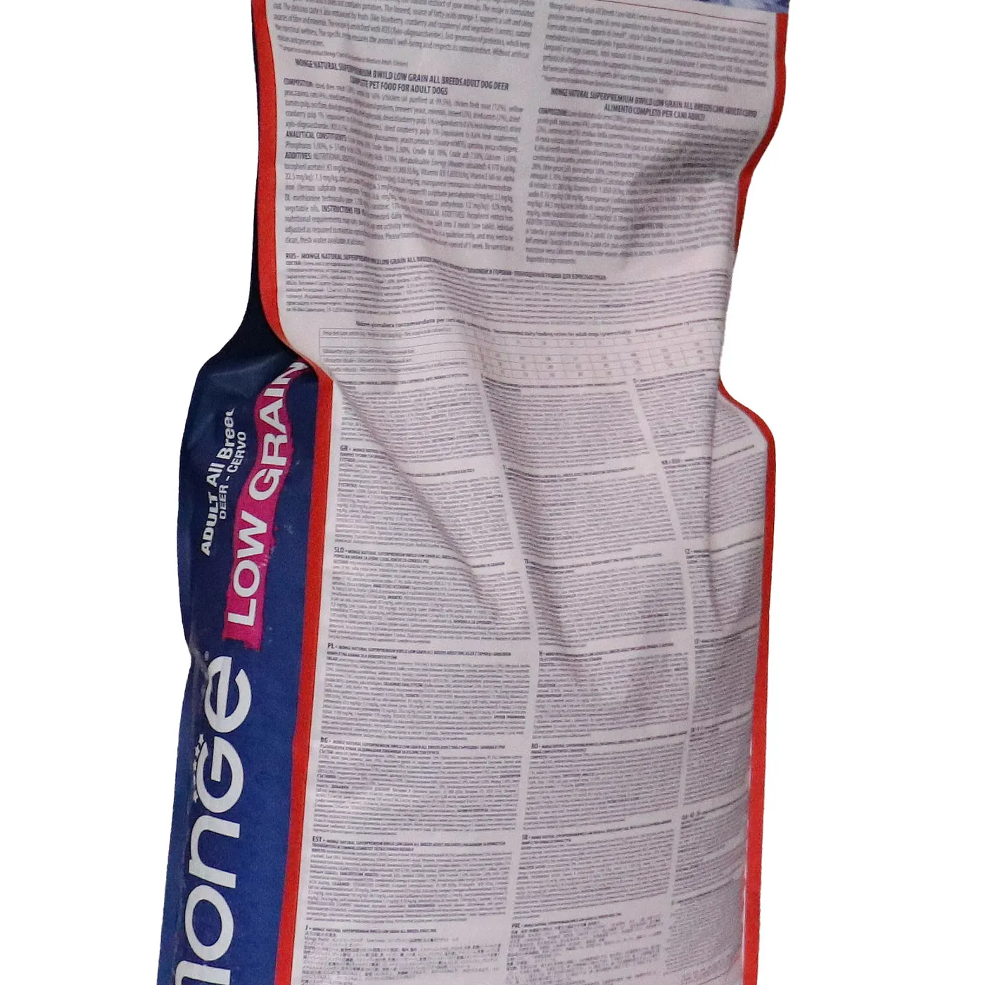 Сухой корм Monge Dog BWild LOW GRAIN для взрослых собак всех пород. Рецепт на основе дегидрированного мяса оленя (38%) и свежего куриного мяса (12%). Формула с низким содержанием злаков (овес 4%), без картофеля. Содержит пребиотики М.О.S и Х.О.S для поддержания баланса кишечной микрофлоры, а также хондроитин и глюкозамин. В состав включены лесные ягоды (черника, клюква, малина) и семена льна как источники клетчатки и жирных кислот. Энергетическая ценность составляет 4170 ккал/кг.