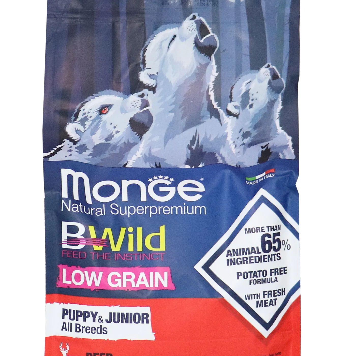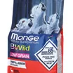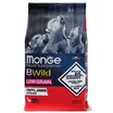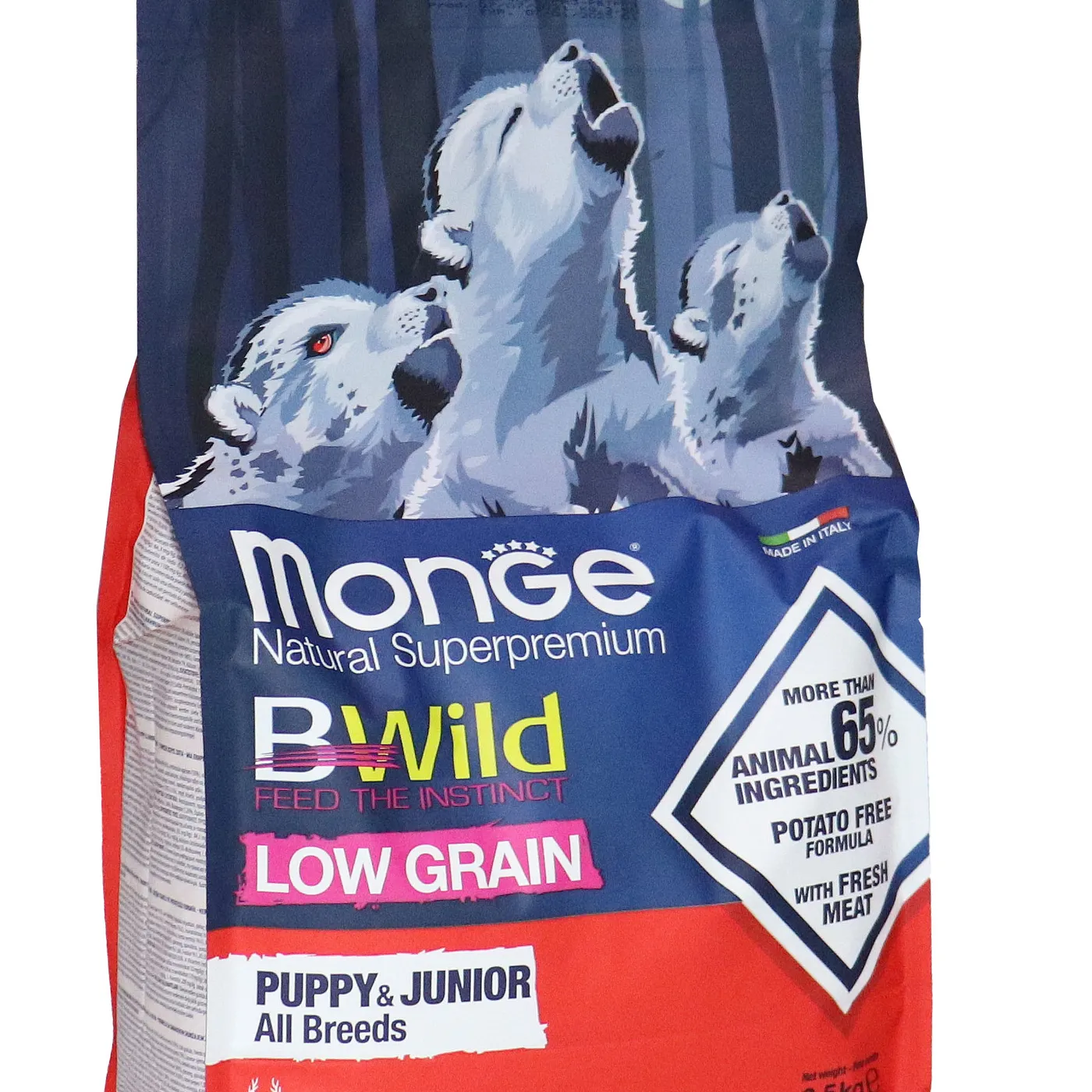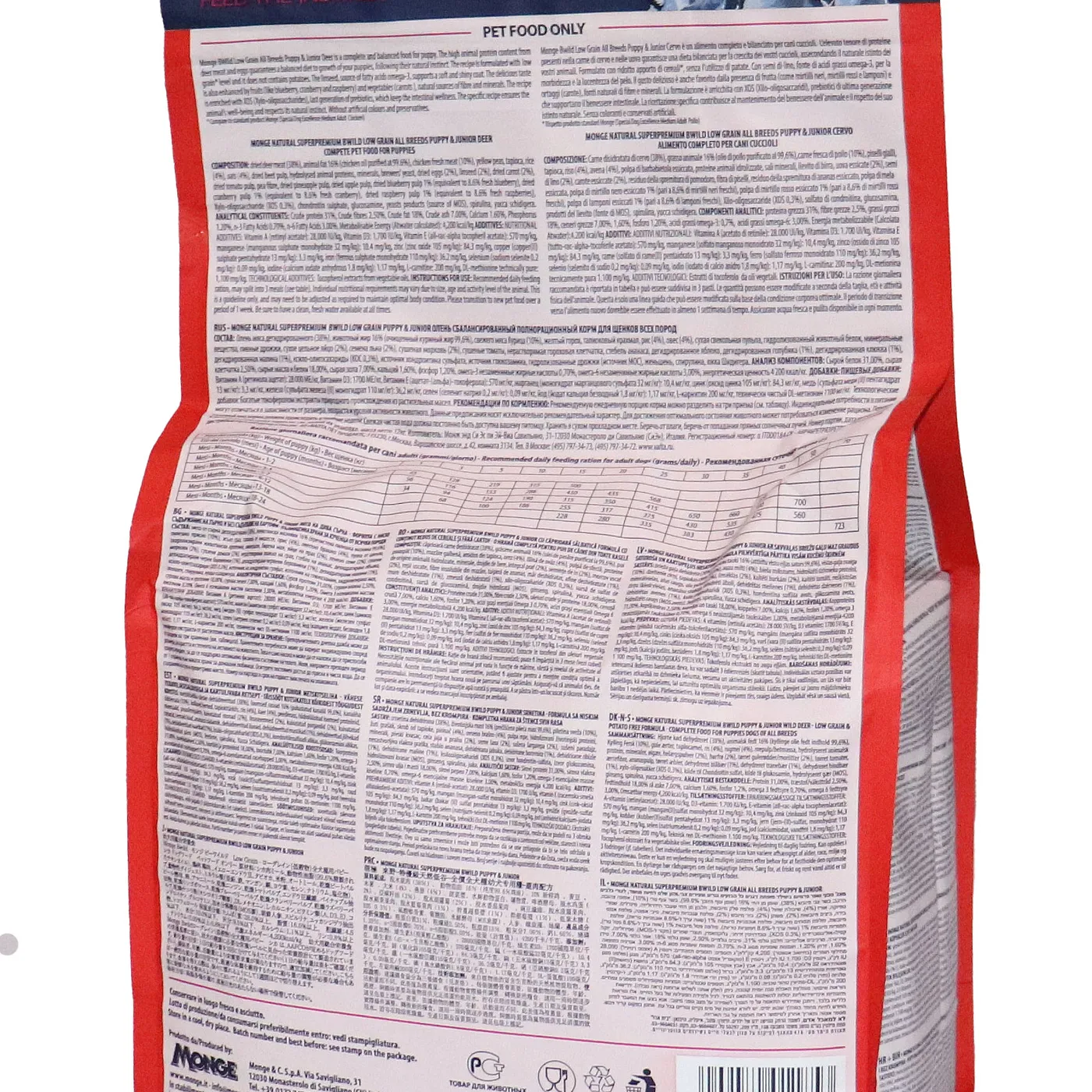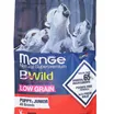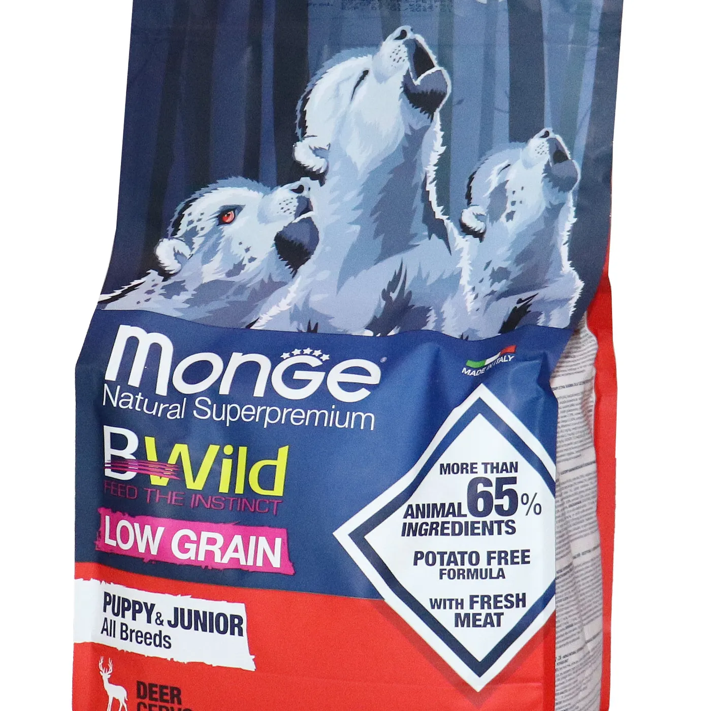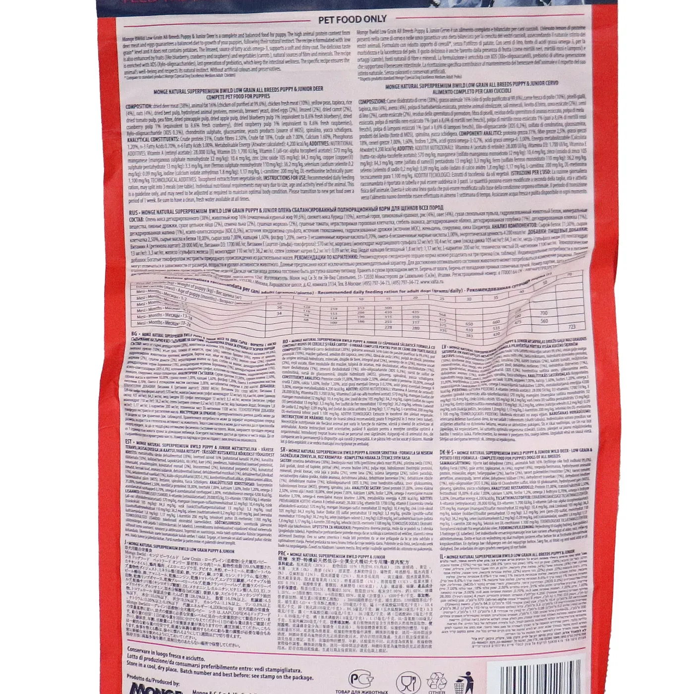 Сухой корм Monge Dog BWild LOW GRAIN Puppy & Junior — полнорационный рацион для щенков всех пород в возрасте от 1 до 12 месяцев. Основным источником белка является дегидрированное мясо оленя (38%) и свежее куриное мясо (10%). Рецептура относится к категории низкозерновых, содержит рис и овес, но не включает картофель. В состав включены пребиотики MOS и XOS для поддержания баланса кишечной микрофлоры, а также хондроитин и глюкозамин. Формула обогащена жирными кислотами Омега-3 и Омега-6, лесными ягодами и травами как источниками натуральной клетчатки.