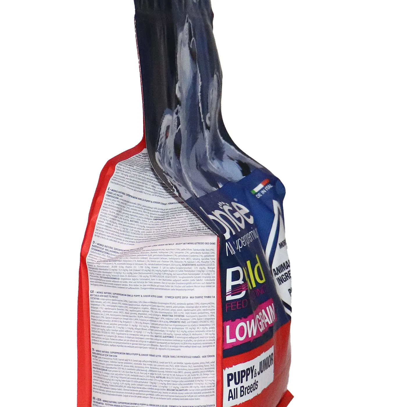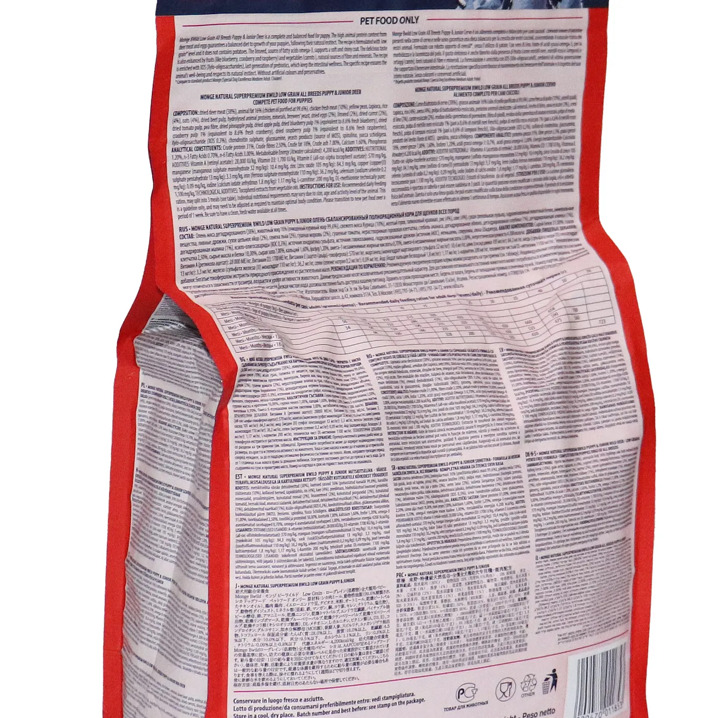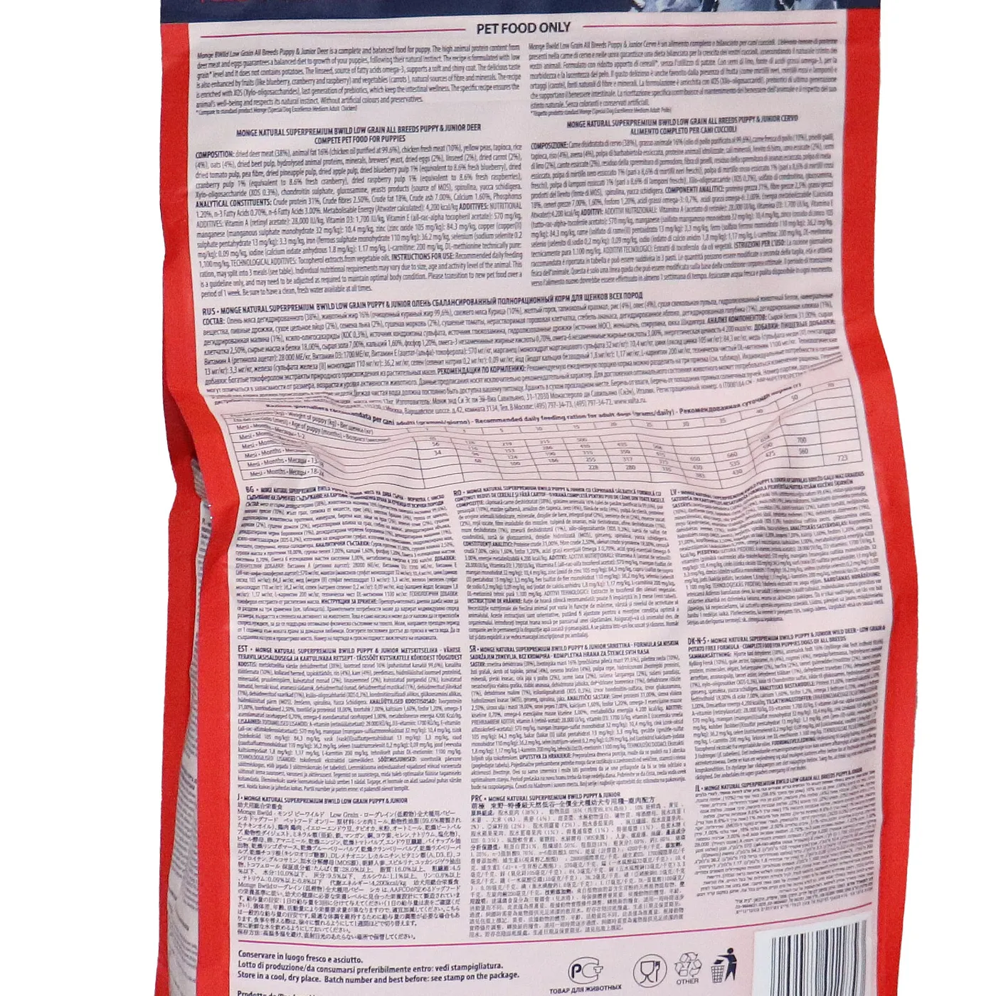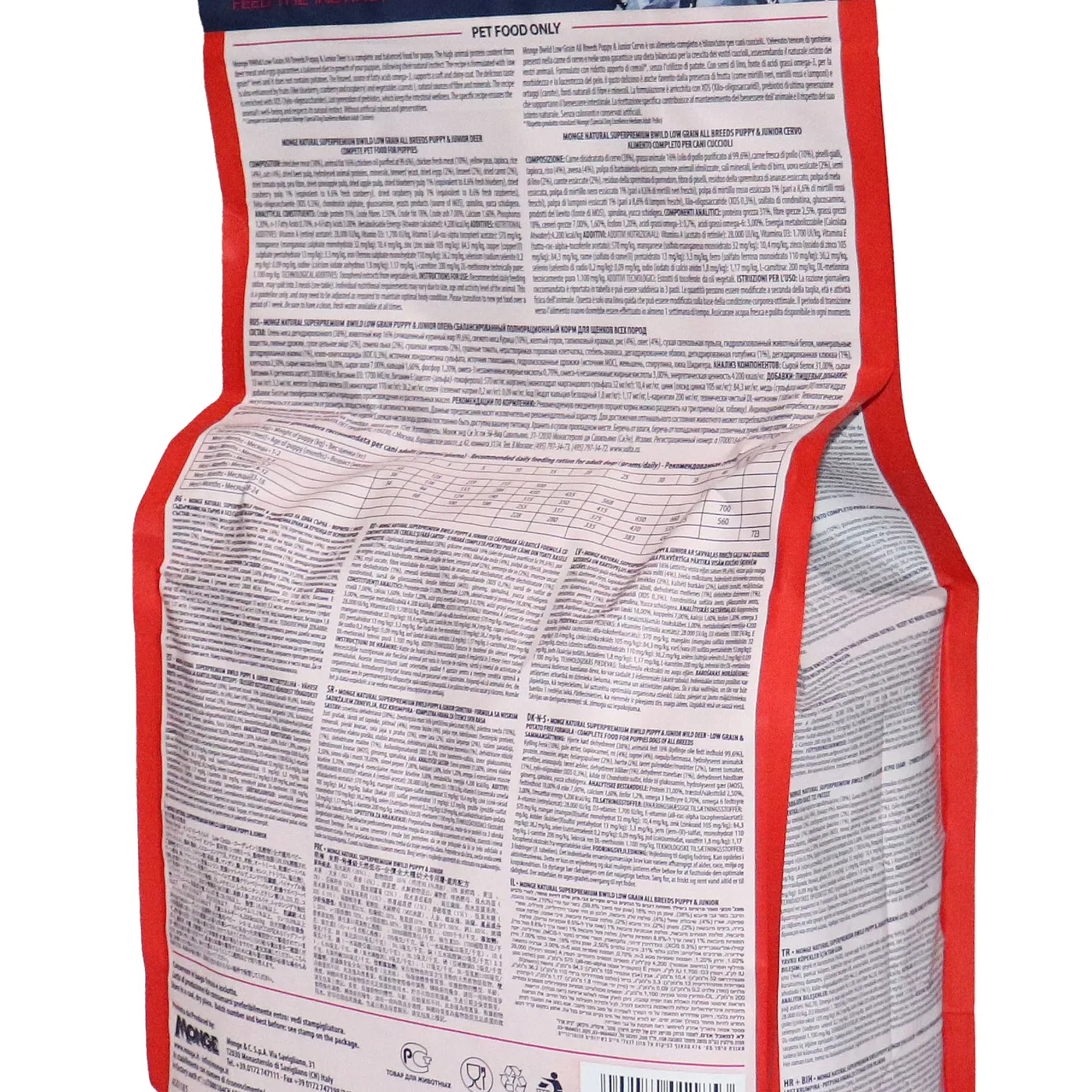 Сухой корм Monge Dog BWild LOW GRAIN Puppy & Junior — полнорационный рацион для щенков всех пород в возрасте от 1 до 12 месяцев. Основным источником белка является дегидрированное мясо оленя (38%) и свежее куриное мясо (10%). Рецептура относится к категории низкозерновых, содержит рис и овес, но не включает картофель. В состав включены пребиотики MOS и XOS для поддержания баланса кишечной микрофлоры, а также хондроитин и глюкозамин. Формула обогащена жирными кислотами Омега-3 и Омега-6, лесными ягодами и травами как источниками натуральной клетчатки.