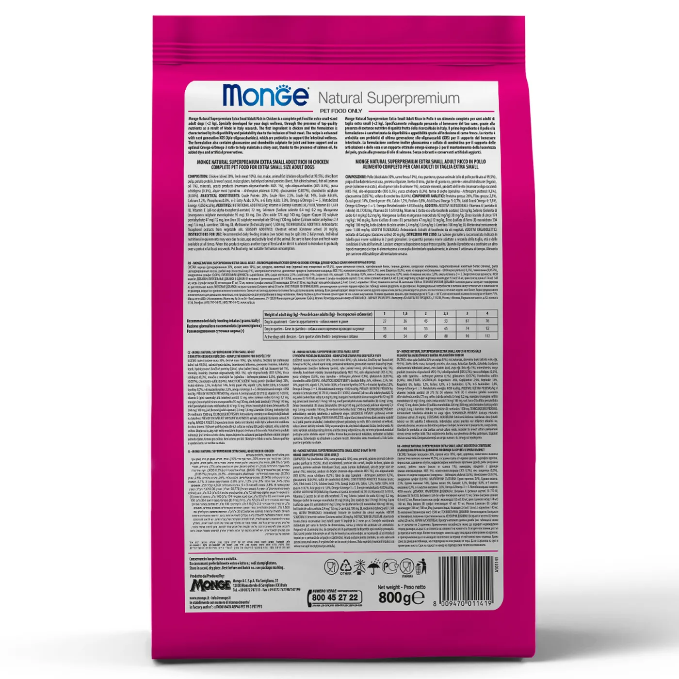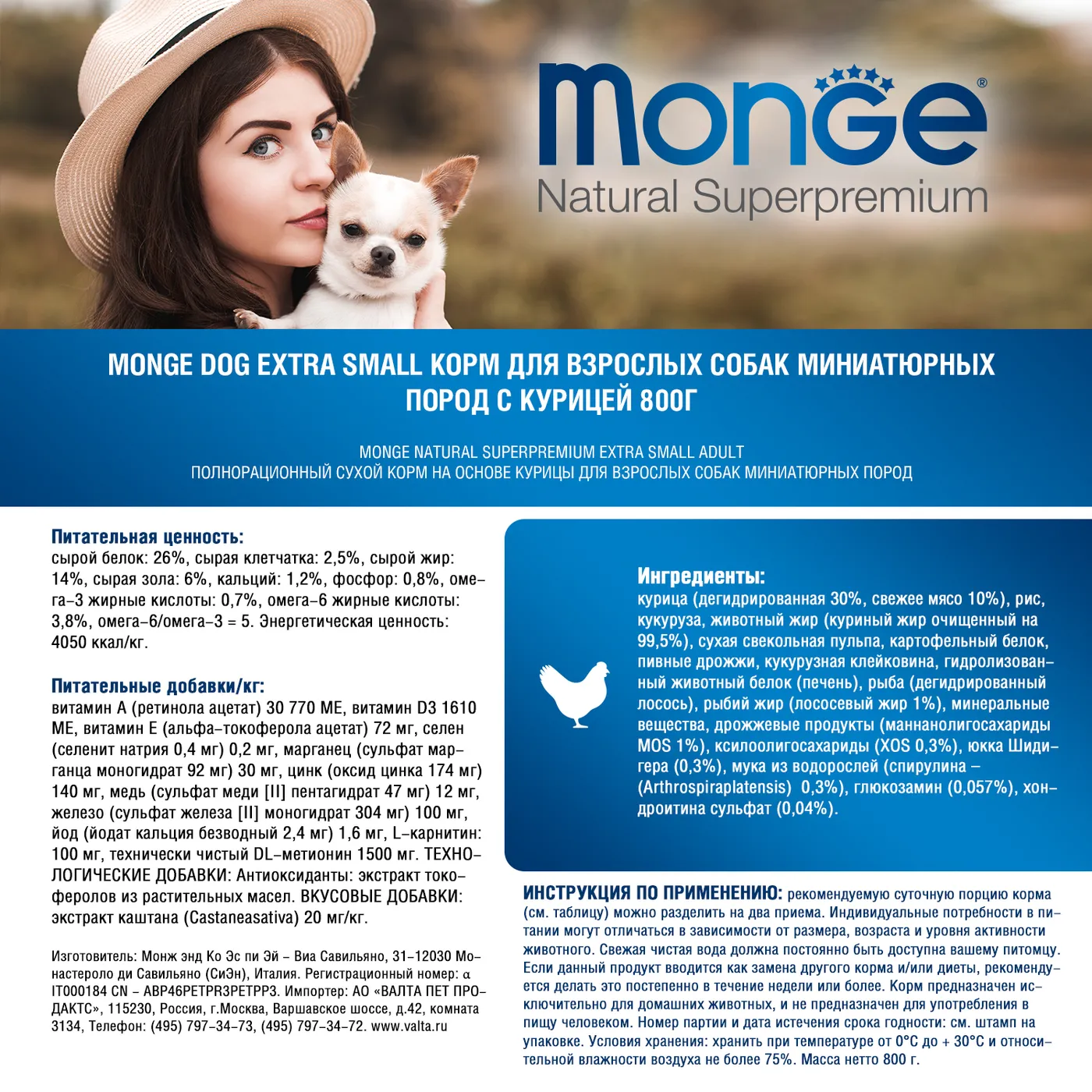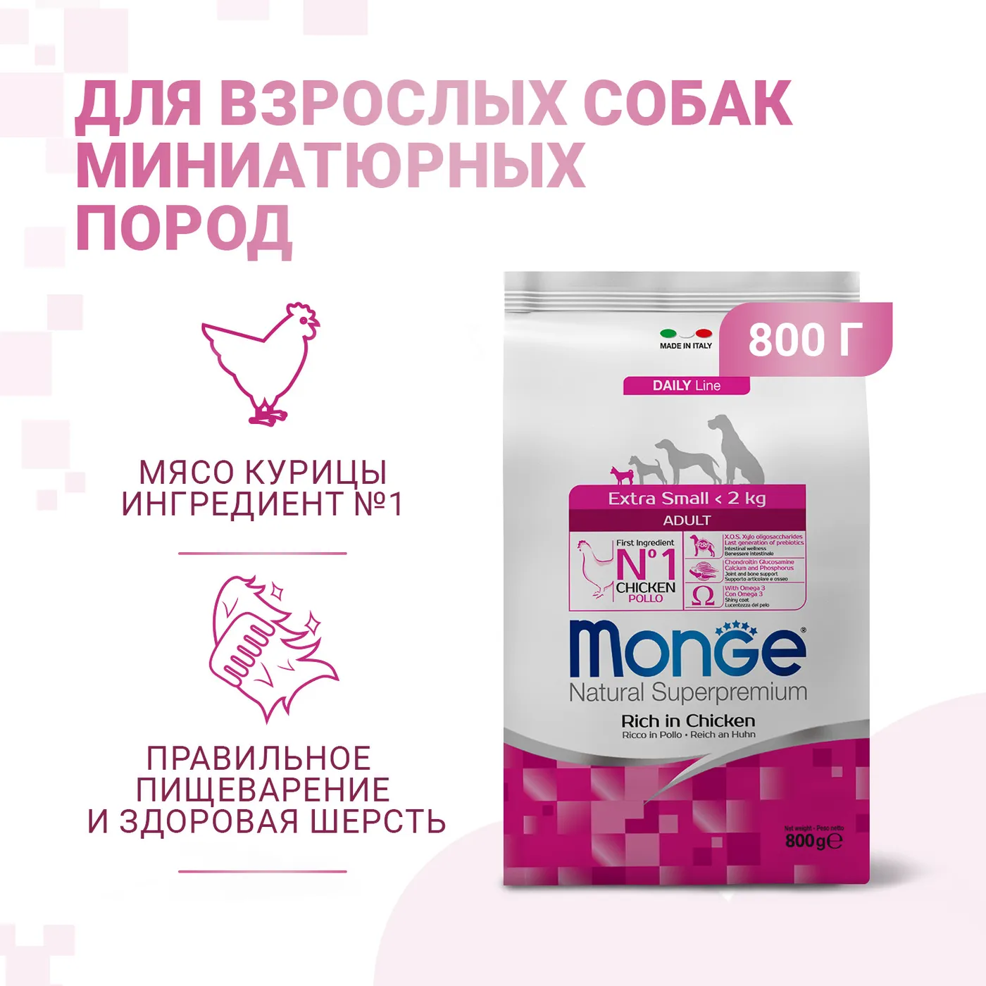 Сухой корм Monge Dog Daily Line Extra Small предназначен для ежедневного питания взрослых собак миниатюрных пород. Основным источником белка в составе является курица. Формула содержит пребиотики MOS и XOS, глюкозамин, хондроитин, а также омега-3 и омега-6 жирные кислоты. Корм не содержит ГМО, искусственных красителей и ароматизаторов.