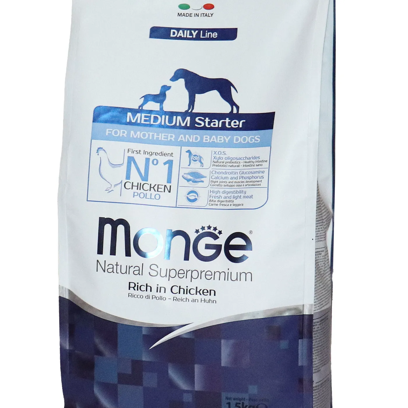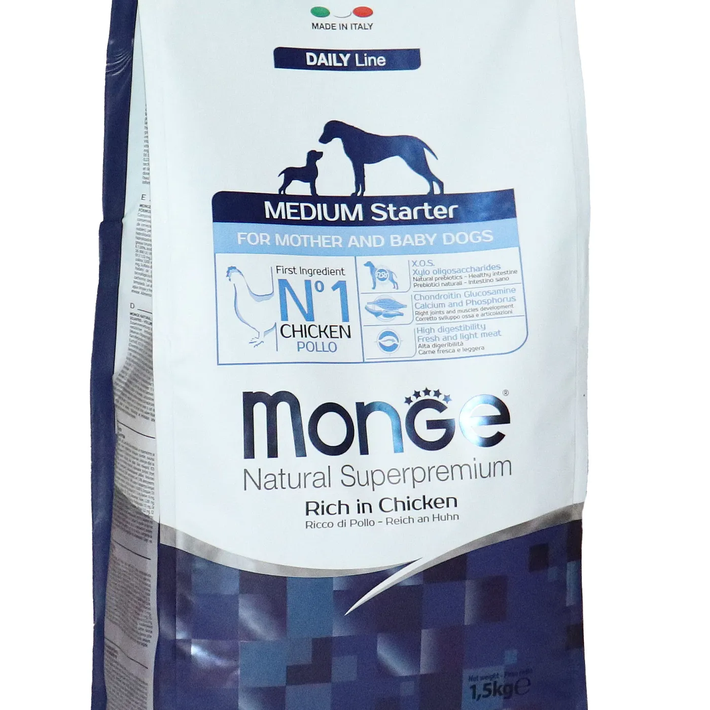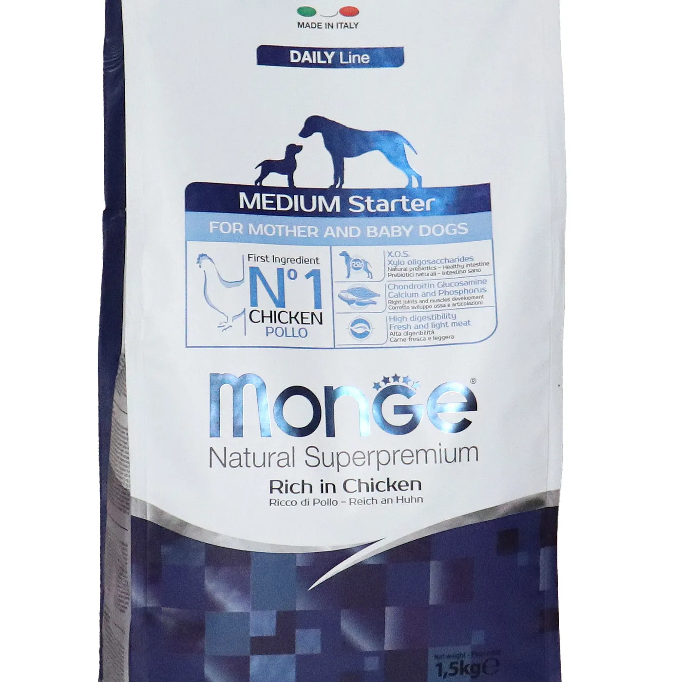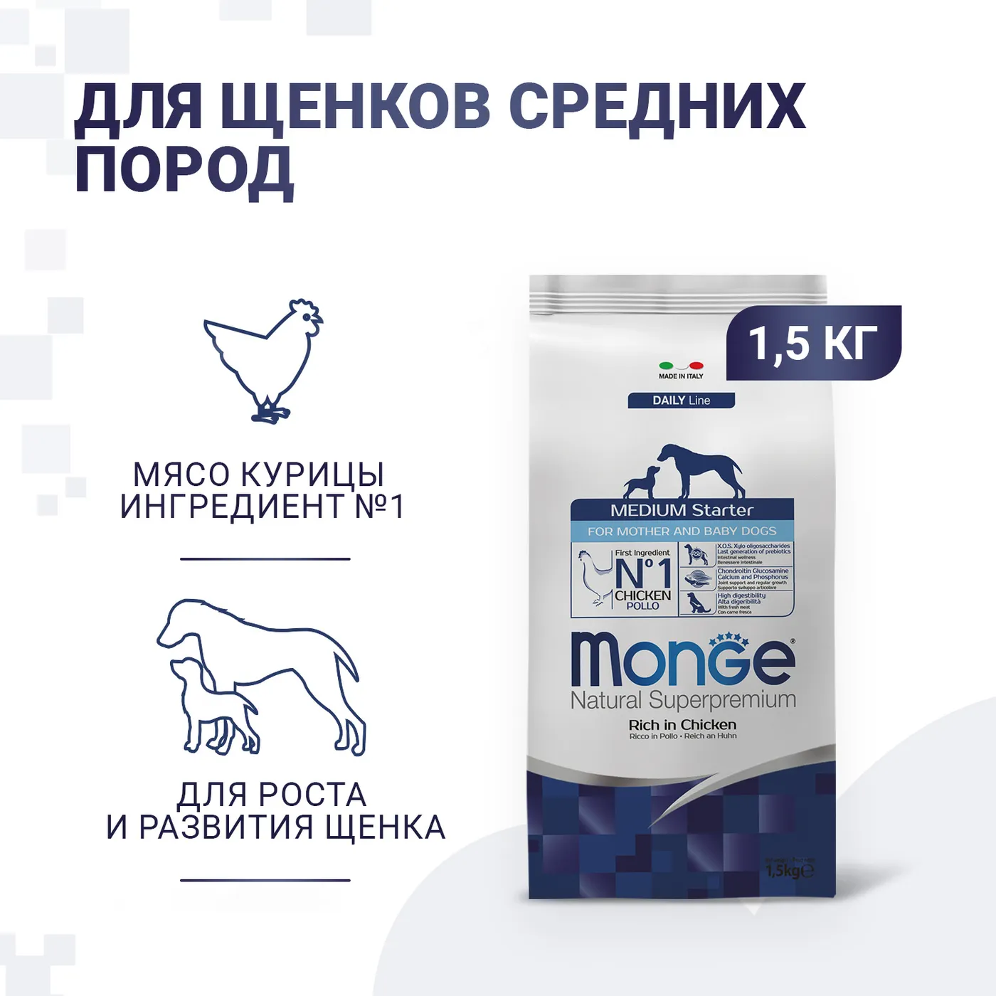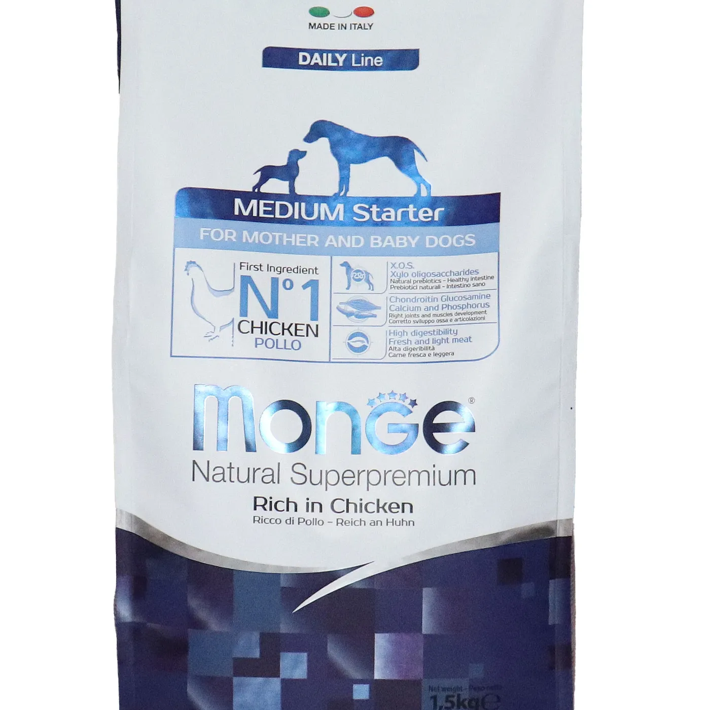 Сухой корм Monge Dog Daily Line Medium Starter предназначен для щенков средних пород в период начала прикорма, а также для беременных и кормящих собак. Основным источником белка является курица (дегидрированная 30%, свежее мясо 10%). В состав включены пребиотики М.О.S и X.O.S для поддержания баланса кишечной микрофлоры, а также глюкозамин, хондроитин, кальций и фосфор для здоровья суставов. Корм содержит L-карнитин и имеет повышенную энергетическую ценность 4500 ккал/кг.