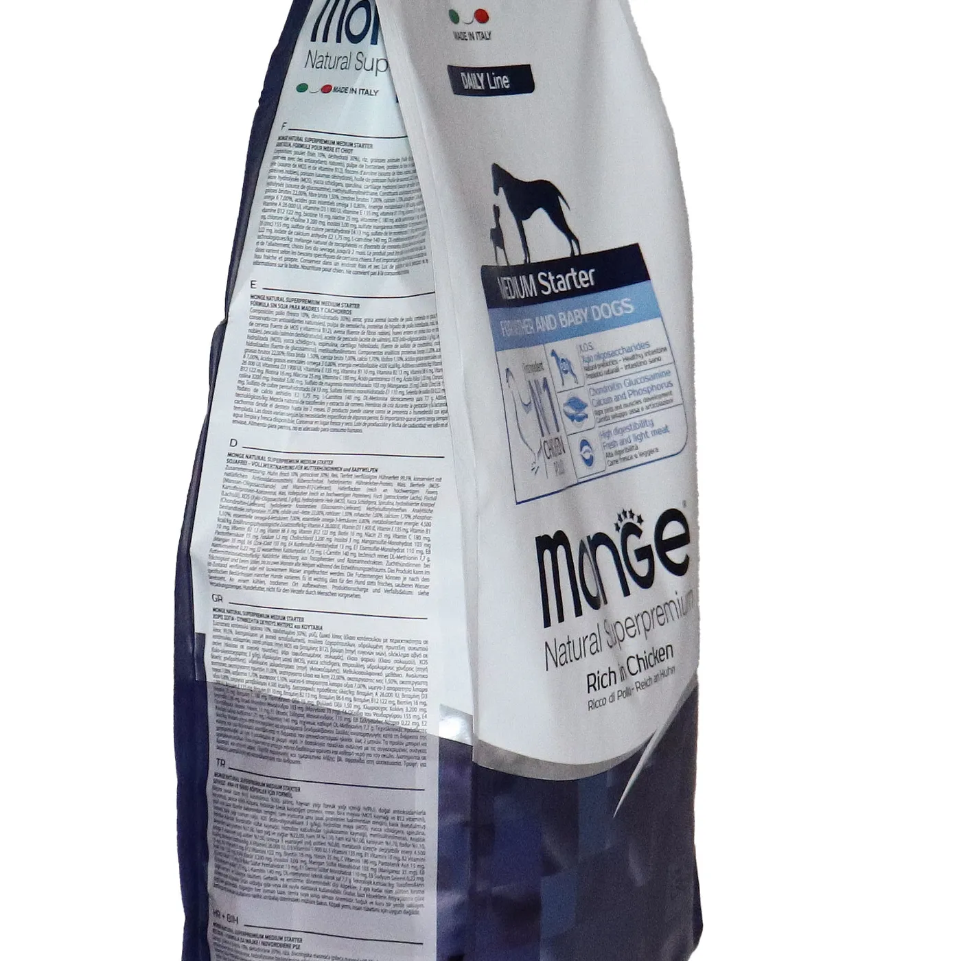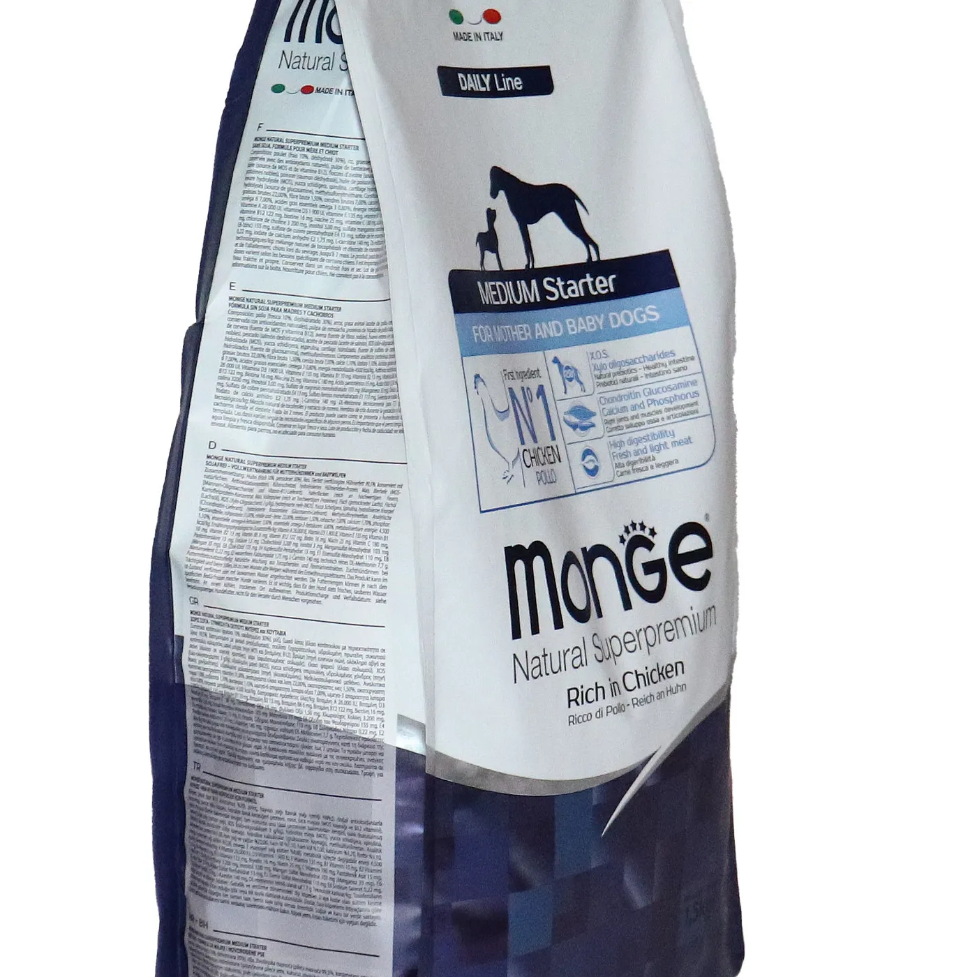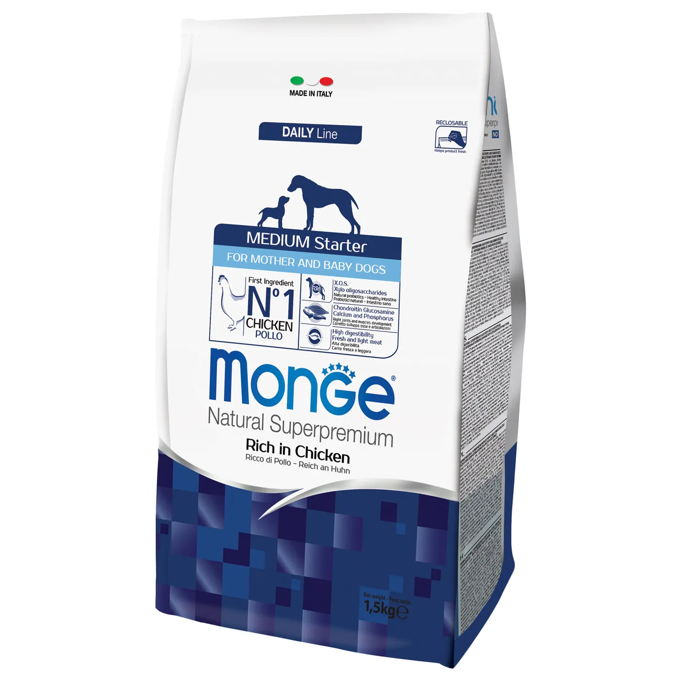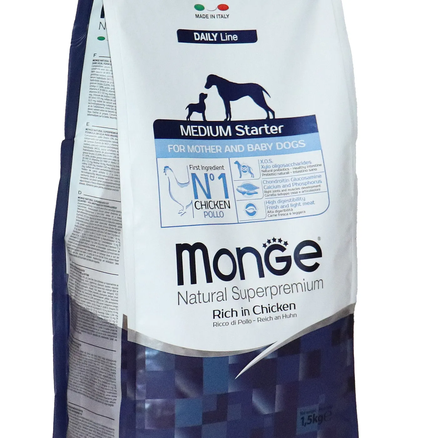 Сухой корм Monge Dog Daily Line Medium Starter предназначен для щенков средних пород в период начала прикорма, а также для беременных и кормящих собак. Основным источником белка является курица (дегидрированная 30%, свежее мясо 10%). В состав включены пребиотики М.О.S и X.O.S для поддержания баланса кишечной микрофлоры, а также глюкозамин, хондроитин, кальций и фосфор для здоровья суставов. Корм содержит L-карнитин и имеет повышенную энергетическую ценность 4500 ккал/кг.