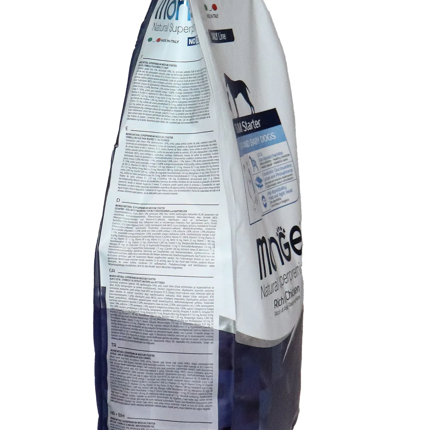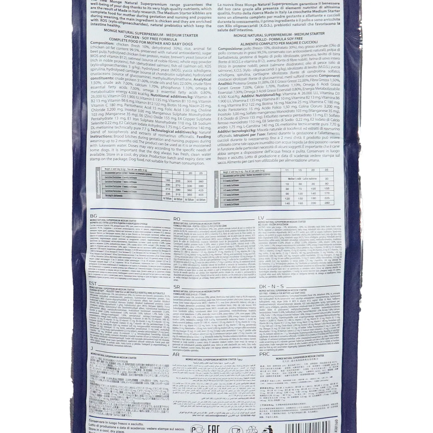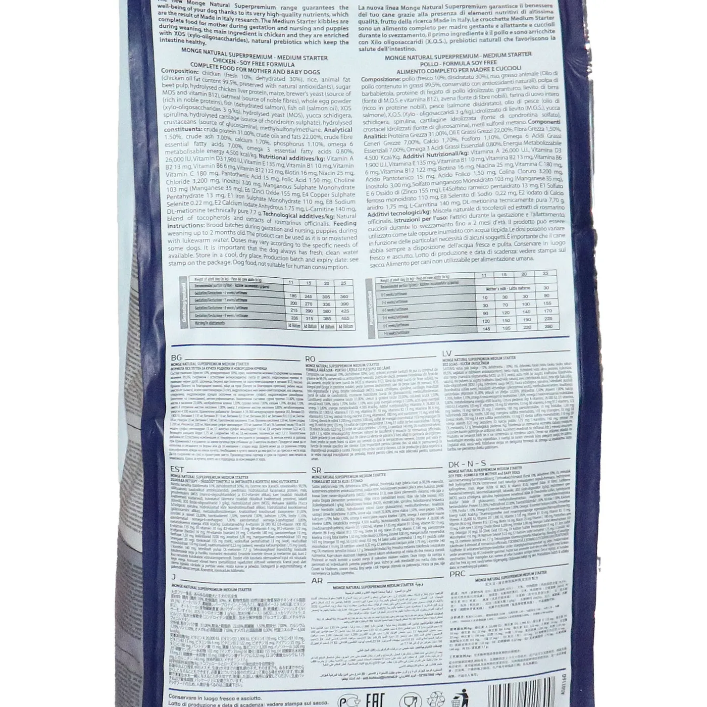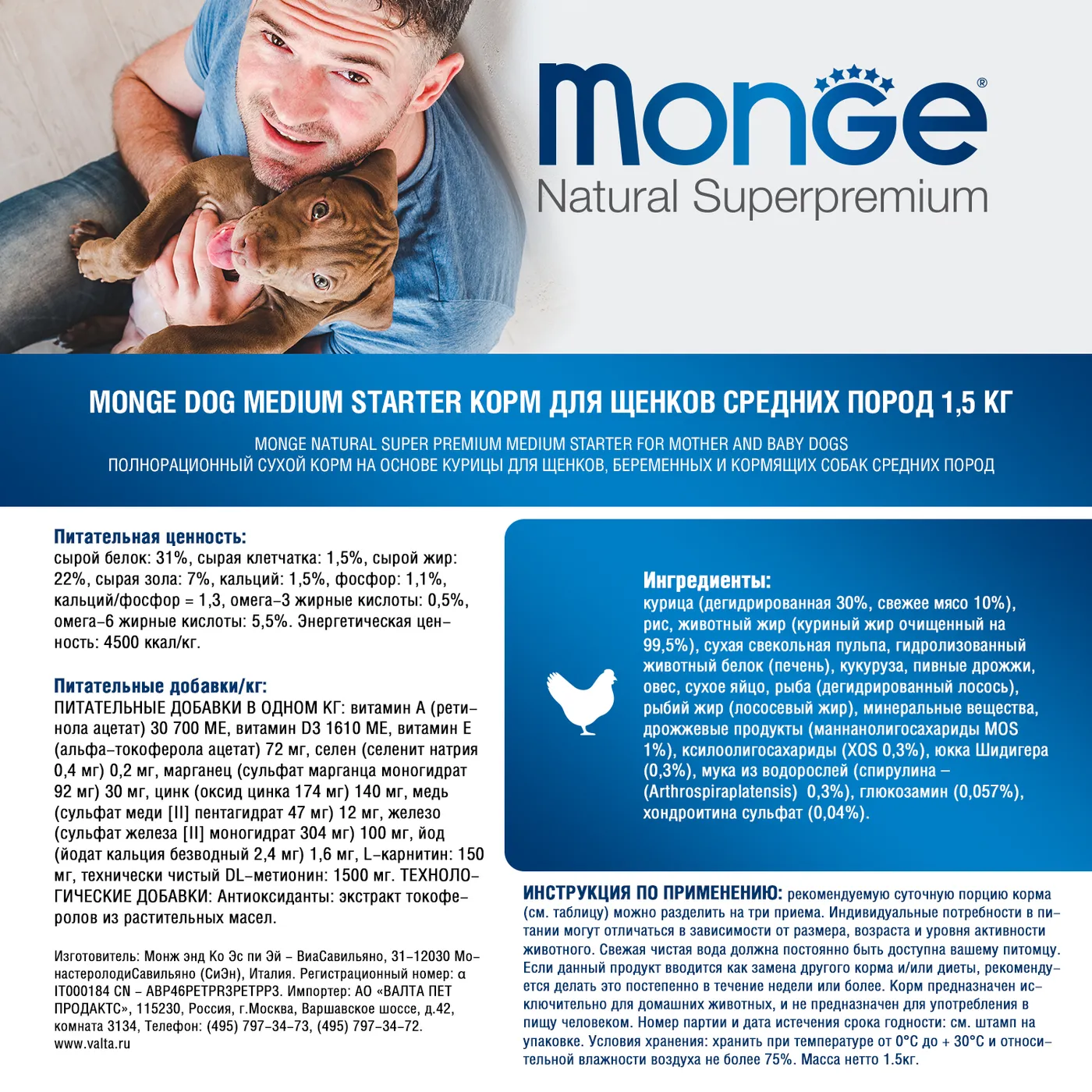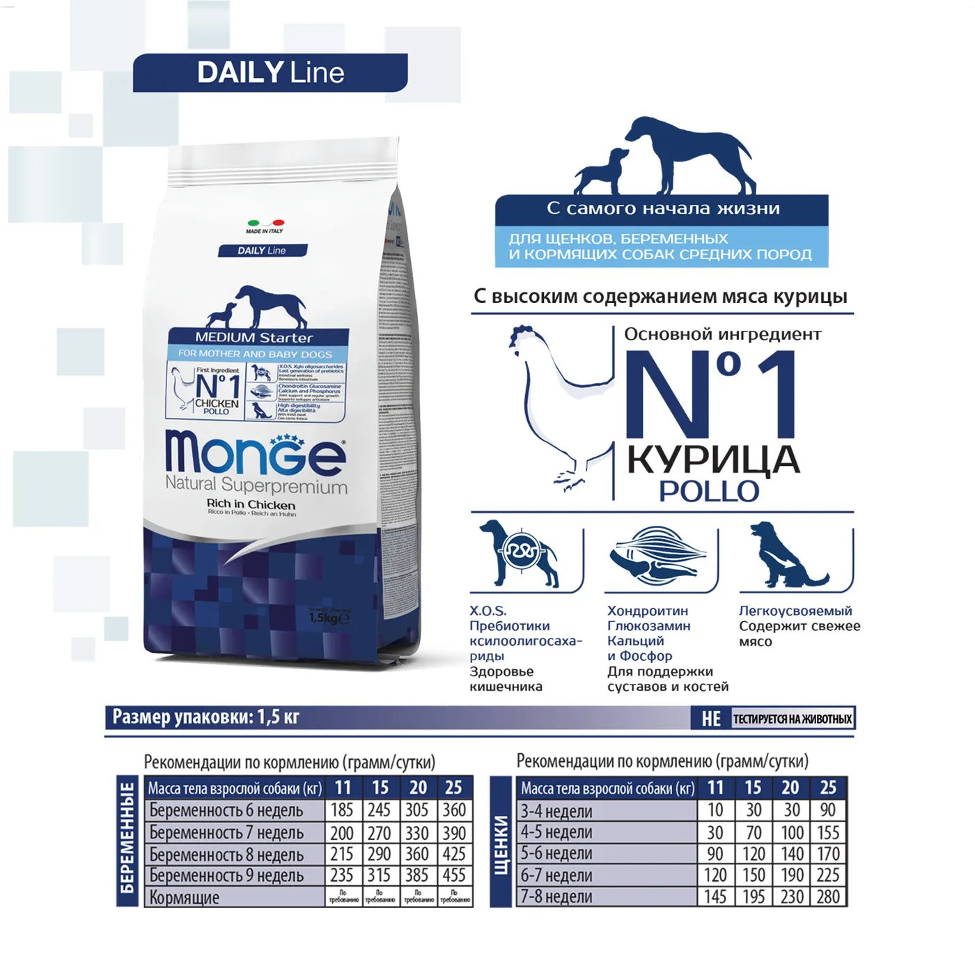 Сухой корм Monge Dog Daily Line Medium Starter предназначен для щенков средних пород в период начала прикорма, а также для беременных и кормящих собак. Основным источником белка является курица (дегидрированная 30%, свежее мясо 10%). В состав включены пребиотики М.О.S и X.O.S для поддержания баланса кишечной микрофлоры, а также глюкозамин, хондроитин, кальций и фосфор для здоровья суставов. Корм содержит L-карнитин и имеет повышенную энергетическую ценность 4500 ккал/кг.