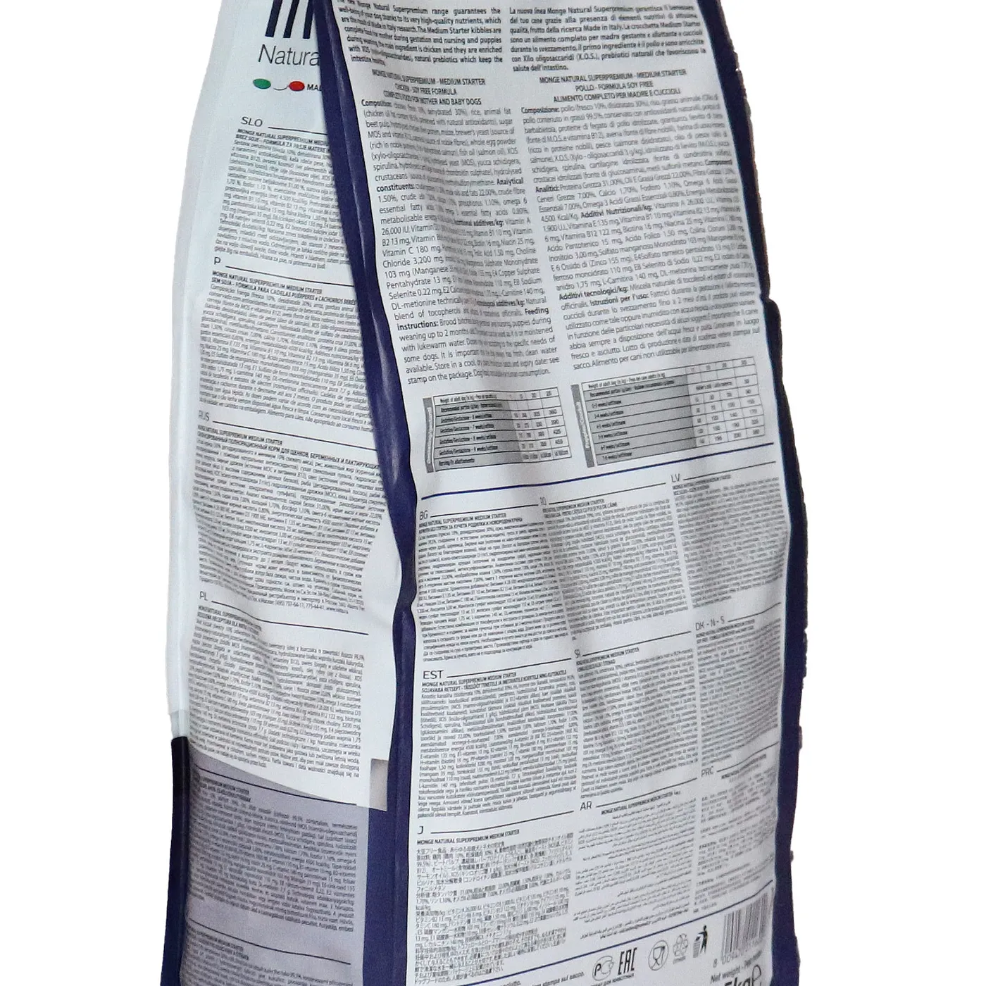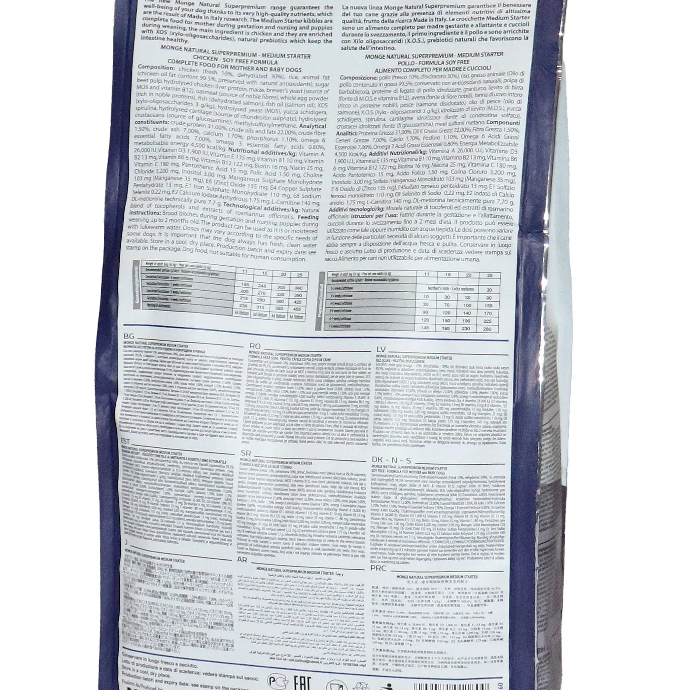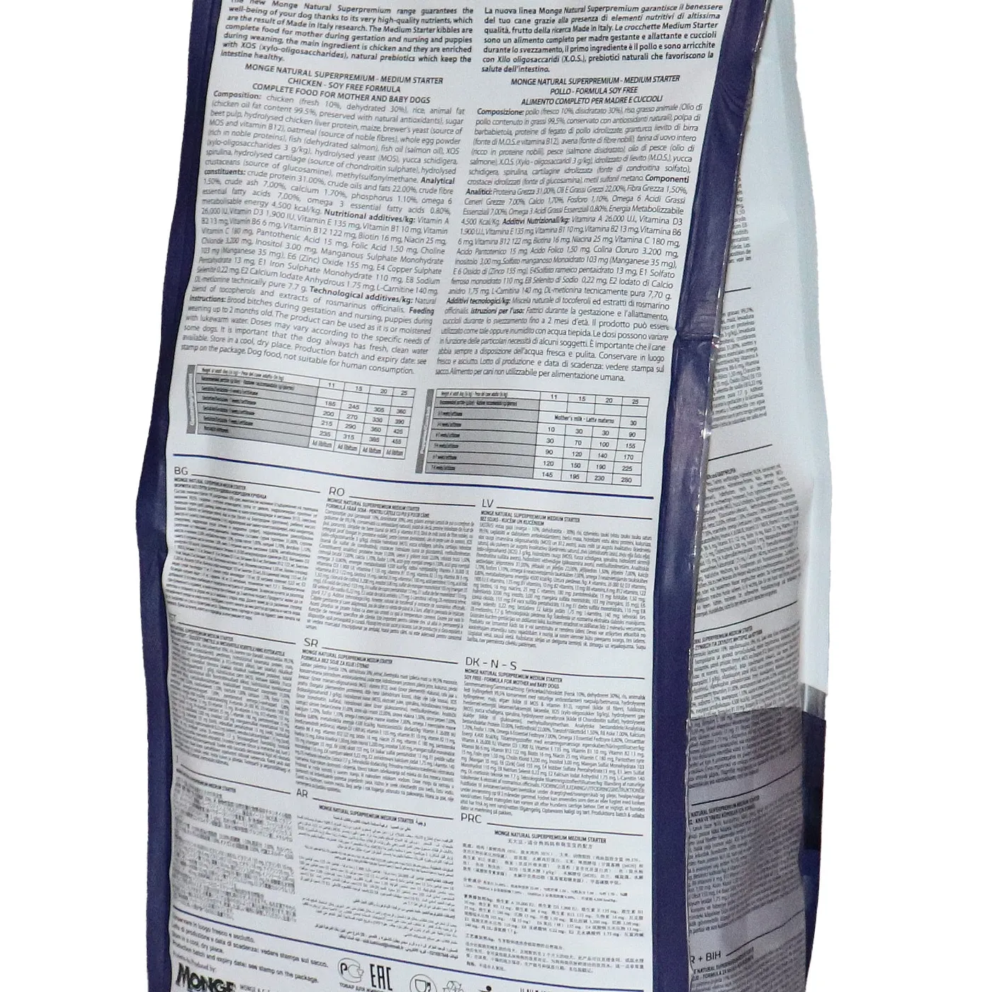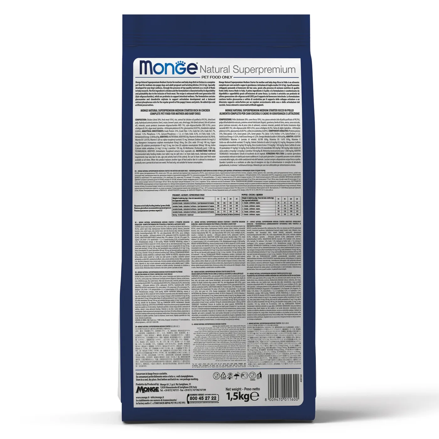 Сухой корм Monge Dog Daily Line Medium Starter предназначен для щенков средних пород в период начала прикорма, а также для беременных и кормящих собак. Основным источником белка является курица (дегидрированная 30%, свежее мясо 10%). В состав включены пребиотики М.О.S и X.O.S для поддержания баланса кишечной микрофлоры, а также глюкозамин, хондроитин, кальций и фосфор для здоровья суставов. Корм содержит L-карнитин и имеет повышенную энергетическую ценность 4500 ккал/кг.