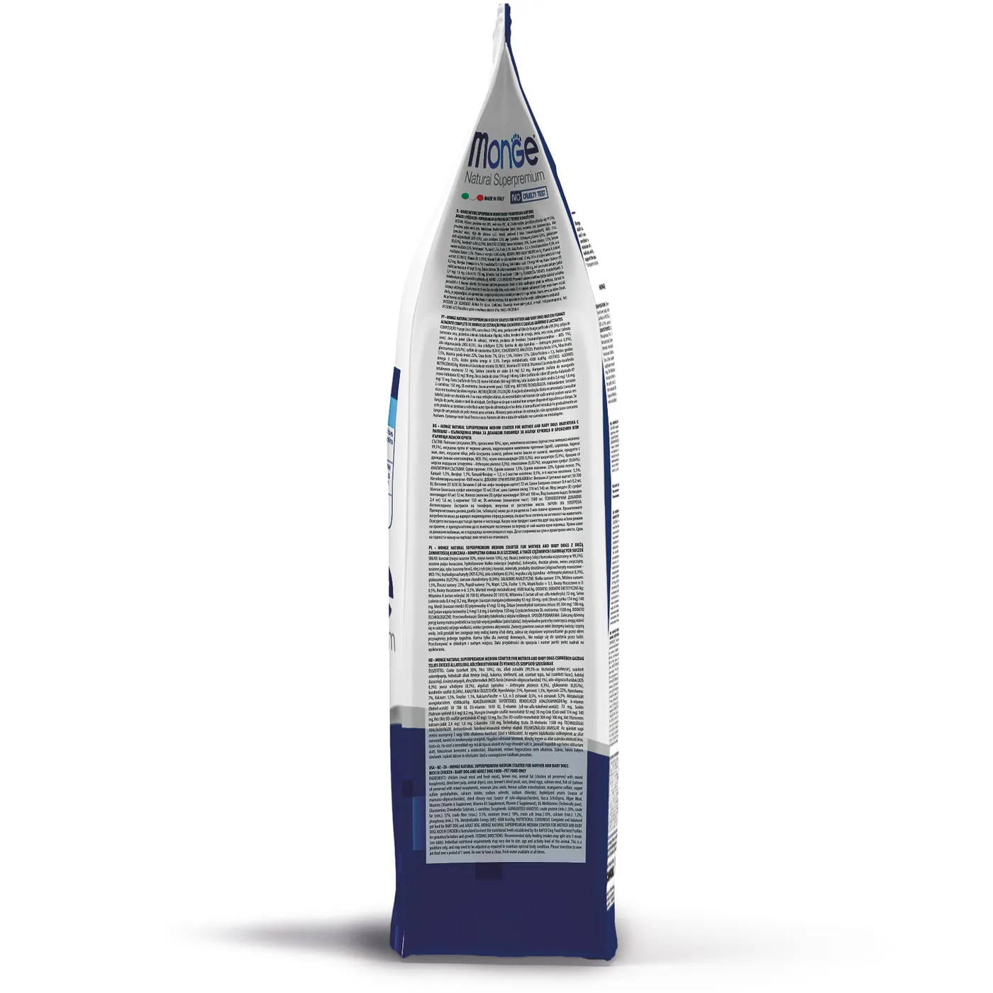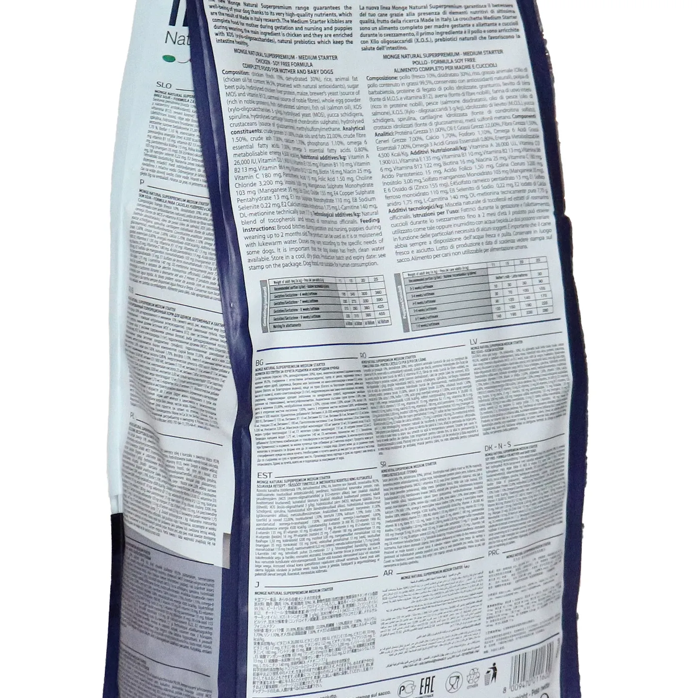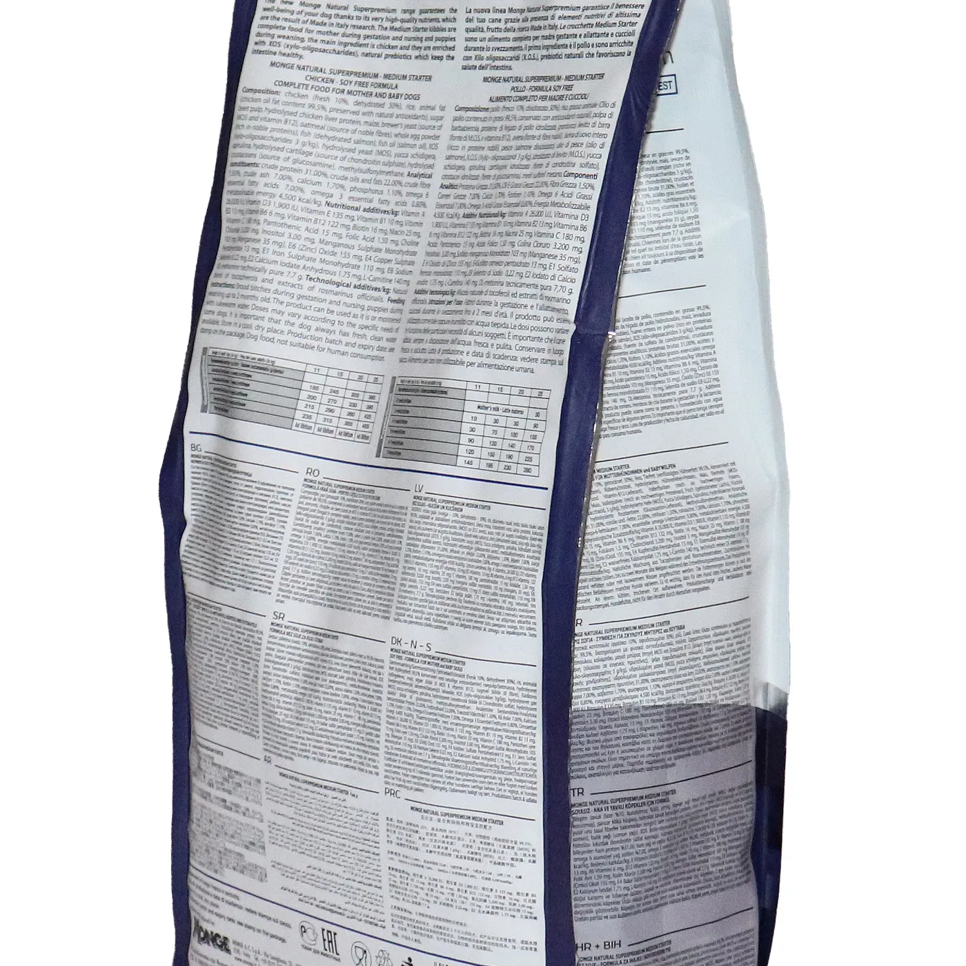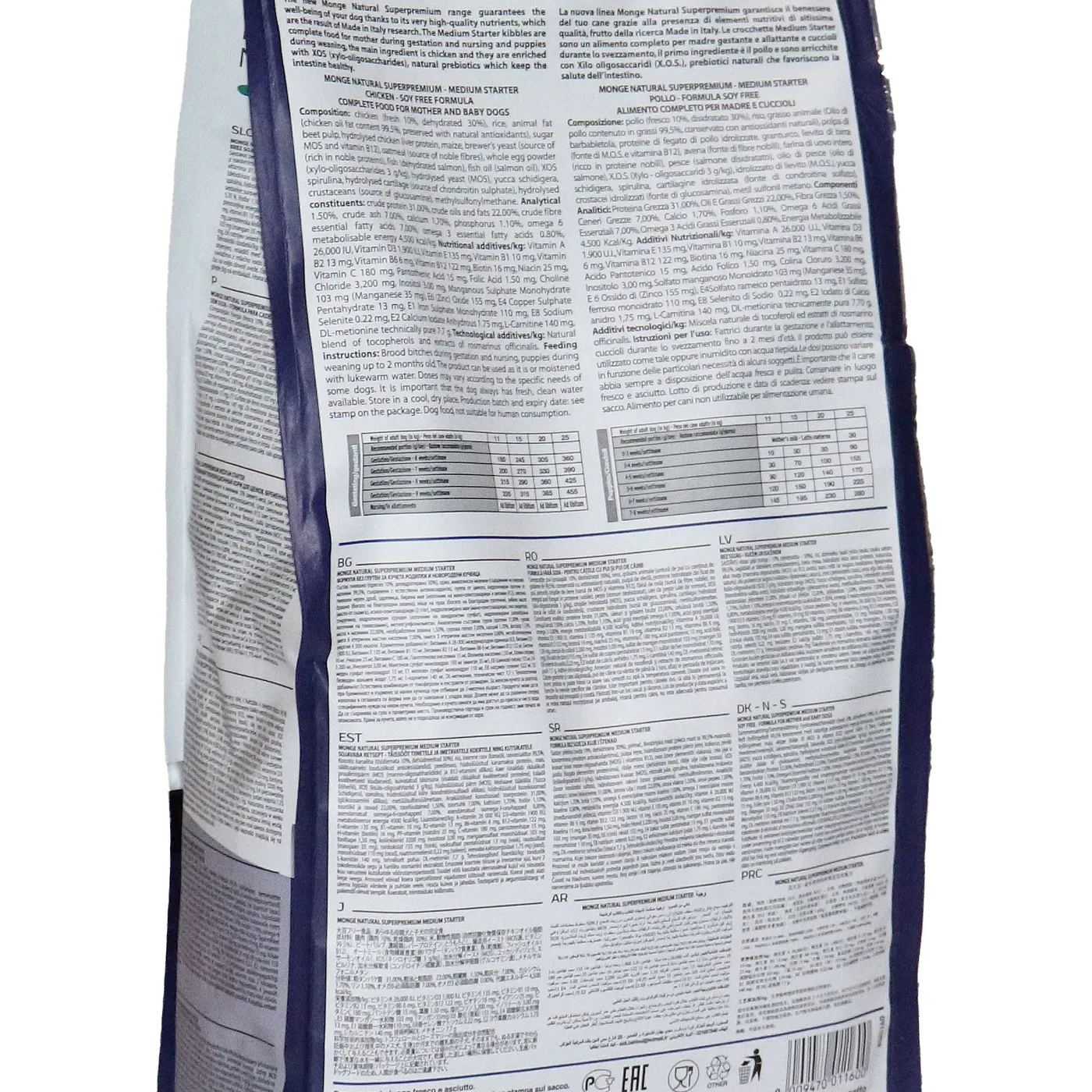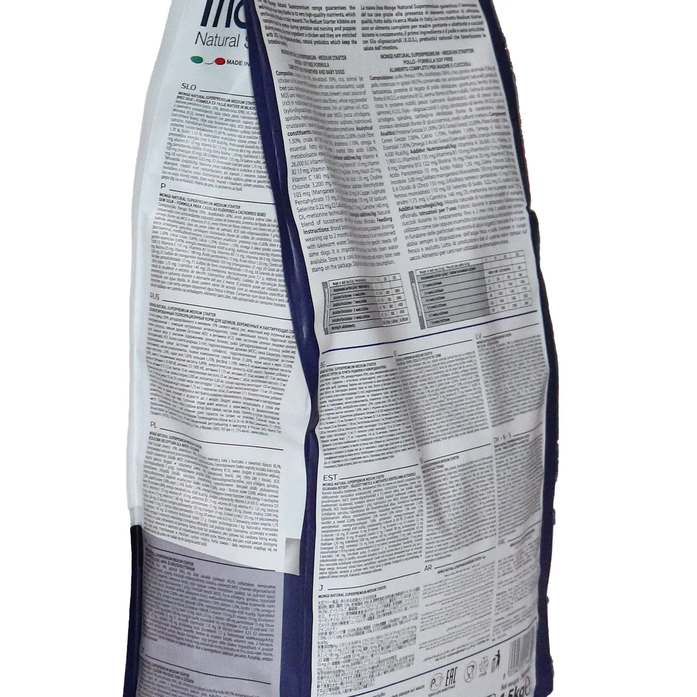 Сухой корм Monge Dog Daily Line Medium Starter предназначен для щенков средних пород в период начала прикорма, а также для беременных и кормящих собак. Основным источником белка является курица (дегидрированная 30%, свежее мясо 10%). В состав включены пребиотики М.О.S и X.O.S для поддержания баланса кишечной микрофлоры, а также глюкозамин, хондроитин, кальций и фосфор для здоровья суставов. Корм содержит L-карнитин и имеет повышенную энергетическую ценность 4500 ккал/кг.