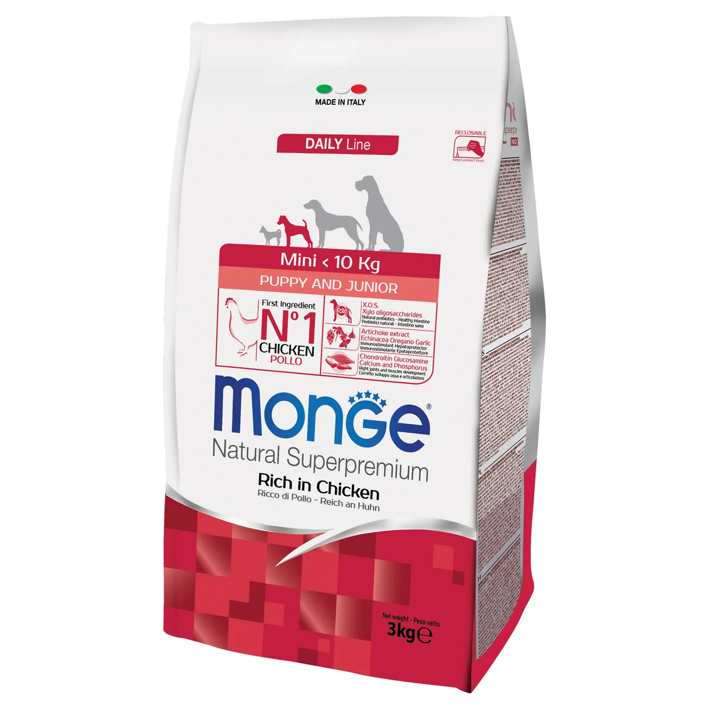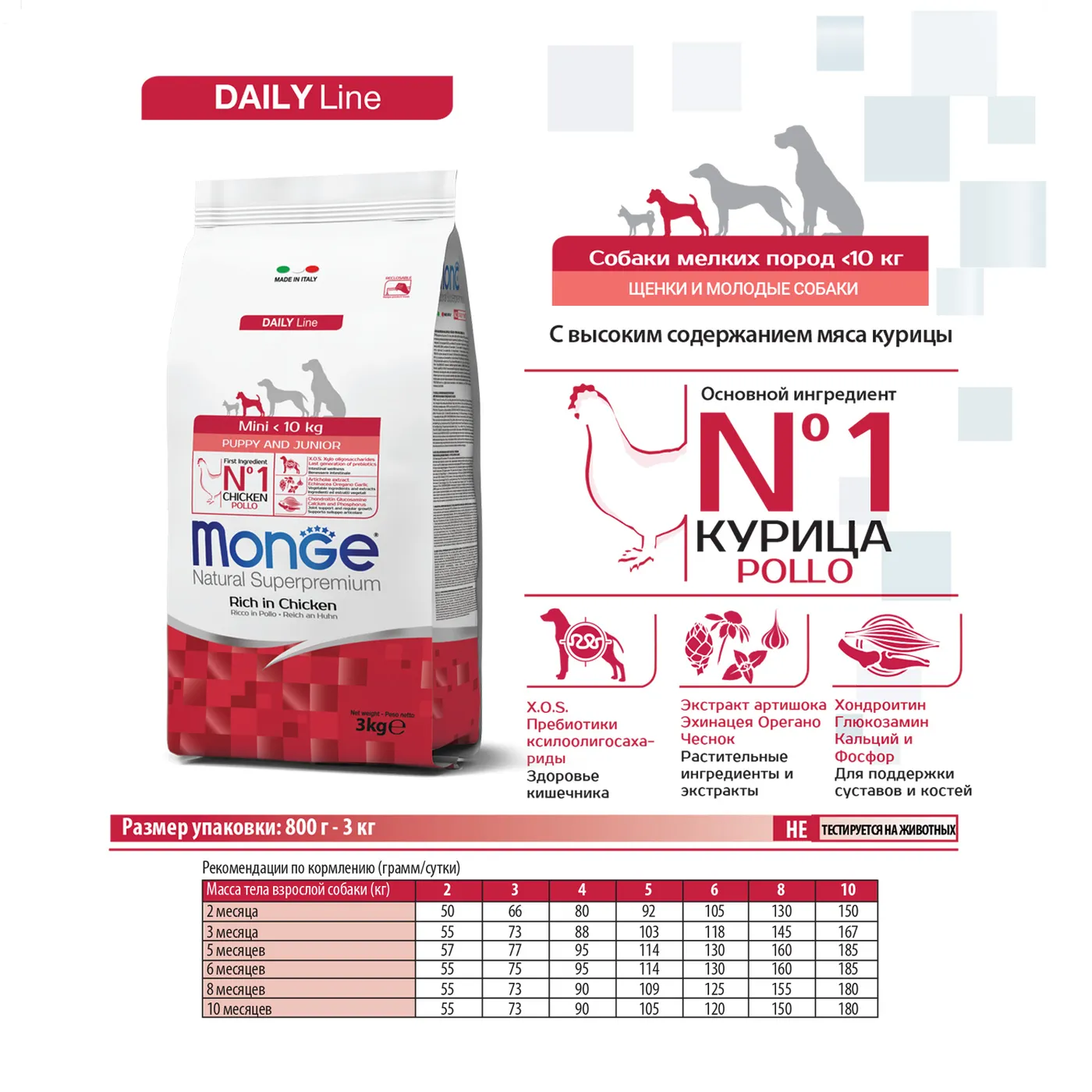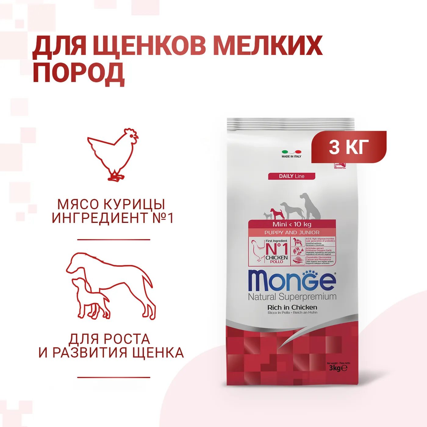 Полнорационный сухой корм Monge Dog Daily Line Mini для щенков мелких пород с 2 до 12 месяцев. Основным источником белка является курица (включая дегидрированное и свежее мясо). Формула содержит пребиотики MOS и XOS для поддержания баланса кишечной микрофлоры, а также глюкозамин и хондроитин для здоровья суставов в период роста. В состав включены растительные экстракты (артишок, эхинацея, орегано, чеснок). Корм не содержит ГМО, искусственных красителей и ароматизаторов.
