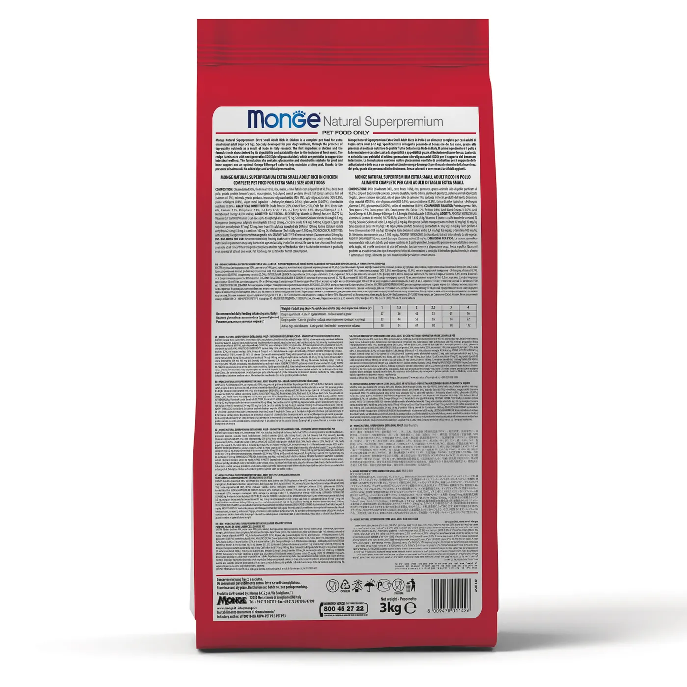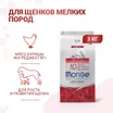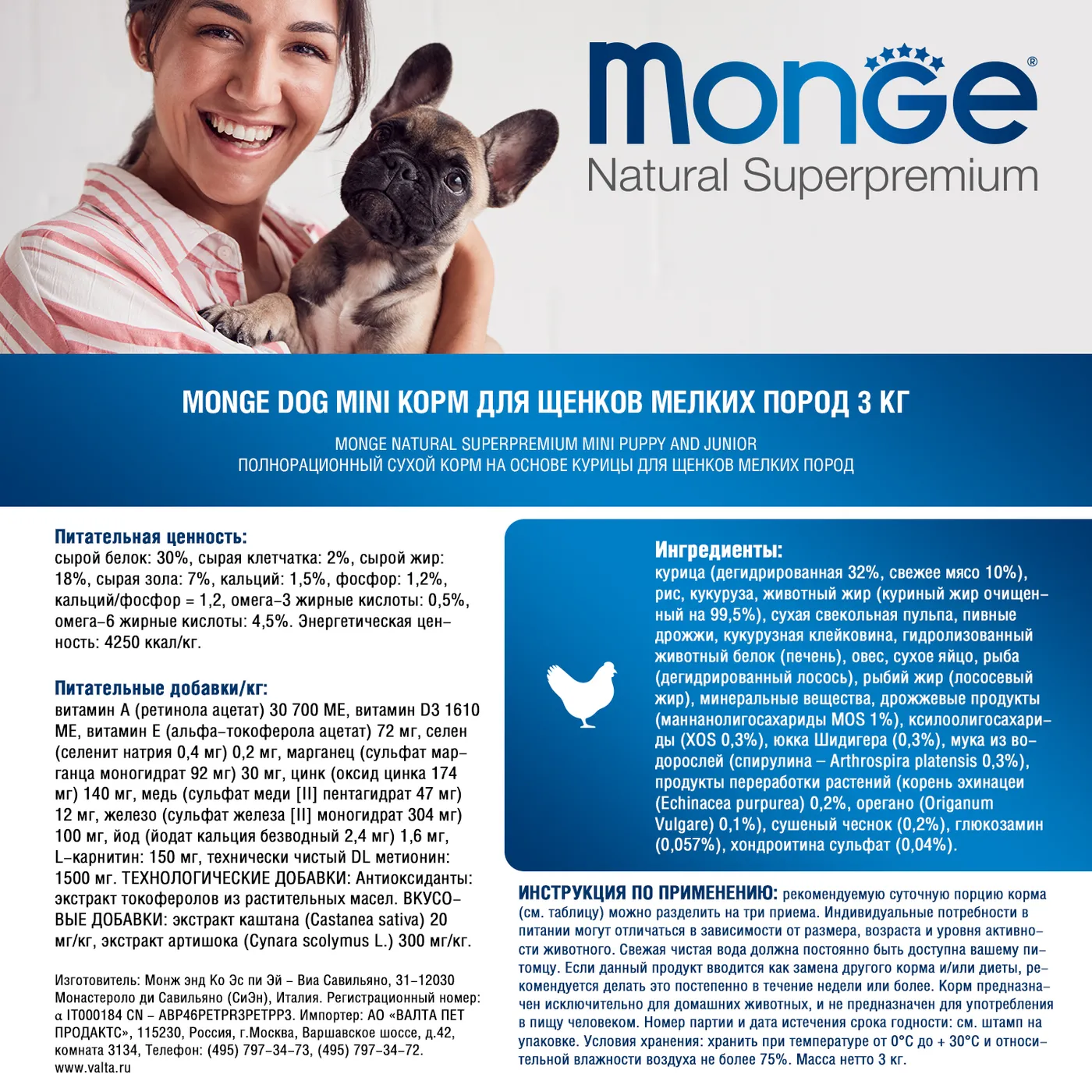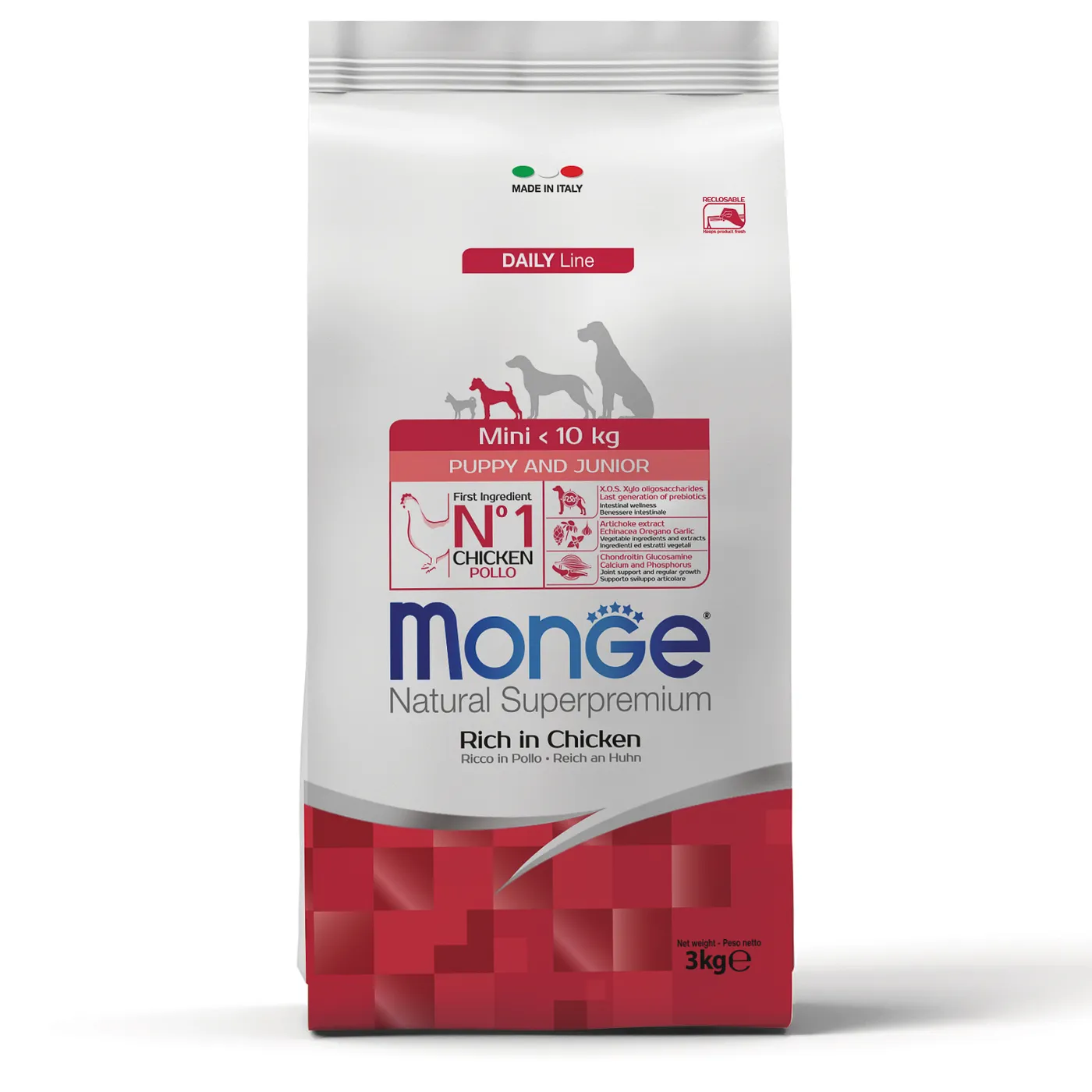 Полнорационный сухой корм Monge Dog Daily Line Mini для щенков мелких пород с 2 до 12 месяцев. Основным источником белка является курица (включая дегидрированное и свежее мясо). Формула содержит пребиотики MOS и XOS для поддержания баланса кишечной микрофлоры, а также глюкозамин и хондроитин для здоровья суставов в период роста. В состав включены растительные экстракты (артишок, эхинацея, орегано, чеснок). Корм не содержит ГМО, искусственных красителей и ароматизаторов.