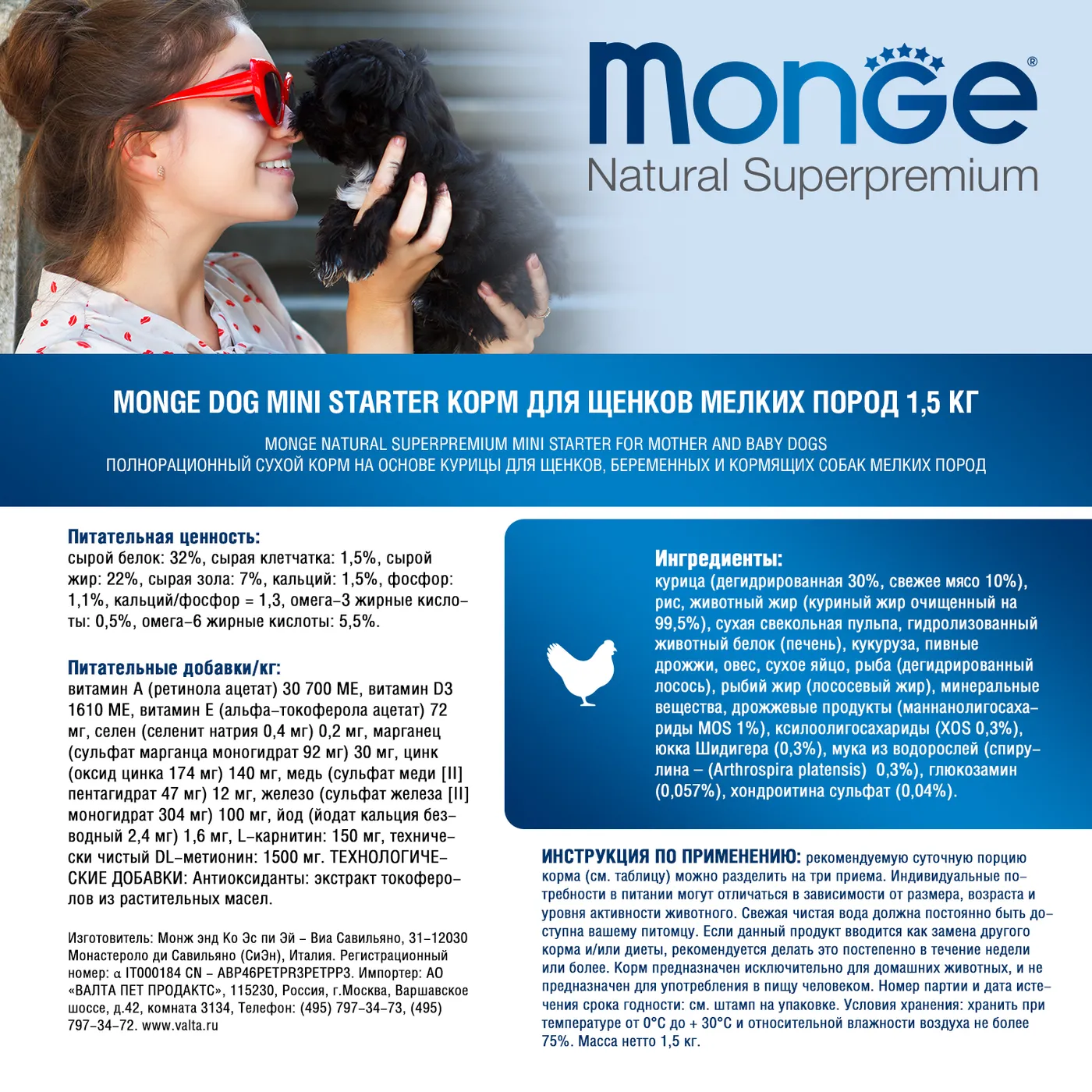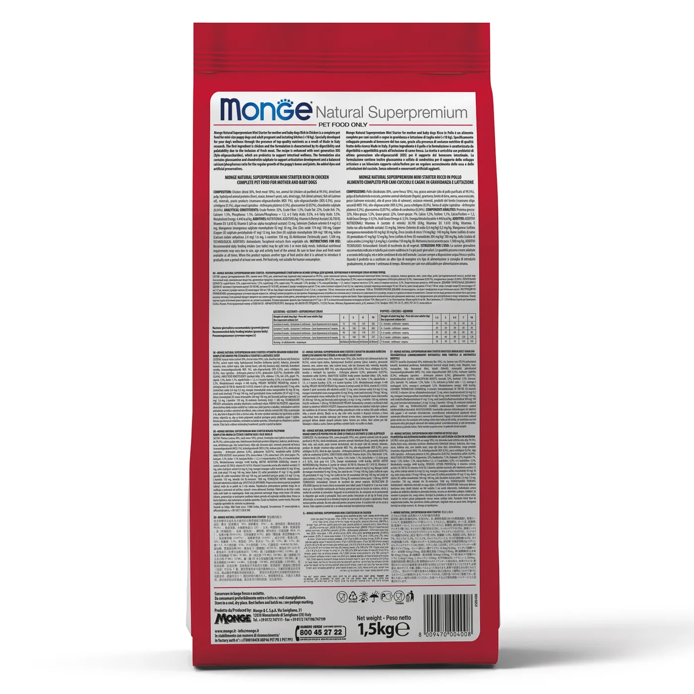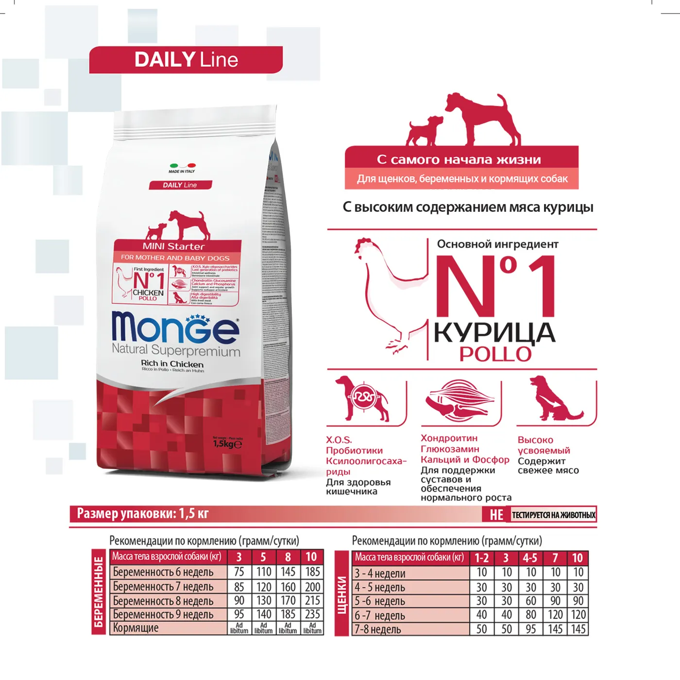 Полнорационный сухой корм Monge Dog Daily Line Mini Starter предназначен для щенков мелких пород в период начала прикорма. Основным источником белка является курица, включающая дегидрированное и свежее мясо. Состав обогащен пребиотиками MOS и XOS для поддержания баланса кишечной микрофлоры, а также глюкозамином, хондроитином, кальцием и фосфором. Рацион также подходит для собак мелких пород в период беременности и лактации. Корм содержит витаминно-минеральный комплекс и L-карнитин, произведен в Италии без искусственных красителей и ароматизаторов.