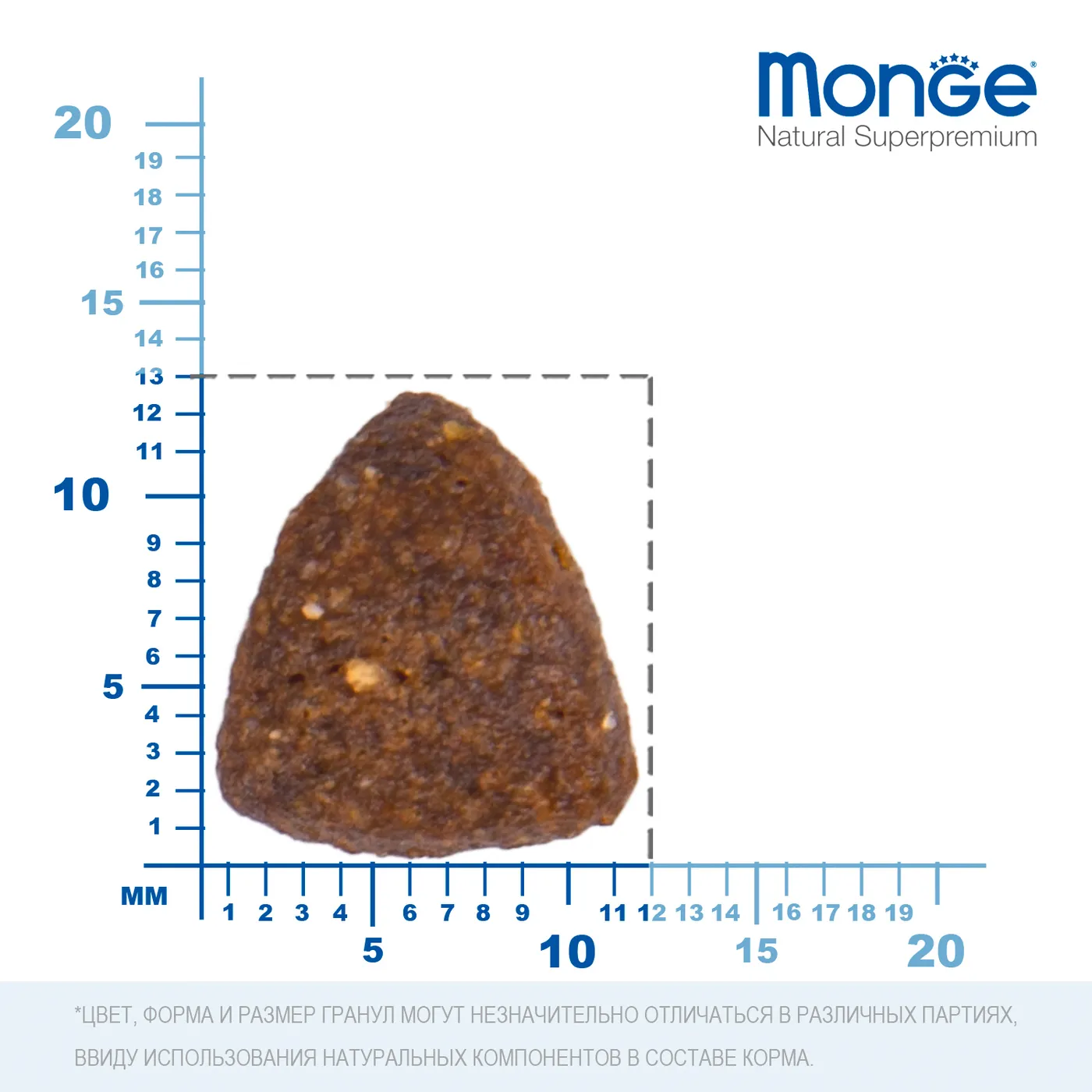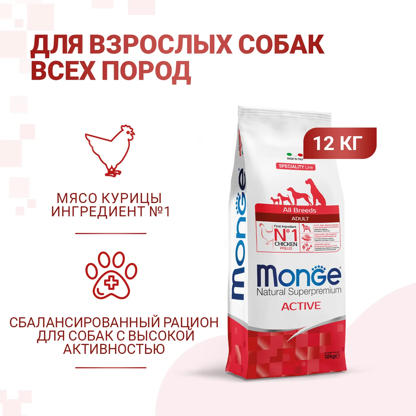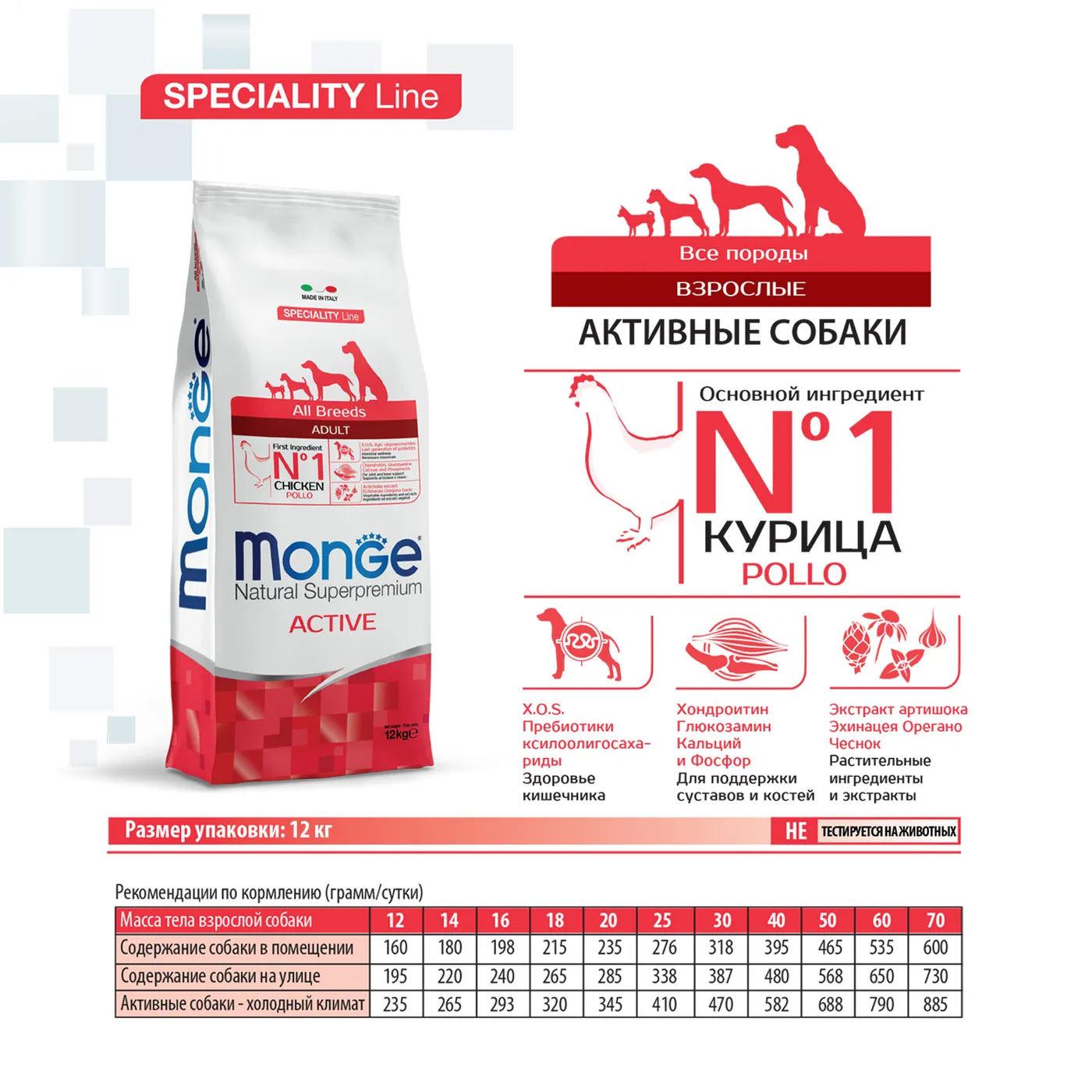Сухой корм Monge Dog Speciality Line Active — полнорационный рацион для взрослых собак с повышенной физической нагрузкой. Основной источник белка — курица (дегидрированная и свежая). Формула содержит повышенный уровень протеина (30%) и жиров (21%) для обеспечения энергией рабочих, служебных и спортивных собак, а также животных, живущих в вольерах или холодном климате. В состав включены X.O.S.-пребиотики для поддержания баланса микрофлоры кишечника, глюкозамин и хондроитин для здоровья суставов, а также комплекс растительных экстрактов (артишок, эхинацея, орегано, чеснок). Корм не содержит ГМО, искусственных красителей и ароматизаторов.