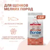 Сухой корм Monge Dog Speciality Line Monoprotein предназначен для щенков мелких пород в возрасте от 2 до 12 месяцев. Основным источником белка в составе является лосось (дегидрированный 28%, свежий 10%). Формула включает комплекс для поддержки пищеварения (пребиотики MOS и XOS), суставов (глюкозамин, хондроитин) и иммунитета (экстракты эхинацеи, орегано, чеснока). Корм содержит рис, кукурузу и добавленные витаминно-минеральные комплексы. Произведен в Италии, не содержит искусственных красителей и ароматизаторов.