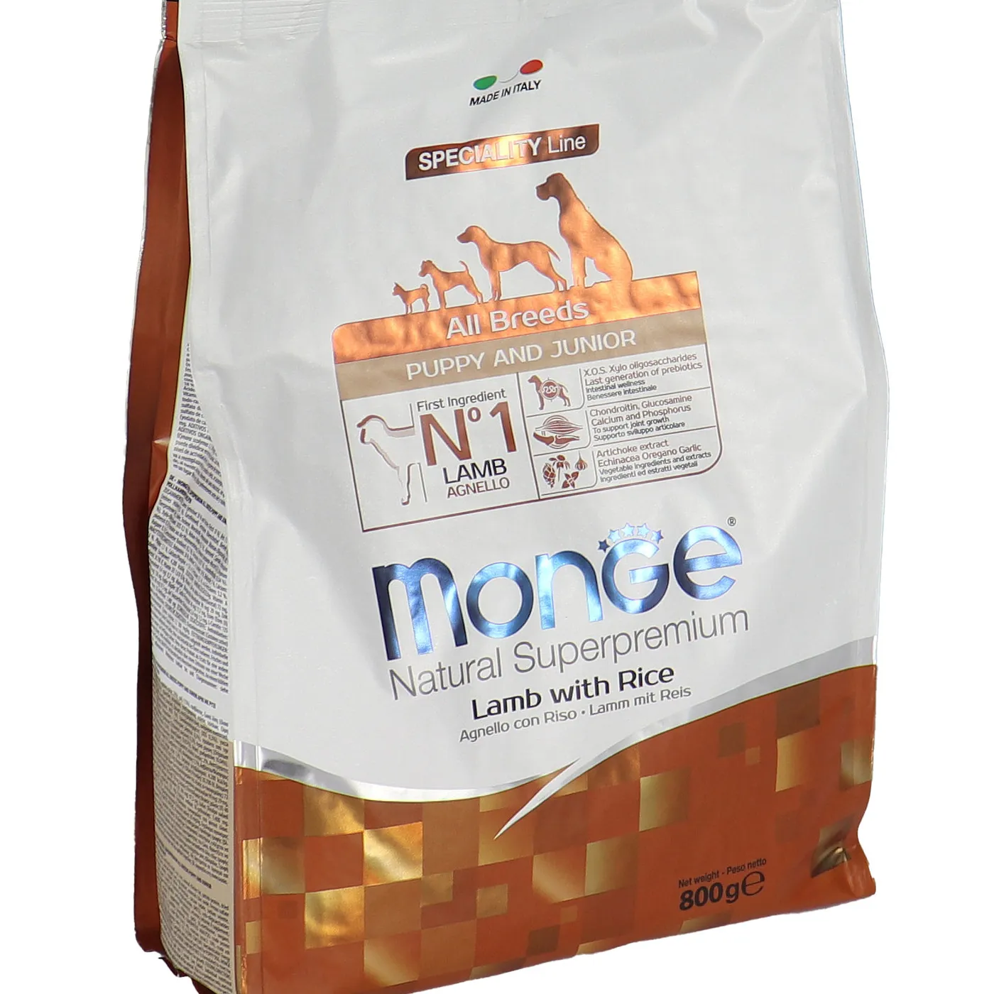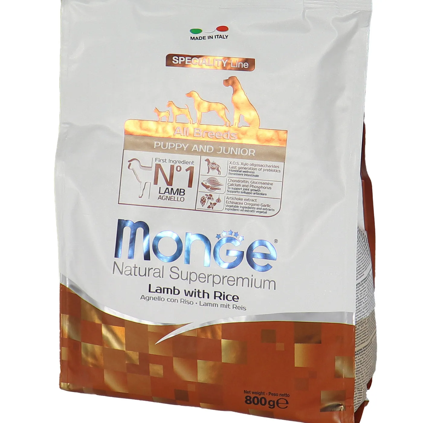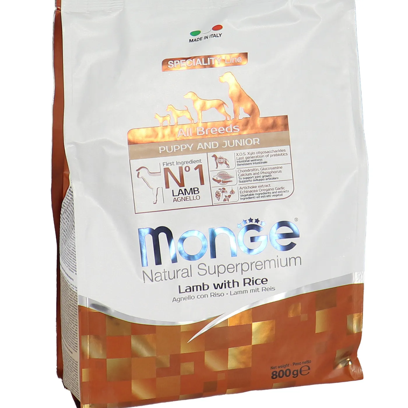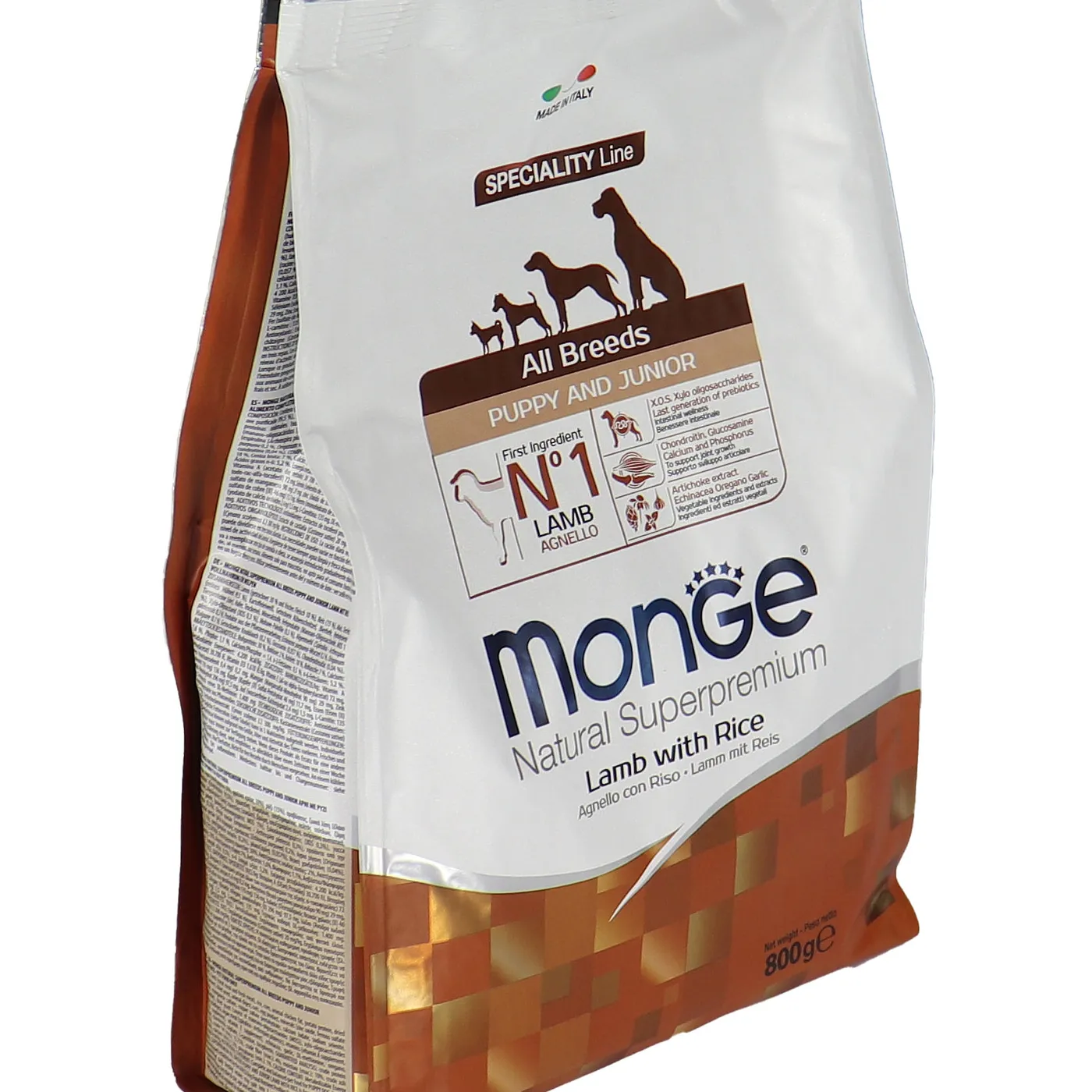 Сухой корм Monge Dog Speciality Line Puppy&Junior предназначен для ежедневного кормления щенков всех пород в возрасте от 1 до 12 месяцев. Основу рациона составляет дегидрированное и свежее мясо ягненка в сочетании с рисом. Формула включает пребиотики MOS и XOS для поддержания баланса кишечной микрофлоры, а также комплекс глюкозамина и хондроитина для здоровья суставов в период роста. В составе присутствуют растительные экстракты, такие как артишок, эхинацея, орегано и чеснок. Корм не содержит искусственных красителей, ароматизаторов и ГМО.