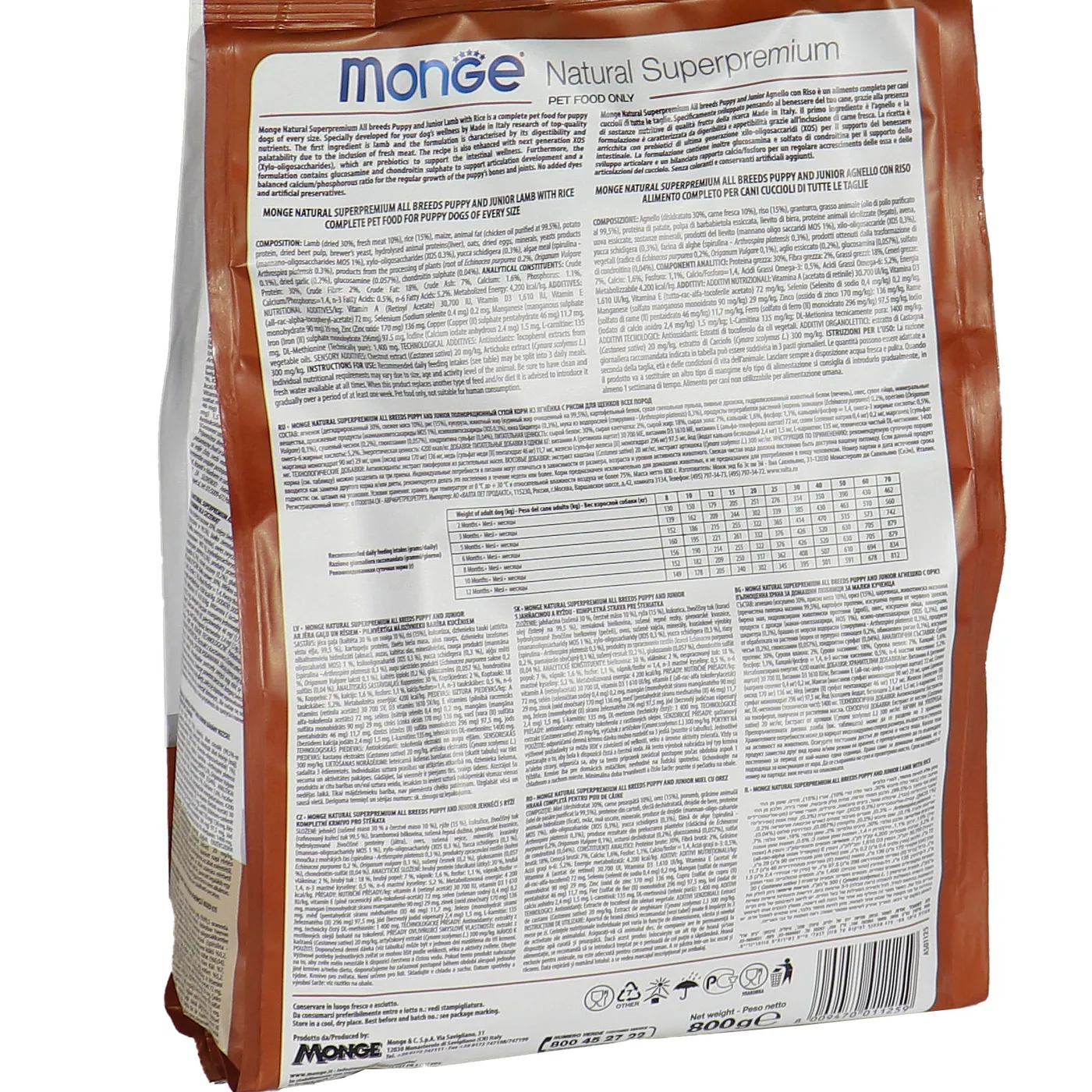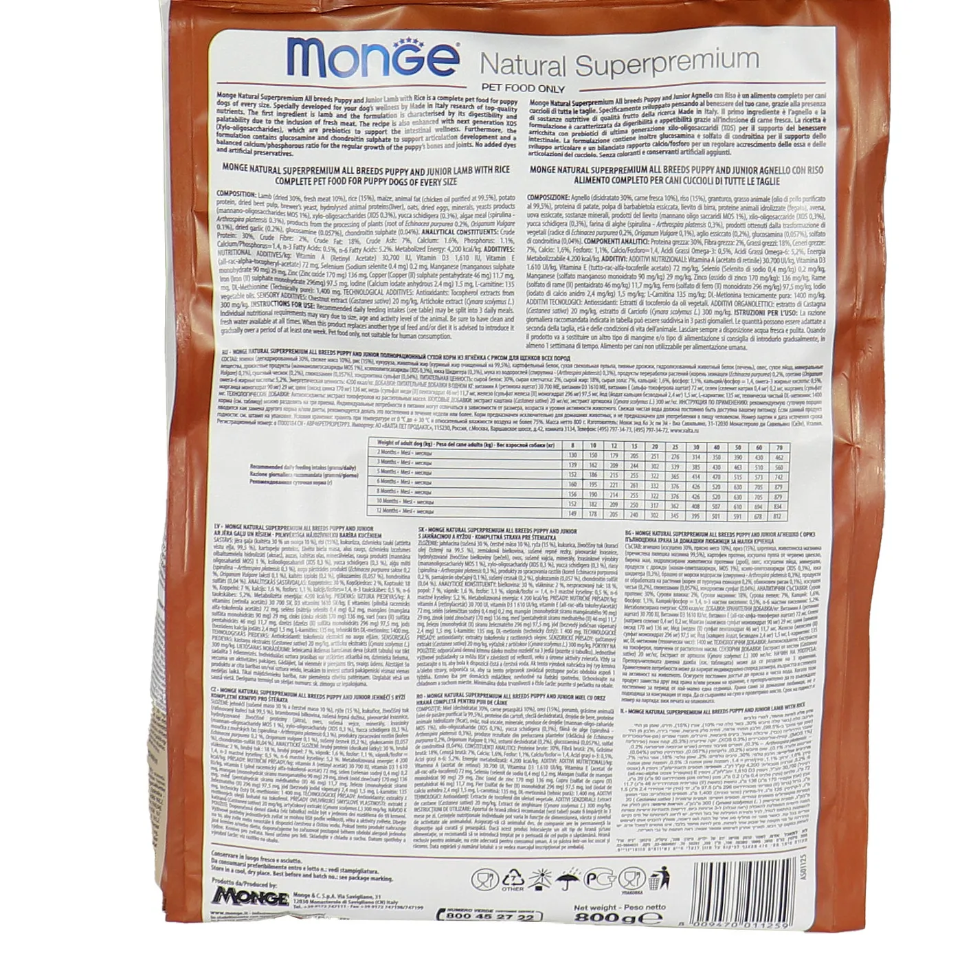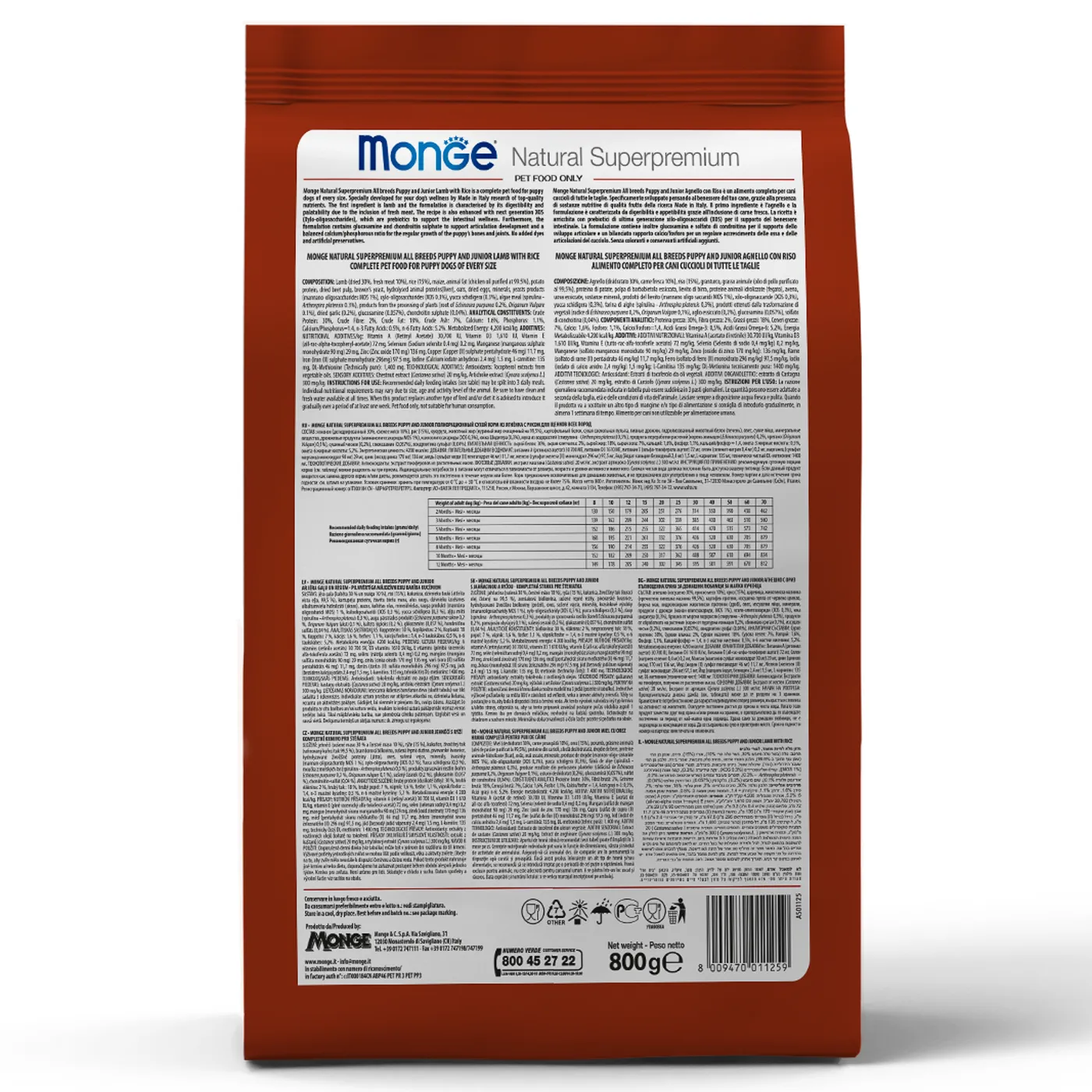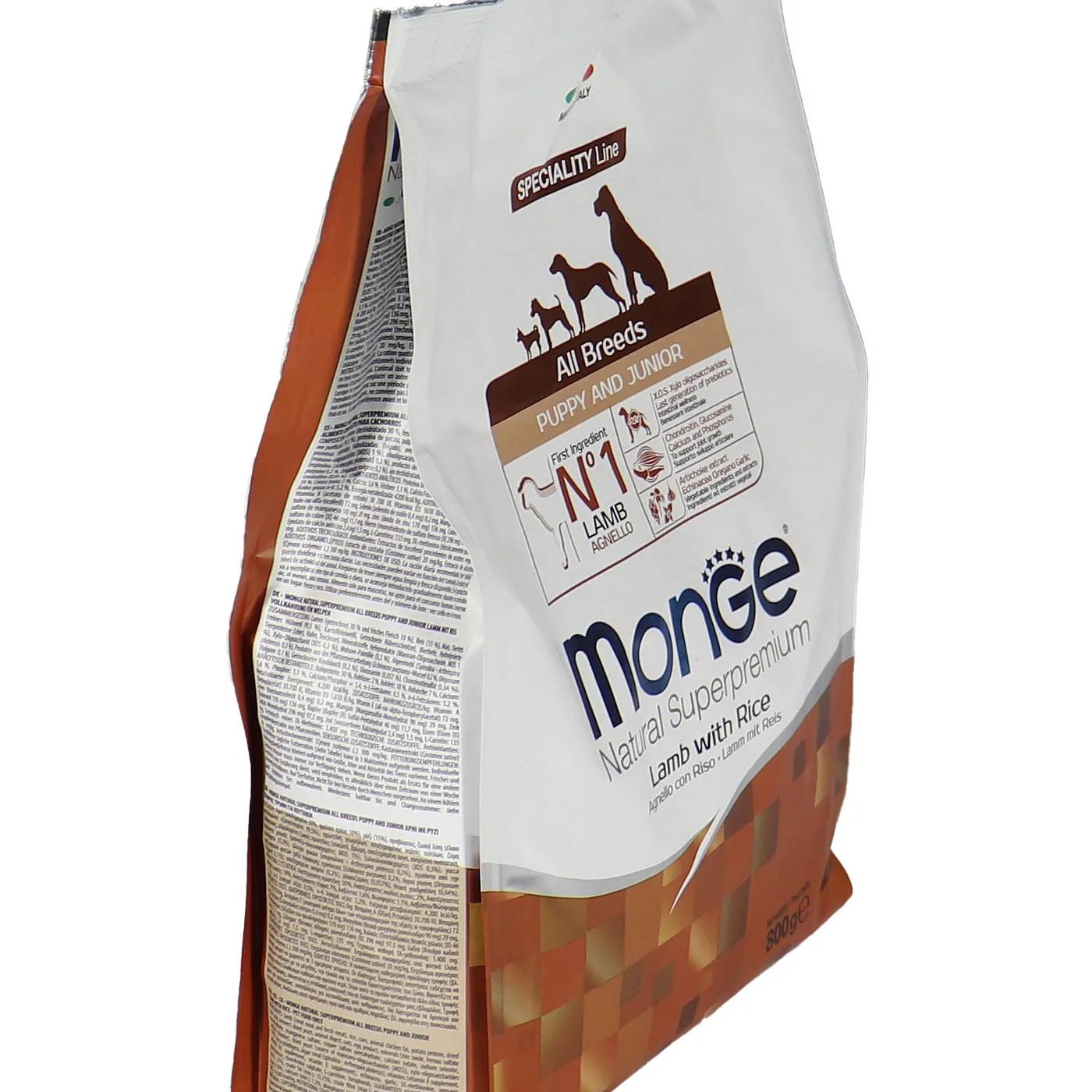 Сухой корм Monge Dog Speciality Line Puppy&Junior предназначен для ежедневного кормления щенков всех пород в возрасте от 1 до 12 месяцев. Основу рациона составляет дегидрированное и свежее мясо ягненка в сочетании с рисом. Формула включает пребиотики MOS и XOS для поддержания баланса кишечной микрофлоры, а также комплекс глюкозамина и хондроитина для здоровья суставов в период роста. В составе присутствуют растительные экстракты, такие как артишок, эхинацея, орегано и чеснок. Корм не содержит искусственных красителей, ароматизаторов и ГМО.