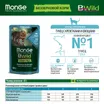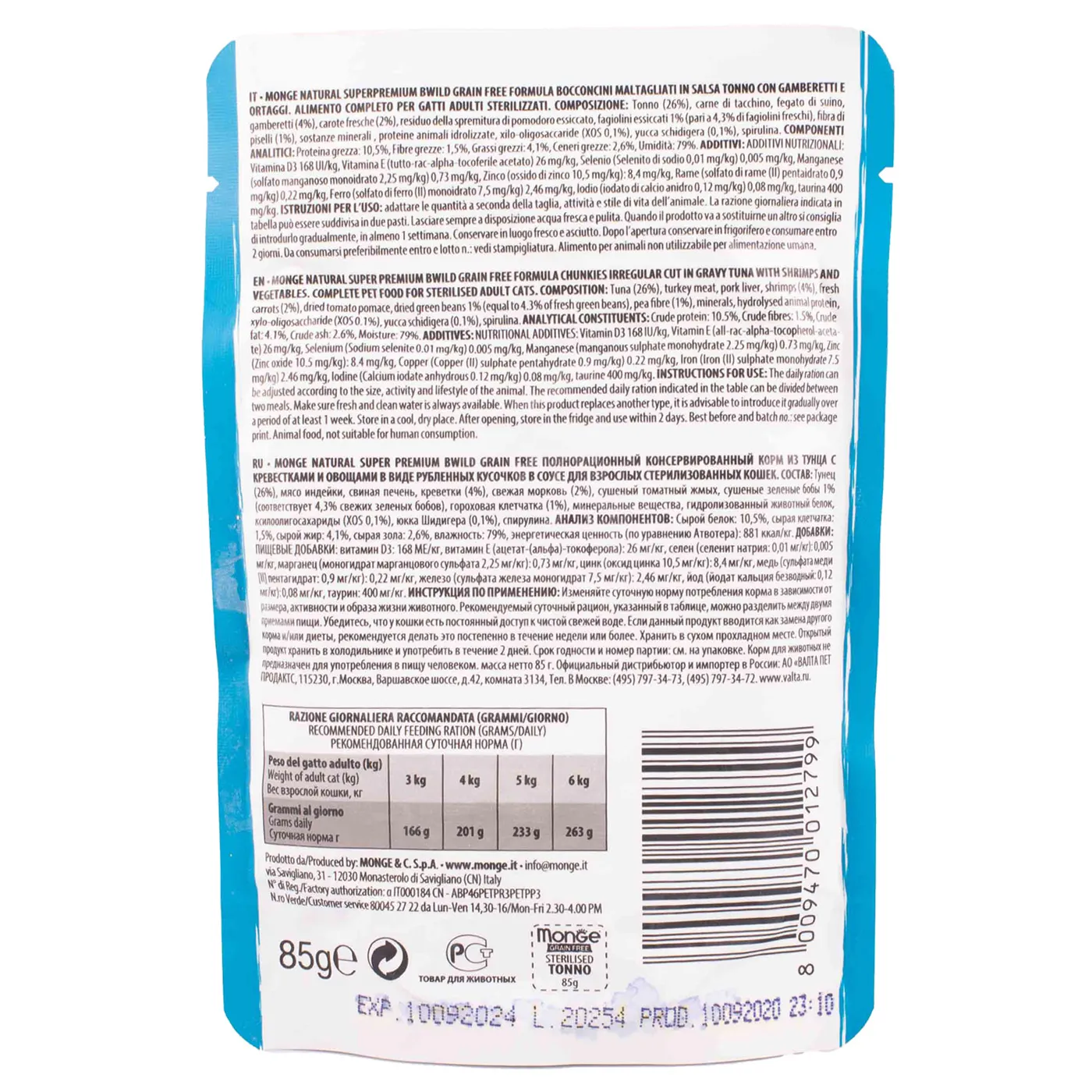 Полнорационный влажный корм Monge Cat BWild GRAIN FREE для стерилизованных кошек. Рецепт на основе тунца (26%) с добавлением креветок (4%), мяса индейки и свиной печени. Содержит овощи: морковь и зеленую фасоль. Формула разработана с учетом особенностей обмена веществ стерилизованных животных. В состав включена пребиотическая клетчатка X.O.S. (0,1%) для поддержания баланса микрофлоры кишечника и юкка Шидигера (0,1%). Корм не содержит зерна, ГМО, искусственных красителей и ароматизаторов. Произведен в Италии.