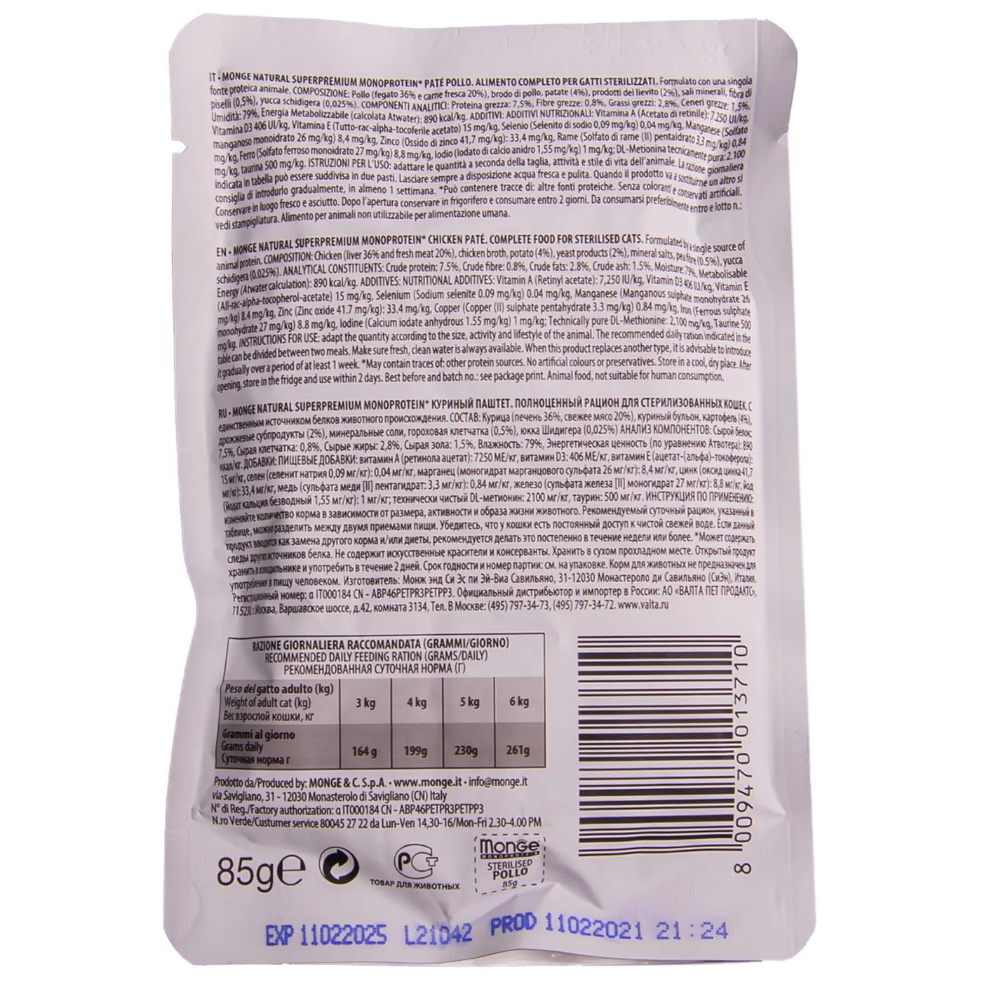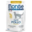 Monge Cat Monoprotein — полнорационный влажный корм для стерилизованных кошек и кастрированных котов. Рецепт содержит один источник животного белка — курицу, и один источник углеводов — картофель. Корм не содержит зерна, ГМО, искусственных красителей и ароматизаторов. Произведен в Италии.