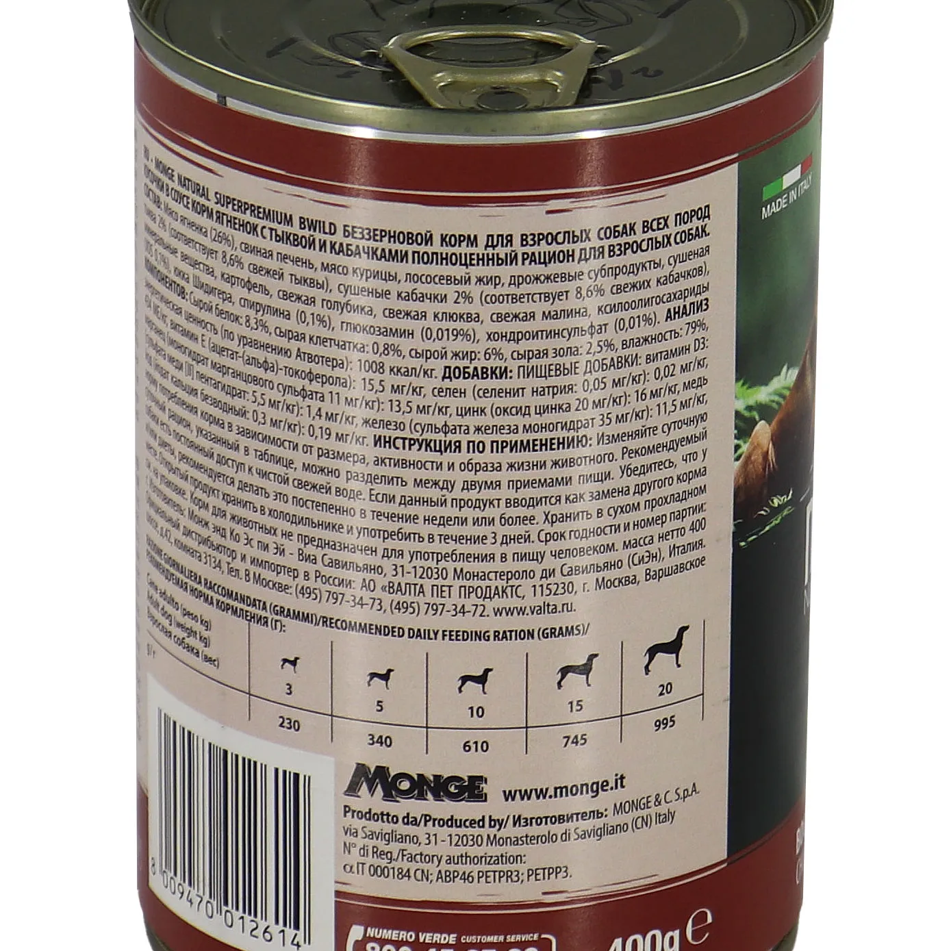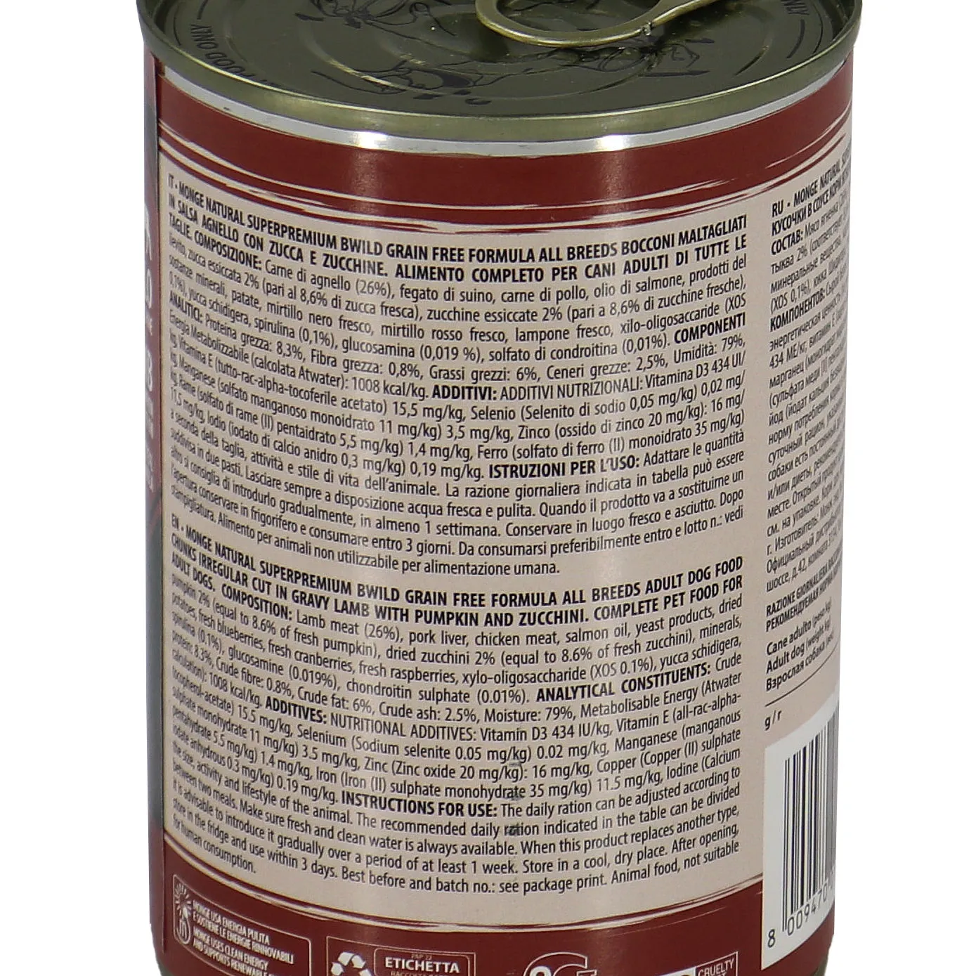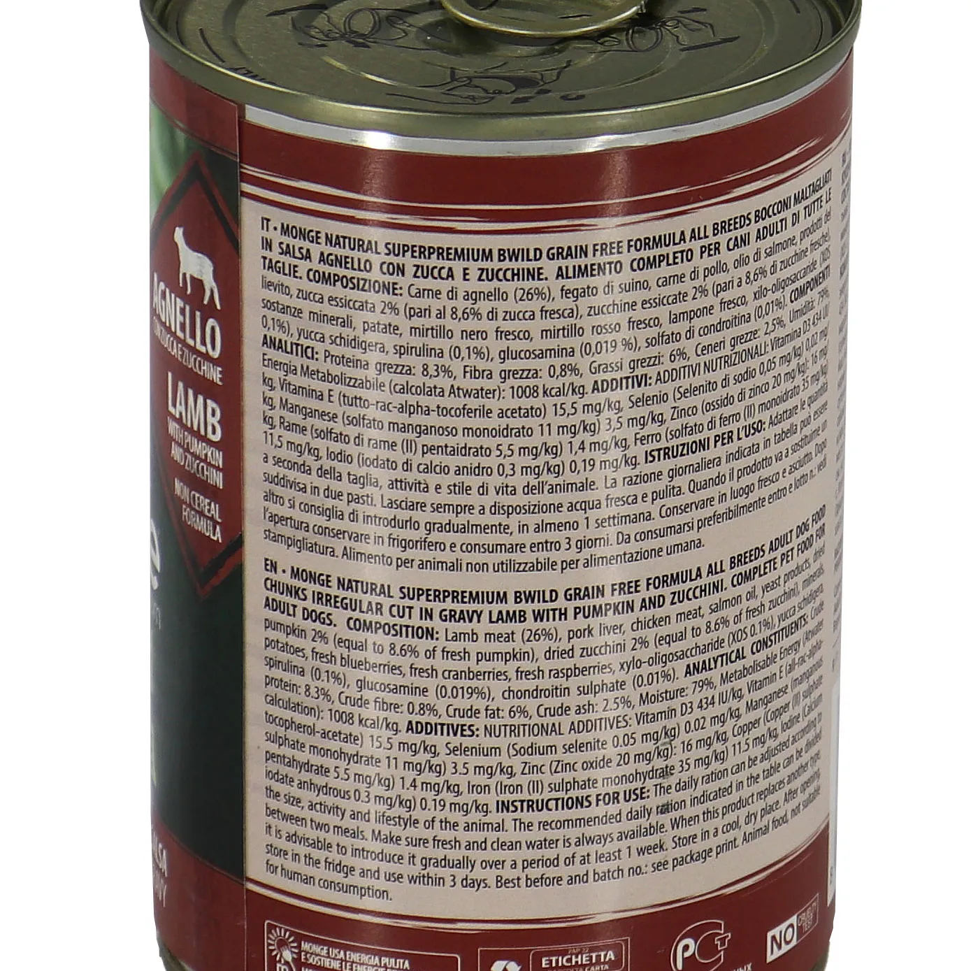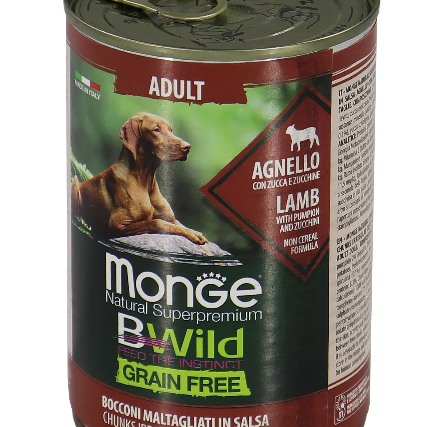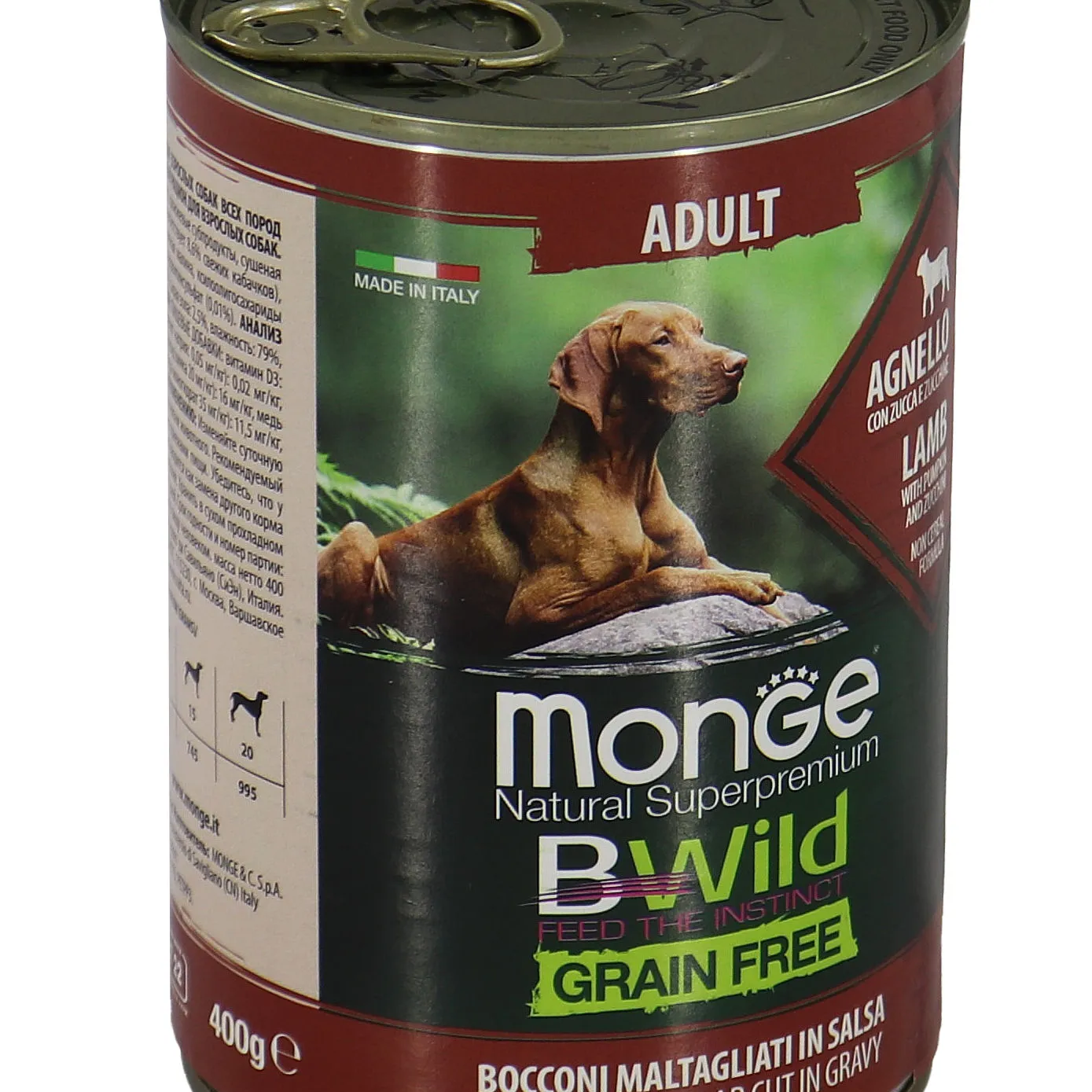 Влажный корм Monge Dog BWild GRAIN FREE — полнорационный беззерновой рацион для взрослых собак. Основной источник белка — мясо ягненка (26%), дополненное свиной печенью и куриным мясом. В состав включены альтернативные источники углеводов: тыква и кабачки. Формула содержит пребиотическую клетчатку X.O.S. для поддержания баланса микрофлоры кишечника, а также глюкозамин и хондроитин для здоровья суставов. Корм не содержит зерна, ГМО, искусственных красителей и ароматизаторов.