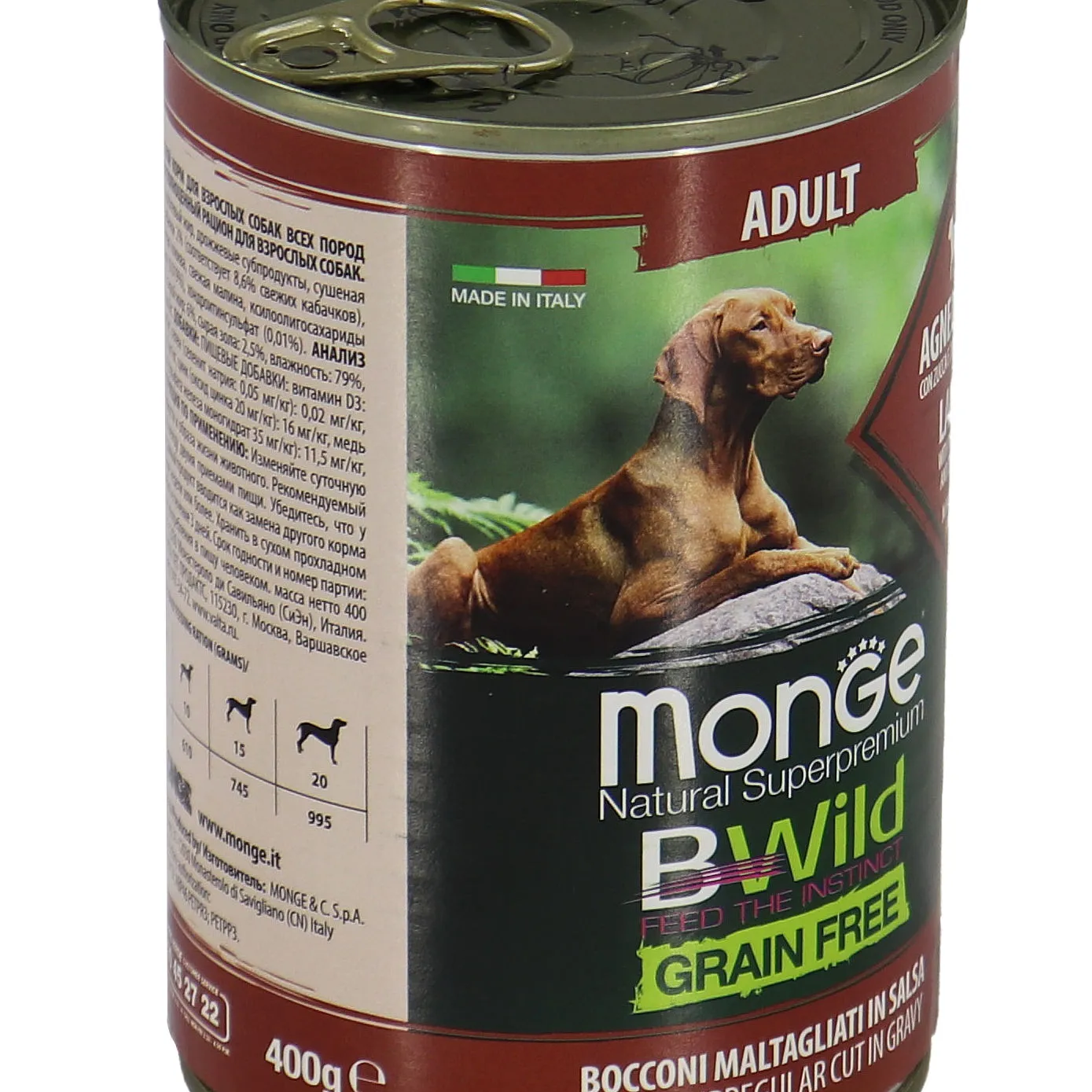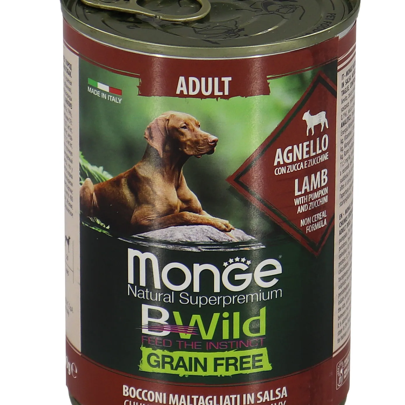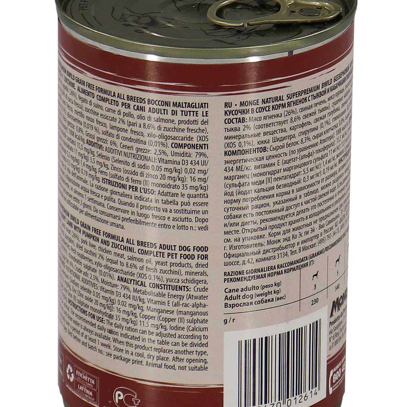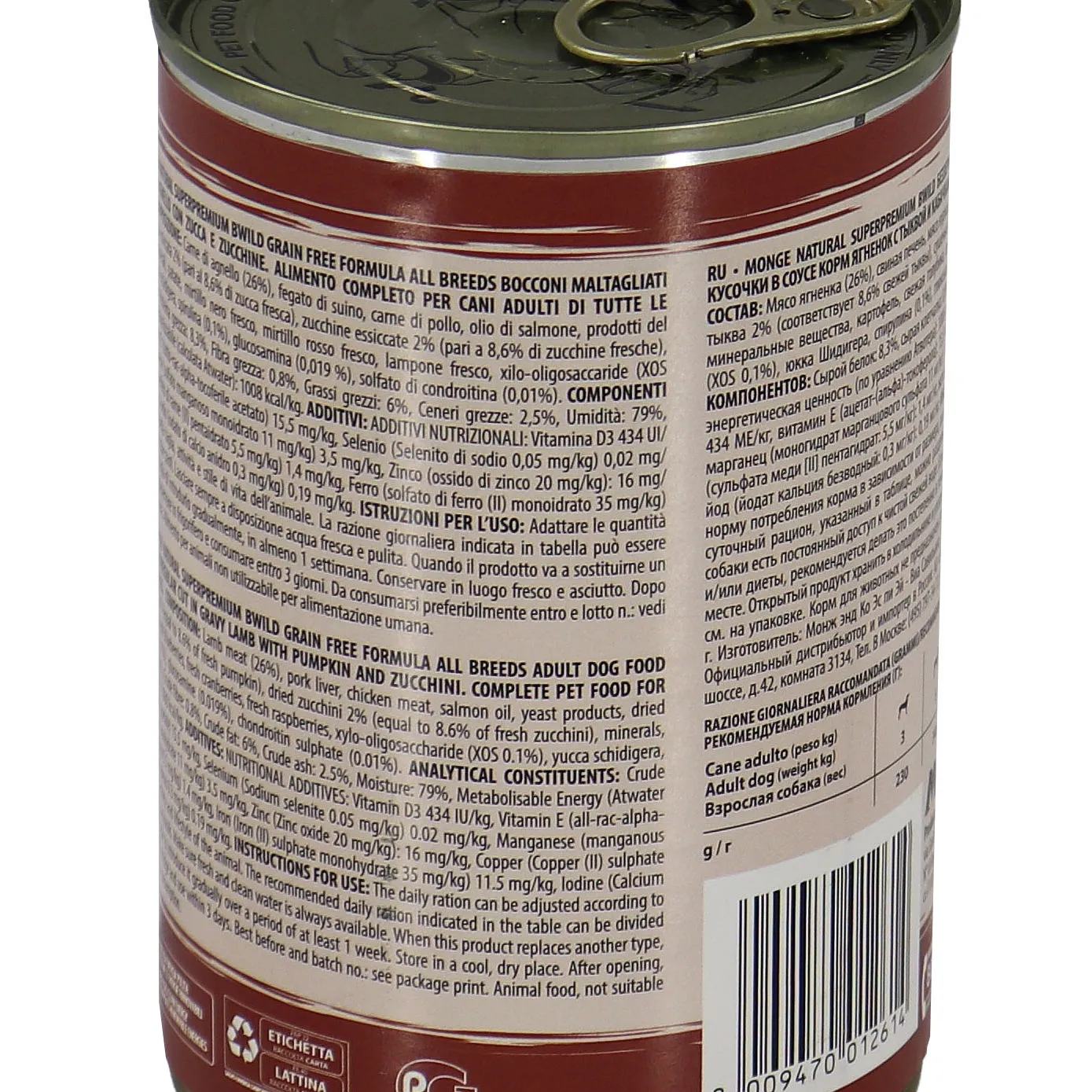 Влажный корм Monge Dog BWild GRAIN FREE — полнорационный беззерновой рацион для взрослых собак. Основной источник белка — мясо ягненка (26%), дополненное свиной печенью и куриным мясом. В состав включены альтернативные источники углеводов: тыква и кабачки. Формула содержит пребиотическую клетчатку X.O.S. для поддержания баланса микрофлоры кишечника, а также глюкозамин и хондроитин для здоровья суставов. Корм не содержит зерна, ГМО, искусственных красителей и ароматизаторов.