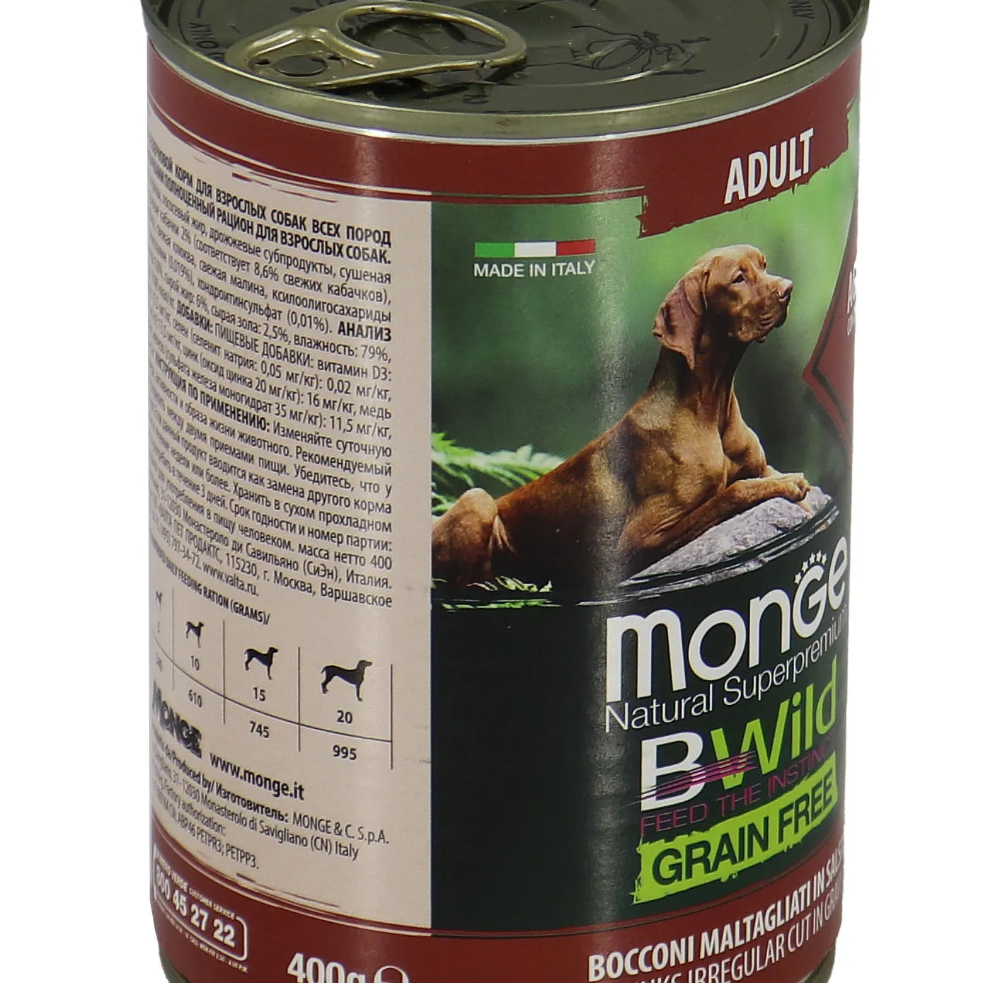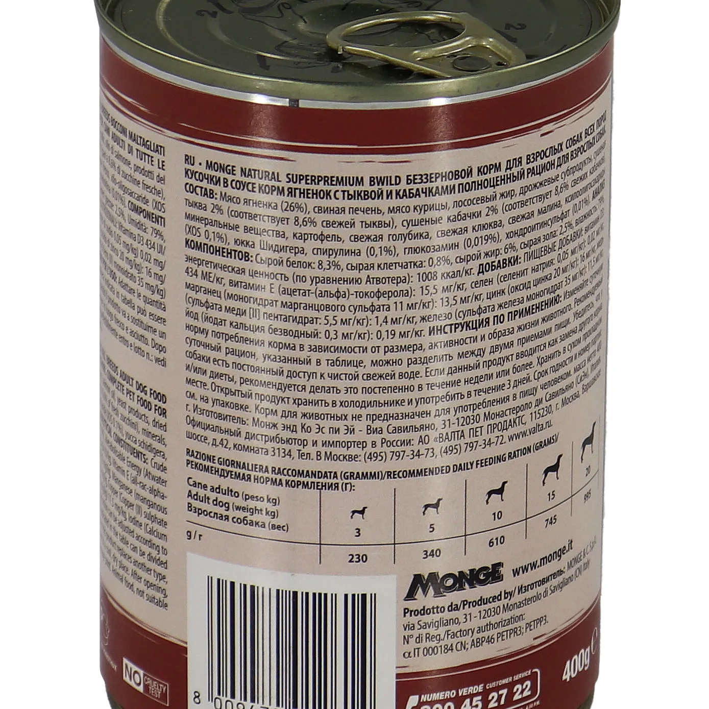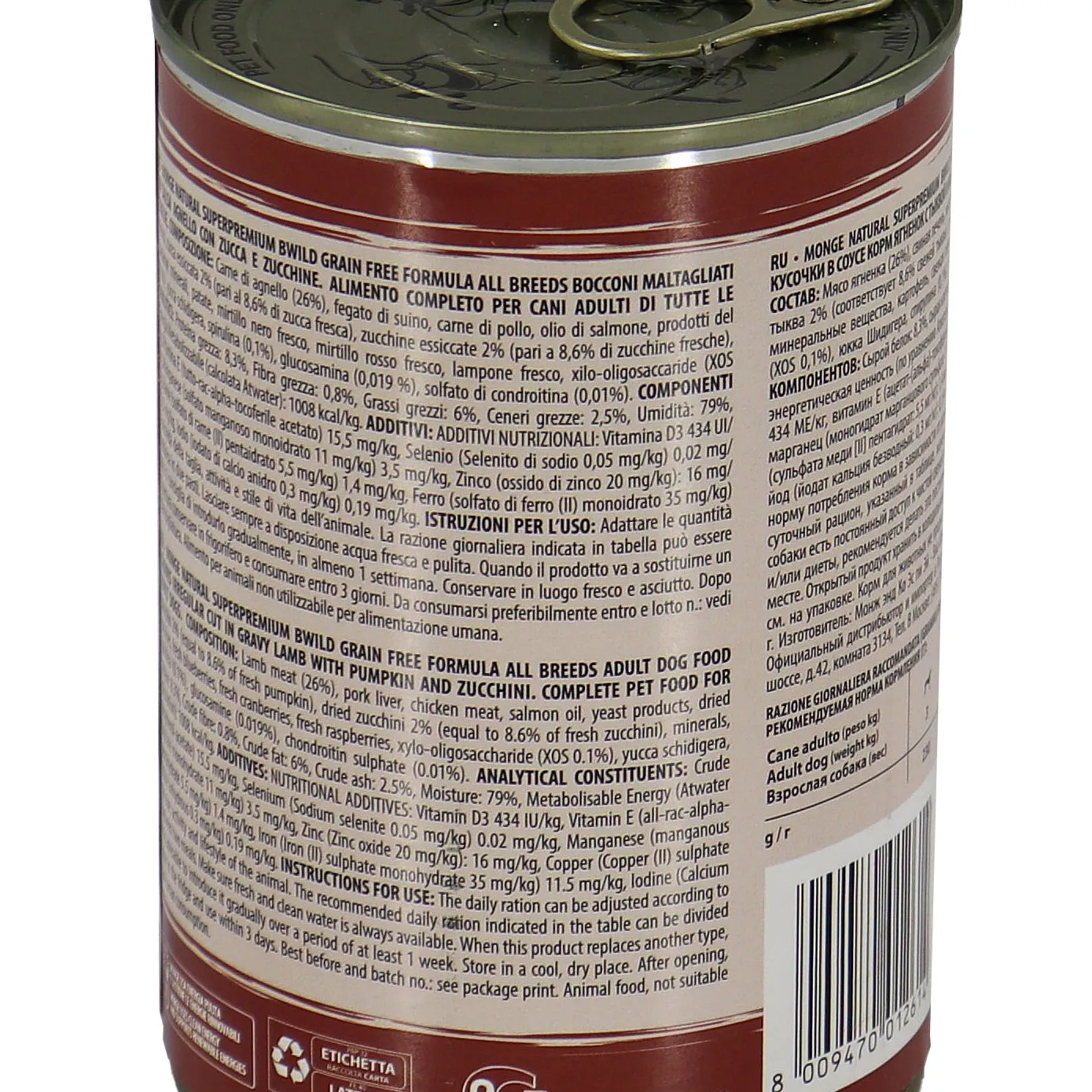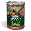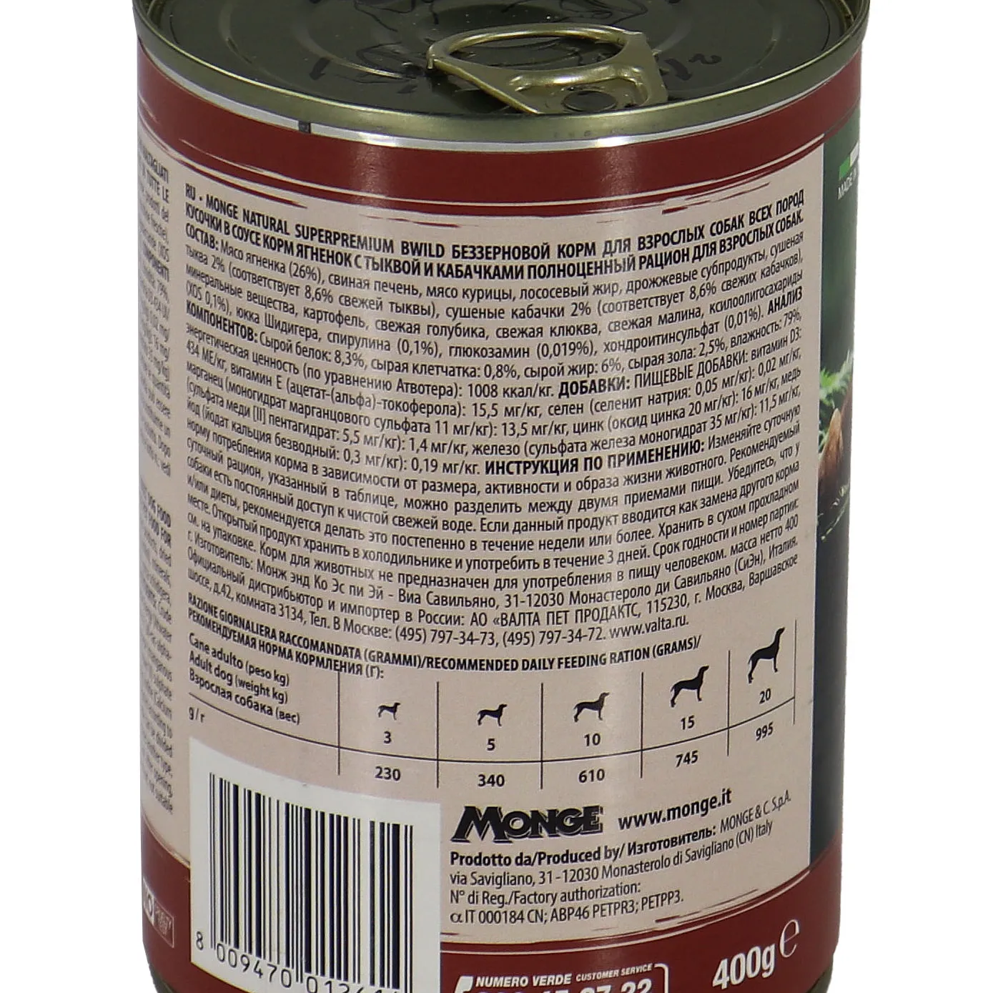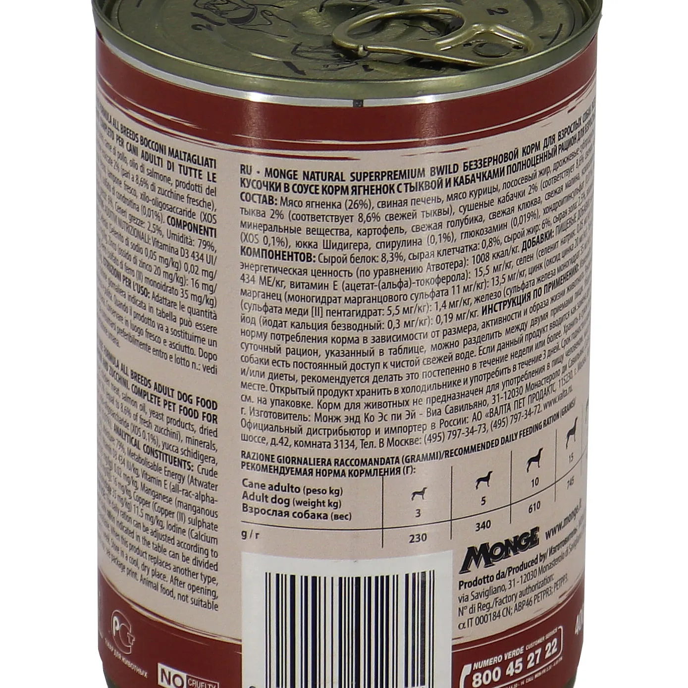 Влажный корм Monge Dog BWild GRAIN FREE — полнорационный беззерновой рацион для взрослых собак. Основной источник белка — мясо ягненка (26%), дополненное свиной печенью и куриным мясом. В состав включены альтернативные источники углеводов: тыква и кабачки. Формула содержит пребиотическую клетчатку X.O.S. для поддержания баланса микрофлоры кишечника, а также глюкозамин и хондроитин для здоровья суставов. Корм не содержит зерна, ГМО, искусственных красителей и ароматизаторов.
