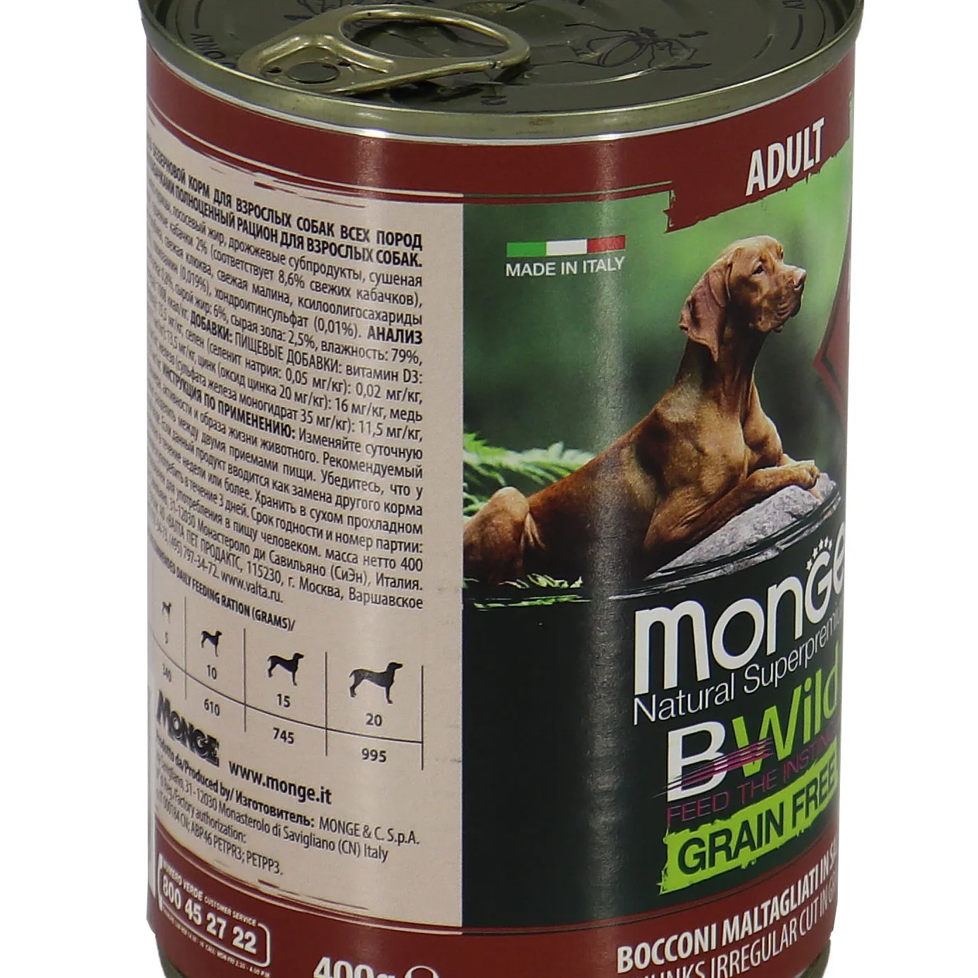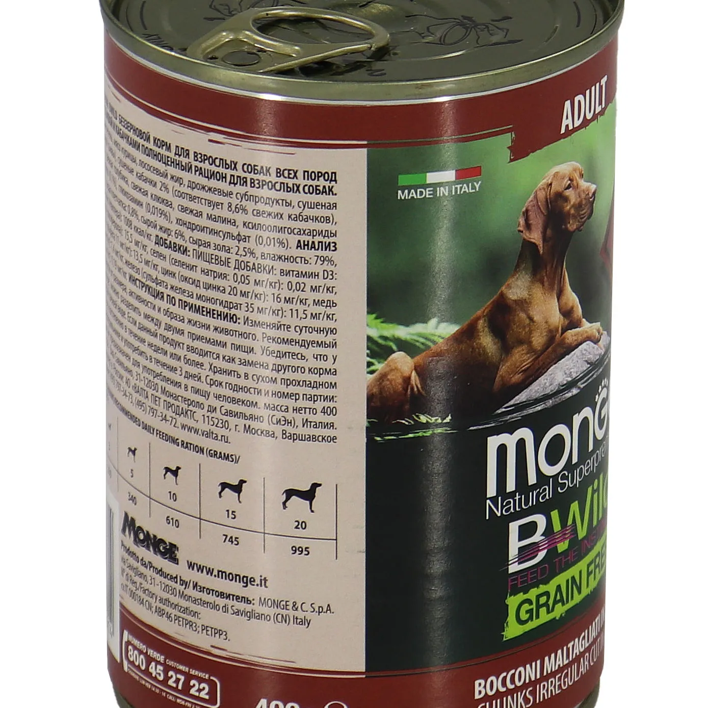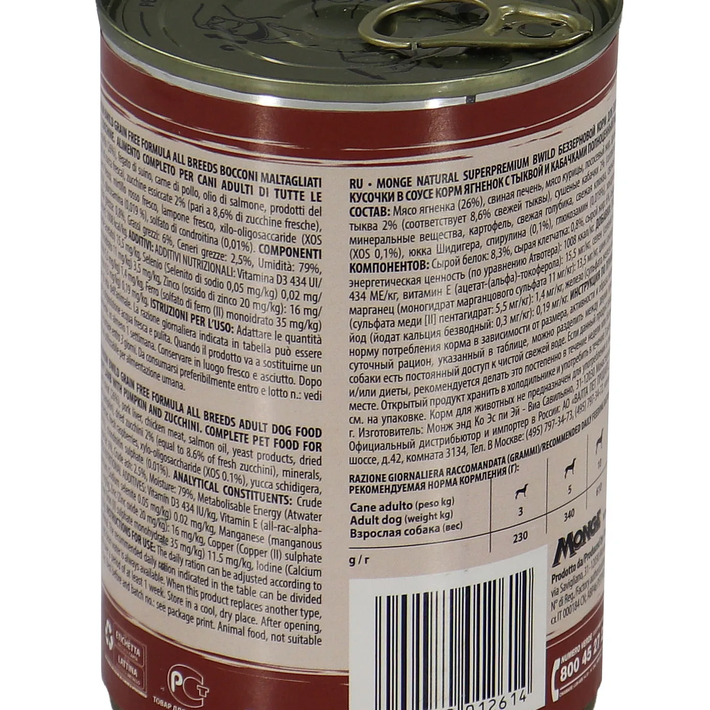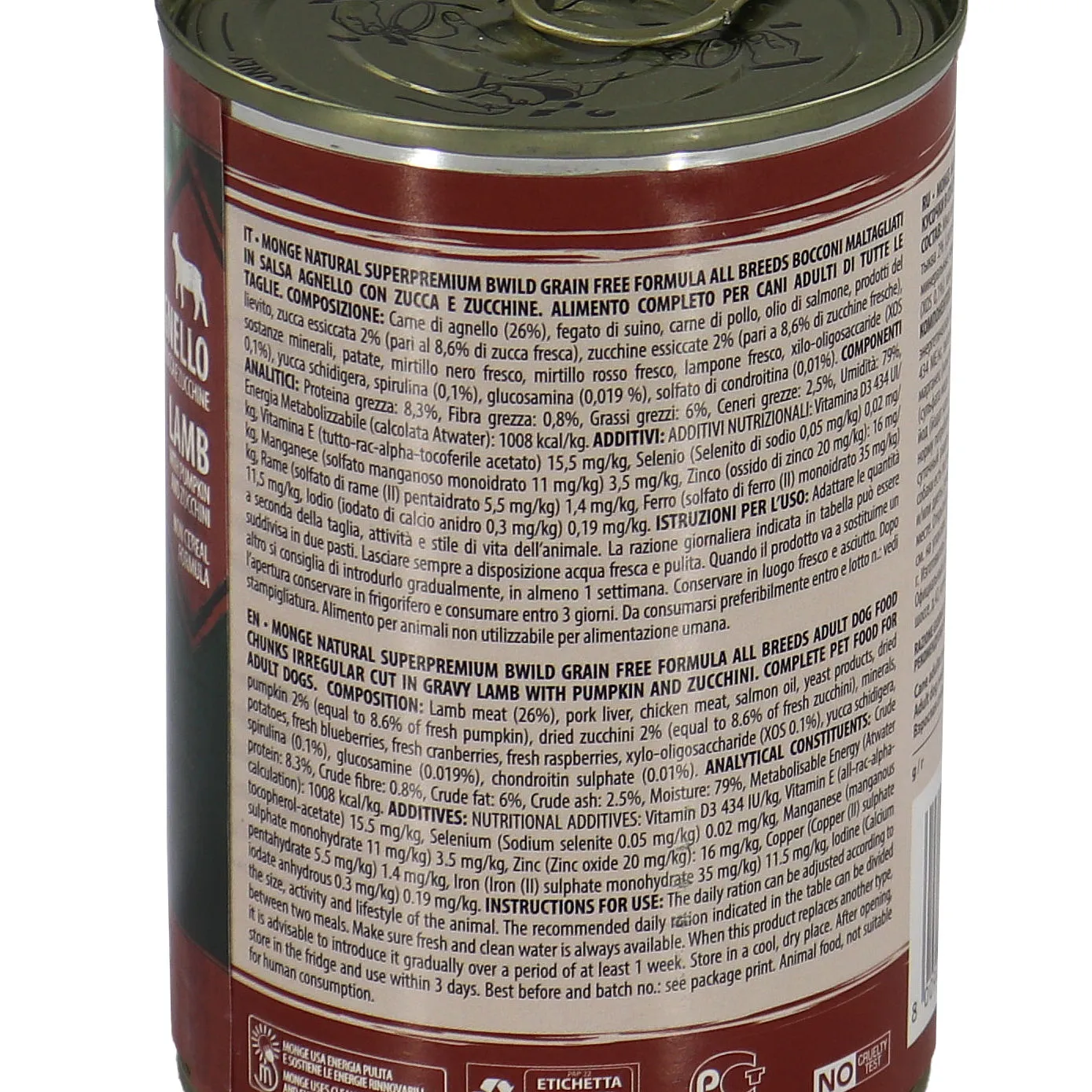 Влажный корм Monge Dog BWild GRAIN FREE — полнорационный беззерновой рацион для взрослых собак. Основной источник белка — мясо ягненка (26%), дополненное свиной печенью и куриным мясом. В состав включены альтернативные источники углеводов: тыква и кабачки. Формула содержит пребиотическую клетчатку X.O.S. для поддержания баланса микрофлоры кишечника, а также глюкозамин и хондроитин для здоровья суставов. Корм не содержит зерна, ГМО, искусственных красителей и ароматизаторов.
