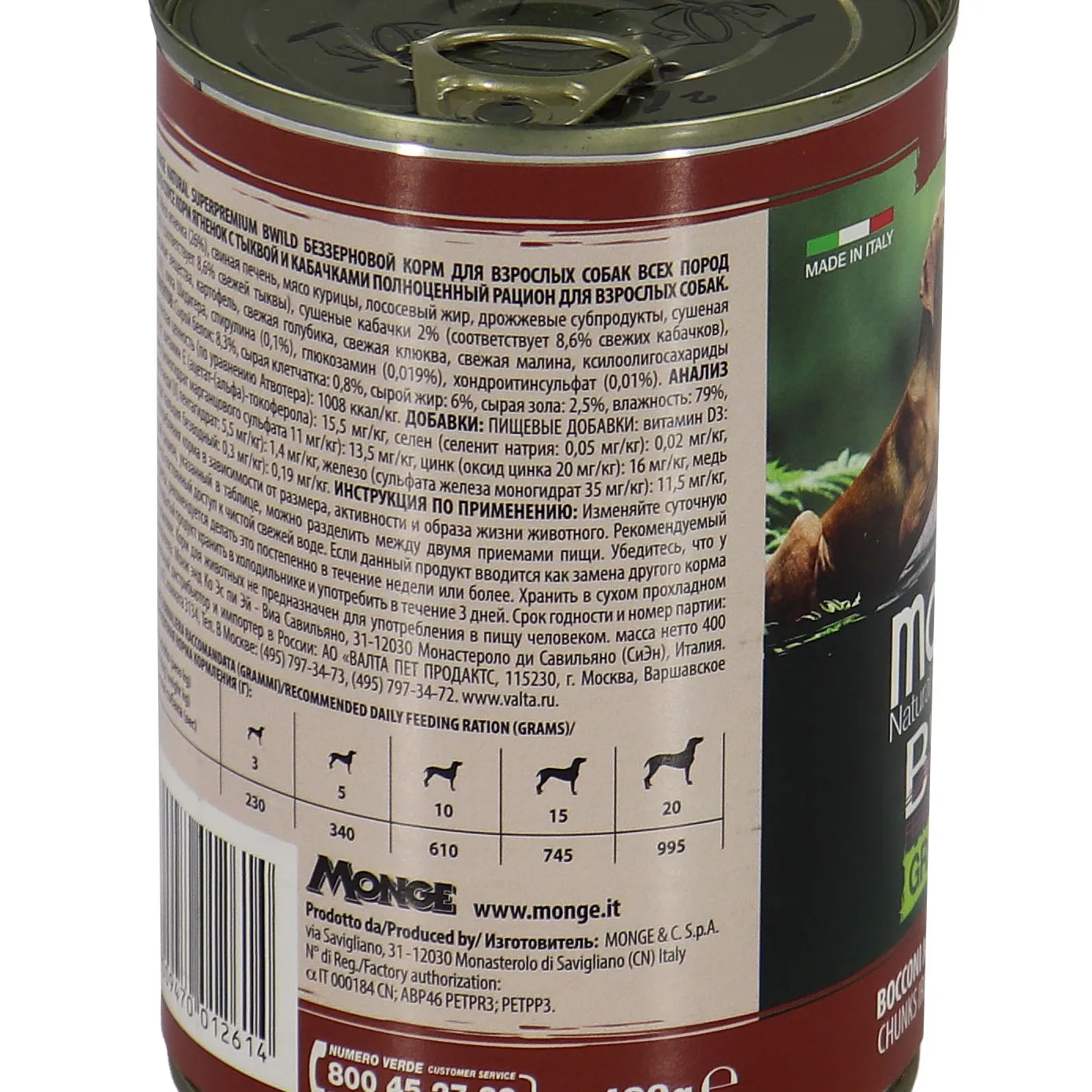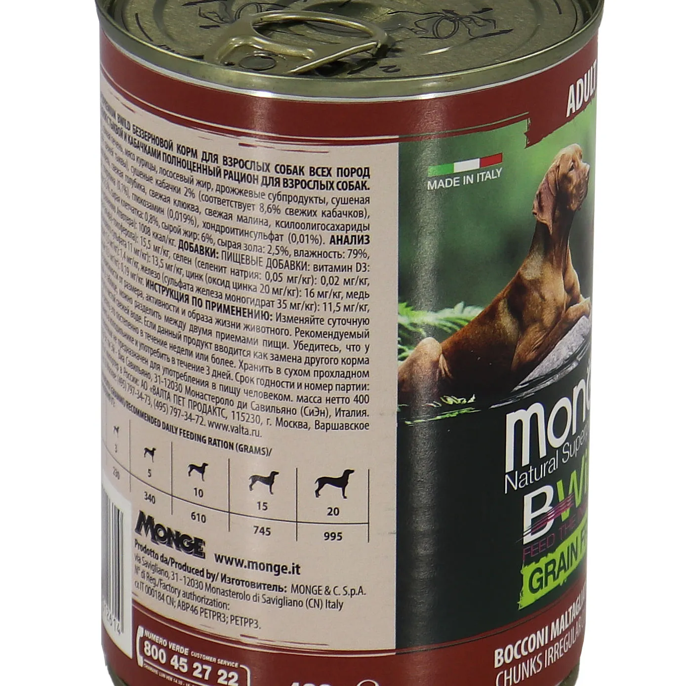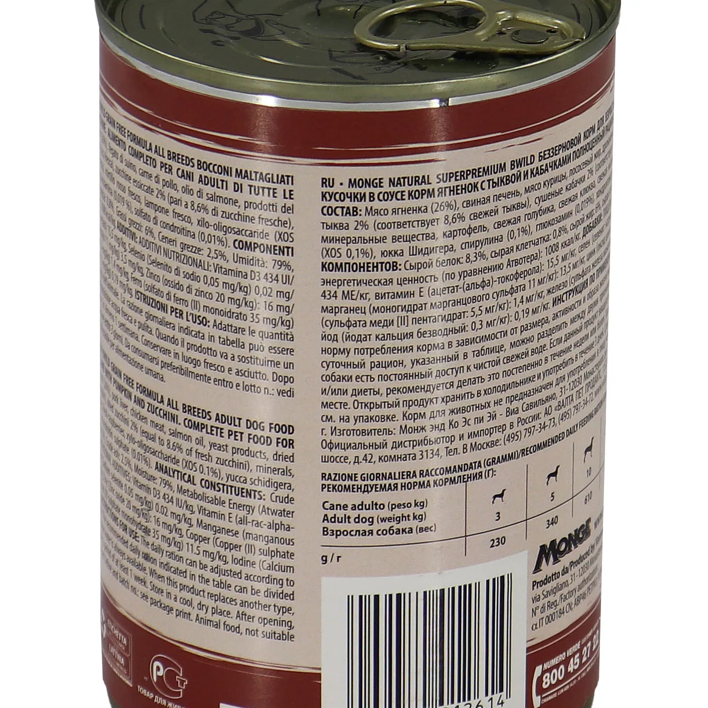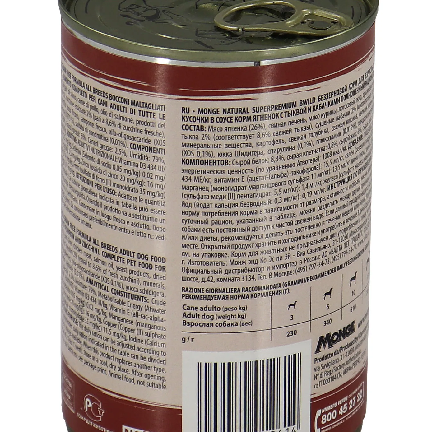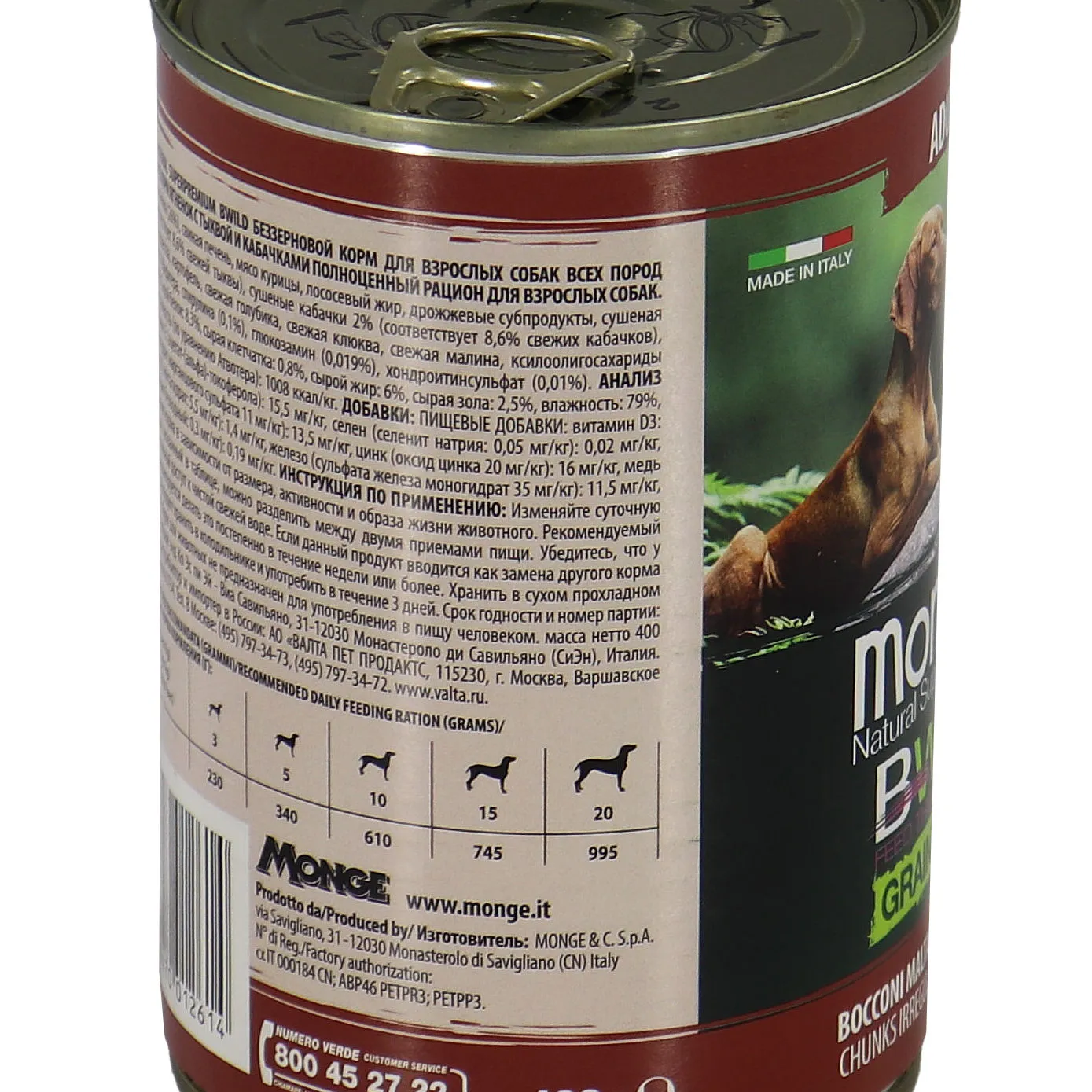 Влажный корм Monge Dog BWild GRAIN FREE — полнорационный беззерновой рацион для взрослых собак. Основной источник белка — мясо ягненка (26%), дополненное свиной печенью и куриным мясом. В состав включены альтернативные источники углеводов: тыква и кабачки. Формула содержит пребиотическую клетчатку X.O.S. для поддержания баланса микрофлоры кишечника, а также глюкозамин и хондроитин для здоровья суставов. Корм не содержит зерна, ГМО, искусственных красителей и ароматизаторов.