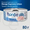 Влажный корм Monge Supreme Kitten для котят. Основные ингредиенты — тунец (50%) и дорадо (5%). Формула обогащена фруктоолигосахаридами (F.O.S.) и витамином Е. Корм не содержит искусственных красителей, ароматизаторов и ГМО. Предназначен для котят в возрасте до 1 года.